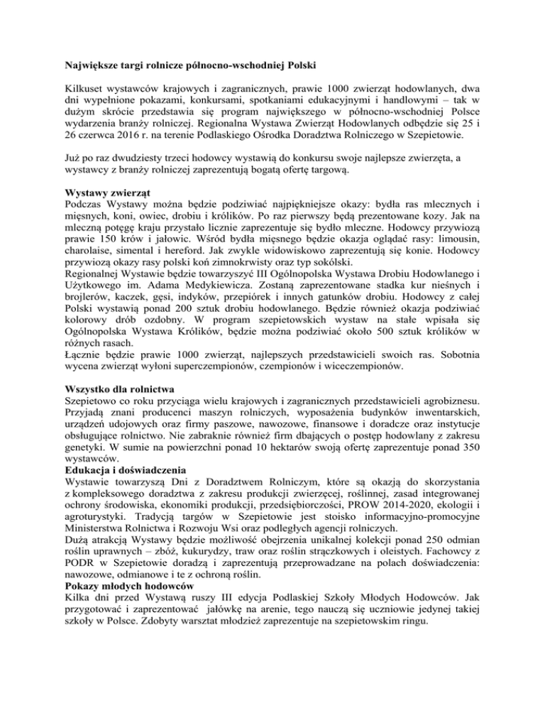 Największe targi rolnicze północno-wschodniej Polski Kilkuset wystawców krajowych i zagranicznych, prawie 1000 zwierząt hodowlanych, dwa dni wypełnione pokazami, konkursami, spotkaniami edukacyjnymi i handlowymi – tak w dużym skrócie przedstawia się program największego w północno-wschodniej Polsce wydarzenia branży rolniczej. Regionalna Wystawa Zwierząt Hodowlanych odbędzie się 25 i 26 czerwca 2016 r. na terenie Podlaskiego Ośrodka Doradztwa Rolniczego w Szepietowie. Już po raz dwudziesty trzeci hodowcy wystawią do konkursu swoje najlepsze zwierzęta, a wystawcy z branży rolniczej zaprezentują bogatą ofertę targową. Wystawy zwierząt Podczas Wystawy można będzie podziwiać najpiękniejsze okazy: bydła ras mlecznych i mięsnych, koni, owiec, drobiu i królików. Po raz pierwszy będą prezentowane kozy. Jak na mleczną potęgę kraju przystało licznie zaprezentuje się bydło mleczne. Hodowcy przywiozą prawie 150 krów i jałowic. Wśród bydła mięsnego będzie okazja oglądać rasy: limousin, charolaise, simental i hereford. Jak zwykle widowiskowo zaprezentują się konie. Hodowcy przywiozą okazy rasy polski koń zimnokrwisty oraz typ sokólski. Regionalnej Wystawie będzie towarzyszyć III Ogólnopolska Wystawa Drobiu Hodowlanego i Użytkowego im. Adama Medykiewicza. Zostaną zaprezentowane stadka kur nieśnych i brojlerów, kaczek, gęsi, indyków, przepiórek i innych gatunków drobiu. Hodowcy z całej Polski wystawią ponad 200 sztuk drobiu hodowlanego. Będzie również okazja podziwiać kolorowy drób ozdobny. W program szepietowskich wystaw na stałe wpisała się Ogólnopolska Wystawa Królików, będzie można podziwiać około 500 sztuk królików w różnych rasach. Łącznie będzie prawie 1000 zwierząt, najlepszych przedstawicieli swoich ras. Sobotnia wycena zwierząt wyłoni superczempionów, czempionów i wiceczempionów. Wszystko dla rolnictwa Szepietowo co roku przyciąga wielu krajowych i zagranicznych przedstawicieli agrobiznesu. Przyjadą znani producenci maszyn rolniczych, wyposażenia budynków inwentarskich, urządzeń udojowych oraz firmy paszowe, nawozowe, finansowe i doradcze oraz instytucje obsługujące rolnictwo. Nie zabraknie również firm dbających o postęp hodowlany z zakresu genetyki. W sumie na powierzchni ponad 10 hektarów swoją ofertę zaprezentuje ponad 350 wystawców. Edukacja i doświadczenia Wystawie towarzyszą Dni z Doradztwem Rolniczym, które są okazją do skorzystania z kompleksowego doradztwa z zakresu produkcji zwierzęcej, roślinnej, zasad integrowanej ochrony środowiska, ekonomiki produkcji, przedsiębiorczości, PROW 2014-2020, ekologii i agroturystyki. Tradycją targów w Szepietowie jest stoisko informacyjno-promocyjne Ministerstwa Rolnictwa i Rozwoju Wsi oraz podległych agencji rolniczych. Dużą atrakcją Wystawy będzie możliwość obejrzenia unikalnej kolekcji ponad 250 odmian roślin uprawnych – zbóż, kukurydzy, traw oraz roślin strączkowych i oleistych. Fachowcy z PODR w Szepietowie doradzą i zaprezentują przeprowadzane na polach doświadczenia: nawozowe, odmianowe i te z ochroną roślin. Pokazy młodych hodowców Kilka dni przed Wystawą ruszy III edycja Podlaskiej Szkoły Młodych Hodowców. Jak przygotować i zaprezentować jałówkę na arenie, tego nauczą się uczniowie jedynej takiej szkoły w Polsce. Zdobyty warsztat młodzież zaprezentuje na szepietowskim ringu. Stałym akcentem programu będzie konkurs dla najmłodszych hodowców. Dzieci w przedziale wiekowym 8-10 lat zaprezentują się z hodowlanymi „pupilami”. Zapraszamy do obejrzenia dokonań młodych hodowców już 26 czerwca. W programie również: Ekspozycja maszyn i urządzeń do produkcji rolniczej Prezentacje drobnego inwentarza i lokalnych ras zwierząt Zwiedzanie pół doświadczalnych i demonstracyjnych Centralne stoisko informacyjno - promocyjne MRiRW oraz podległych agencji Piknik wieprzowy (Podlaska Izba Rolnicza) Promocja wołowiny i jagnięciny Doradztwo rolnicze Pokaz techniczny tłoczenia i estryfikacji oleju rzepakowego Konkursy i występy zespołów artystycznych Stoiska twórców ludowych Park zabaw dla dzieci Zapraszamy 25 i 26 czerwca na największą w regionie imprezę rolniczą – Regionalną Wystawę Zwierząt Hodowlanych i Dni z Doradztwem Rolniczym - Agroarena w Szepietowie. Marlena Zaremba PODR Szepietowo Patronat: Minister Rolnictwa i Rozwoju Wsi Wojewoda Podlaski Marszałek Województwa Podlaskiego Prezes Krajowej Rady Izb Rolniczych Prezes Agencji Restrukturyzacji i Modernizacji Rolnictwa Prezes Agencji Rynku Rolnego Prezes Agencji Nieruchomości Rolnych Prezydent Polskiej Federacji Hodowców Bydła i Producentów Mleka Prezes Kasy Rolniczego Ubezpieczenia Społecznego PROGRAM XXIII Regionalnej Wystawy Zwierząt Hodowlanych Piątek - 24 czerwca 2016 r. Ring 15.00 Finał III Podlaskiej Szkoły Młodych Hodowców Sobota - 25 czerwca 2016 r. Ring 8.00-13.00 12.30 13.00 13.30 14.00 Wycena bydła mlecznego i mięsnego, koni, owiec, drobiu i królików rasowych Wybór superczempionów Uroczyste Otwarcie Ogłoszenie wyników wyceny bydła mlecznego, mięsnego, koni, owiec, drobiu i królików rasowych Rozstrzygnięcie plebiscytu Gazety Współczesnej – Rolnik Roku i Nasz Sołtys Wręczanie nagród przez samorządy, sponsorów i firmy Niedziela - 26 czerwca 2016 r. Ołtarz polowy przed budynkiem zakładowym 9.00 Msza Święta Polowa Ring Powitanie gości Prezentacja zwierząt – superczempionów, czempionów oraz wręczanie pucharów i nagród hodowcom 13.00 Pokaz Podlaskiej Szkoły Młodych Hodowców 13.20 Konkurs „Młodzi hodowcy” 13.50 Wystąpienia okolicznościowe 14.00 Prezentacja zwycięzców konkursów: „Hit Wystawy”, „Najatrakcyjniejsze Stoisko”, „Hit publiczności” 16.00 Oficjalne zamknięcie Wystawy Tereny wystawowe 10.30 11.00 8.00-16.00 Ekspozycja targowa maszyn, urządzeń i środków do produkcji rolniczej