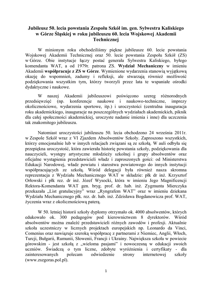 Jubileusz 50. lecia powstania Zespołu Szkół im. gen. Sylwestra Kaliskiego w Górze Śląskiej w roku jubileuszu 60. lecia Wojskowej Akademii Technicznej W minionym roku obchodziliśmy piękne jubileusze 60. lecie powstania Wojskowej Akademii Technicznej oraz 50. lecie powstania Zespołu Szkół (ZS) w Górze. Obie instytucje łączy postać generała Sylwestra Kaliskiego, byłego komendanta WAT, a od 1979r. patrona ZS. Wydział Mechaniczny w imieniu Akademii współpracuje z ZS w Górze. Wymienione wydarzenia stanowią wyjątkową okazję do wspomnień, zadumy i refleksji, ale stwarzają również możliwość podziękowania wszystkim tym, którzy tworzyli przez lata te wspaniałe ośrodki dydaktyczne i naukowe. W naszej Akademii jubileuszowi poświęcono szereg różnorodnych przedsięwzięć (np. konferencje naukowe i naukowo-techniczne, imprezy okolicznościowe, wydarzenia sportowe, itp.) i uroczystości (centralna inauguracja roku akademickiego, inauguracje na poszczególnych wydziałach akademickich, piknik dla całej społeczności akademickiej, uroczyste nadanie imienia i inne) dla uczczenia tak znakomitego jubileuszu. Natomiast uroczystości jubileuszu 50. lecia obchodzono 24 września 2011r. w Zespole Szkół wraz z VI Zjazdem Absolwentów Szkoły. Zaproszono wszystkich, którzy emocjonalnie lub w innych relacjach związani są ze szkołą. W auli odbyła się przepiękna uroczystość, która zawierała historię powstania szkoły, podziękowania dla nauczycieli, występy artystyczne młodzieży szkolnej i grupy absolwentów oraz oficjalne wystąpienia przedstawicieli władz i zaproszonych gości: od Ministerstwa Edukacji Narodowej, władz powiatu i starostwa powiatowego do innych instytucji współpracujących ze szkołą. Wśród delegacji była również nasza skromna reprezentacja z Wydziału Mechanicznego WAT w składzie: płk dr inż. Krzysztof Orłowski i płk rez. dr inż. Józef Wysocki, która w imieniu Jego Magnificencji Rektora-Komendanta WAT gen. bryg. prof. dr. hab. inż. Zygmunta Mierczyka przekazała „List gratulacyjny” wraz „Ryngrafem WAT” oraz w imieniu dziekana Wydziału Mechanicznego płk. rez. dr. hab. inż. Zdzisława Bogdanowicza prof. WAT, życzenia wraz z okolicznościową paterą. W 50. letniej historii szkoły dyplomy otrzymało ok. 4000 absolwentów, których edukowało ok. 300 pedagogów pod kierownictwem 8 dyrektorów. Wśród absolwentów można znaleźć przedstawicieli różnych zawodów i profesji. Aktualnie szkoła uczestniczy w licznych projektach europejskich np. Leonardo da Vinci, Comenius oraz nawiązuje szeroką współpracę z partnerami z Niemiec, Anglii, Włoch, Turcji, Bułgarii, Rumunii, Słowenii, Francji i Ukrainy. Największa szkoła w powiecie górowskim - jest szkołą z „wieloma pasjami” i nowoczesną w edukacji swoich uczniów. Świadczą o tym liczne, zdobyte wyróżnienia i certyfikaty - dla zainteresowanych polecam odwiedzenie strony internetowej szkoły (www.zszgoras.pol.pl). 1 Innym, bardzo ważnym wydarzeniem w naszych kontaktach, była wizyta w dniu 7 października 2011r. delegacji szkoły: mgr Teresy Frąckiewicz (dyrektor ZS w Górze) i mgr. Dariusza Lisieckiego (zastępca dyrektora) na 61. uroczystej inauguracji roku akademickiego 2011/2012 w Wydziale Mechanicznym. Podczas tej uroczystości Pani mgr inż. Teresa Frączkiewicz została wyróżniona pamiątkowym medalem „Za Zasługi dla Wydziału Mechanicznego”. Medal wręczył dziekan Wydziału Mechanicznego dr hab. inż. Zdzisław Bogdanowicz - profesor WAT. Serdeczne gratulacje złożyli również: J.M. Rektor–Komendant gen. bryg. prof. dr hab. inż. Zygmunt Mierczyk, kanclerz Akademii gen. dyw. Jan Klejszmit, pełnomocnik rektora ds. studenckich dr inż. Wojciech Kocańda, zastępca dziekana Wydziału Mechanicznego płk dr inż. Krzysztof Orłowski, prodziekan ds. kształcenia dr hab. Julian Maj - profesor WAT oraz towarzyszące osoby. Józef Wysocki Delegacja WME podczas uroczystości jubileuszu 50.lecia ZS w Górze (od lewej: T. Frączkiewicz - dyr. szkoły; płk K. Orłowski – z-ca dziekana WME; dr inż. J. Wysocki) Wystąpienie płk. K. Orłowskiego z życzeniami od J.M. Rektora-Komendanta WAT Przekazanie życzeń w imieniu społeczności Wydziału Mechanicznego przez Józefa Wysockiego Pani dyrektor T. Frączkiewicz prezentuje okolicznościową paterę przekazaną przez dziekana WME 2 Uroczyste „”Gaudeamus …” zabrzmiało na inauguracji roku akademickiego 2011/2012 WME Inauguracja r. a. 2011/2012 WME Inauguracja r. a. 2011/2012 WME Pani dyrektor T. Frączkiewicz z pamiątkowym medalem WME w towarzystwie władz Akademii, wydziału i osób towarzyszących 3