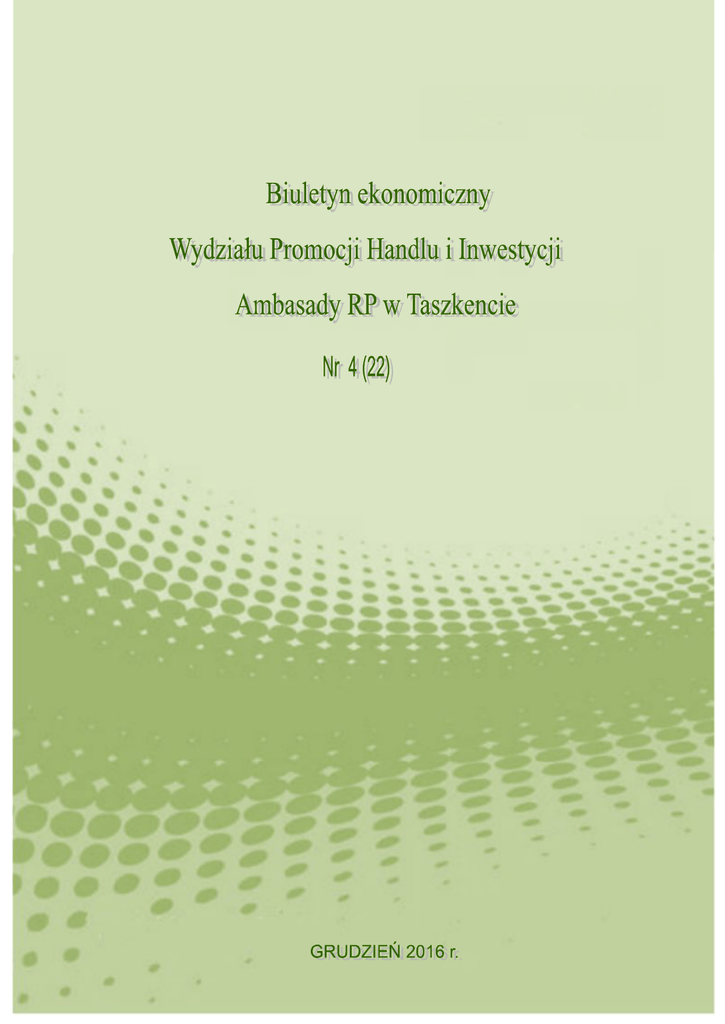 1 2 Spis treści I. Sytuacja społeczno-gospodarcza Uzbekistanu w okresie styczeń - wrzesień 2016 roku str. 4 II. Sytuacja społeczno-gospodarcza Tadżykistanu w okresie styczeń - wrzesień 2016 roku str. 9 III. Informacje bieżące · · · · · · · · · · · · · · · · · · · · · · · · · str. 13 Informacja nt. dodatkowych ulg dla spółek akcyjnych z udziałem kapitału zagranicznego w Uzbekistanie, Informacja nt. liberalizacji przepisów gospodarczych Uzbekistanu, Informacja nt. prognozy ADB dla Uzbekistanu, Informacja nt. Targów Uniwersalnych w Tadżykistanie, Informacja nt. Eksportu płodów rolnych z Doliny Fergańskiej przez przełęcz Kamczik, Informacja nt. obrotów handlu zagranicznego Tadżykistanu w okresie I-VIII br., Informacja nt. wykorzystania gazu skroplonego w Tadżykistanie, Informacja nt. zmian w zasadach prowadzenia handlu elektronicznego w Uzbekistanie, Informacja nt. kolejnej wolnej strefy ekonomicznej w Uzbekistanie, Informacja nt. liberalizacji przepisów gospodarczych Uzbekistanu, Informacja nt. rozszerzenia wykazu projektów wchodzących do uzbekistańskiego programu lokalizacji, Informacja nt. planowanego rozwoju bazy surowcowej, przetwórstwa owocowowarzywnego i produkcji artykułów spożywczych w obwodzie Taszkenckim, Informacja nt. nowego programu USAID w sektorze owocowo-warzywnym Uzbekistanu, Informacja nt. ofert inwestycyjnych uzbekistańskich podmiotów gospodarczych, Informacja nt. zwiększenia wymagań wobec inwestorów zagranicznych w Uzbekistanie, Informacja nt. pozycji Uzbekistanu w rankingu Doing Business-2017, Informacja nt. zwolnień celnych importowych przy wwozie do Uzbekistanu nasion warzyw, roślin basztanowych i strączkowych, Informacja nt. wznowienie połączeń lotniczych pomiędzy Uzbekistanem a Tadżykistanem, Informacja nt. kredytu ABR dla sektora rolnego Uzbekistanu, Informacja nt. wzrostu wydobycia węgla w Tadżykistanie, Informacja nt. wyborów prezydenta RU (Shawkat Mirzijojew 88,61%), Informacja nt. eksportu gazu, w tym uzbekistańskiego, do Chin, Informacja nt. zniesienia wiz do Uzbekistanu dla polskich turystów, którzy osiągnęli wiek 55 lat, Informacja nt. wyboru kandydata na stanowisko premiera Uzbekistanu, Propozycje zmian przepisów walutowych Uzbekistanu. 3 I. Sytuacja społeczno-gospodarcza Uzbekistanu w okresie styczeń – wrzesień 2016 roku 1. Produkt Krajowy Brutto Wg wstępnych danych Państwowego Komitetu ds. Statystyki RU, w okresie styczeń – wrzesień 2016 roku PKB osiągnął poziom 136.379,6 mld UZS i był o 7,8% wyższy niż w analogicznym okresie 2015 roku. 81,1% PKB wygenerował sektor niepaństwowy (2015 r. – 83%), a 18,9% – sektor państwowy. W strukturze PKB 51,7% stanowiły usługi (2015 r. – 51,2%), 31,7% – przemysl (31,6%) oraz 16,6% – rolnictwo, leśnictwo i rybołówstwo (17,2%). W przekroju terytorialnym największy wzrost PKB odnotowano w Karakałpacji - 118% (116,2% per capita), w Taszkencie 111,5% (110,3% per capita), w obwodzie Surchardarińskim - 109,4% (107,1% per capita), Samarkandzkim - 109,2% (107,1% per capita), Dżizakskim - 109,1 (106,9% per capita) i Namangańskim - 109% (106,9% per capita), najmniejszy – w obwodzie Andiżańskim - 98,5% (96,7% per capita). 2. Budżet Państwa Wg informacji z posiedzenia Rady Ministrów RU, dotyczącego wyników rozwoju społecznogospodarczego Uzbekistanu w okresie styczeń – wrzesień 2016 roku i priorytetów programu gospodarczego na 2016 rok (miało miejsce 24 listopada 2016 r.) budżet Uzbekistanu za 9 miesięcy 2016 r. został zrealizowany z proficytem 0,1% PKB (76,6 mld UZS). Dochodowa część budżetu była większa o 0,2% od zakładanej i wyniosła 21,7% PKP (29.531,7 mld UZS), wydatki z budżetu wyniosły 21,3% PKB (29.455,1 mld UZS). Wpływy do budżetu z podatków wyniosły 22.404,1 mld UZS, w tym z podatków bezpośrednich – 7.227,8 mld UZS (informacja ze strony Ministerstwa Finansów RU https://www.mf.uz/media/file/state-budget/1/9_mesyacev_2016.pdf). 3. Zadłużenie zagraniczne Oficjalnie dane dotyczące zadłużenia zagranicznego nie zostały opublikowane. 4. Inflacja Oficjalnie dane dotyczące inflacji zostały opublikowane tylko częściowo. Wg oficjalnych danych wzrost cen artykułów konsumpcyjnych na koniec września wyniósł w porównaniu z grudniem 2015 roku 2,2% (w 2015 r. – 2,2%). Średni miesięczny wzrost cen artykułów konsumpcyjnych wynosił 0,2% (w I-IX 2015 r. – 0,2%). Ceny producentów produkcji przemysłowej wzrosły o 10,6% (w 2015 r. – 7%). Na wzrost cen producentów produkcji przemysłowej największy wpływ miał wzrost cen w przetwórstwie (111,8%), w tym: w produkcji niemetalowych wyrobów mineralnych (dynamika 136,5%), w produkcji napojów (123,4%), w produkcji urządzeń elektrycznych (121,5%), w metalurgii żelaza (117,5%), w przemyśle spożywczym (110,4%), w przemyśle tekstylnym (110,3%), w elektroenergetyce (109,1%), w przemyśle chemicznym (107,5%), w produkcji samochodów, przyczep i naczep (103,5%), w przemyśle koksowniczo-naftowym (100,3%); w przemyśle wydobywczym ceny wzrosły o 3,3%, w produkcji i dystrybucji energii, gazu, pary – o 9,1%. Wg październikowej prognozy Międzynarodowego Funduszu Walutowego, inflacja w Uzbekistanie w 2016 r. wyniesie 8%. 5. Bezrobocie, zatrudnienie i dochody ludności Wg danych statystycznych, liczba ludności Uzbekistanu na dzień 1 października 2016 r. wynosiła 31.977,1 tys. osób (wzrost o 1,3%). a/ Liczba osób zarejestrowanych w urzędach zatrudnienia jako osoby poszukujące pracy wynosiła na koniec września 2016 r. 5,4 tys., wzrost o 76,7% (na koniec września 2015 – 3 tys. osób; 2014 r. – 4,7 tys. osób). W okresie styczeń-wrzesień 2016 r. liczba osób poszukujących pracy (liczona zgodnie z Rozporządzeniem Rady Ministrów RU nr. 106 z dn. 24.05.2007 r.) osiągnęła 720,4 tys. 4 osób, czyli 5,1% ludności aktywnej zawodowo (14.009,7 tys. osób). Sytuację na rynku pracy Uzbekistanu charakteryzuj
