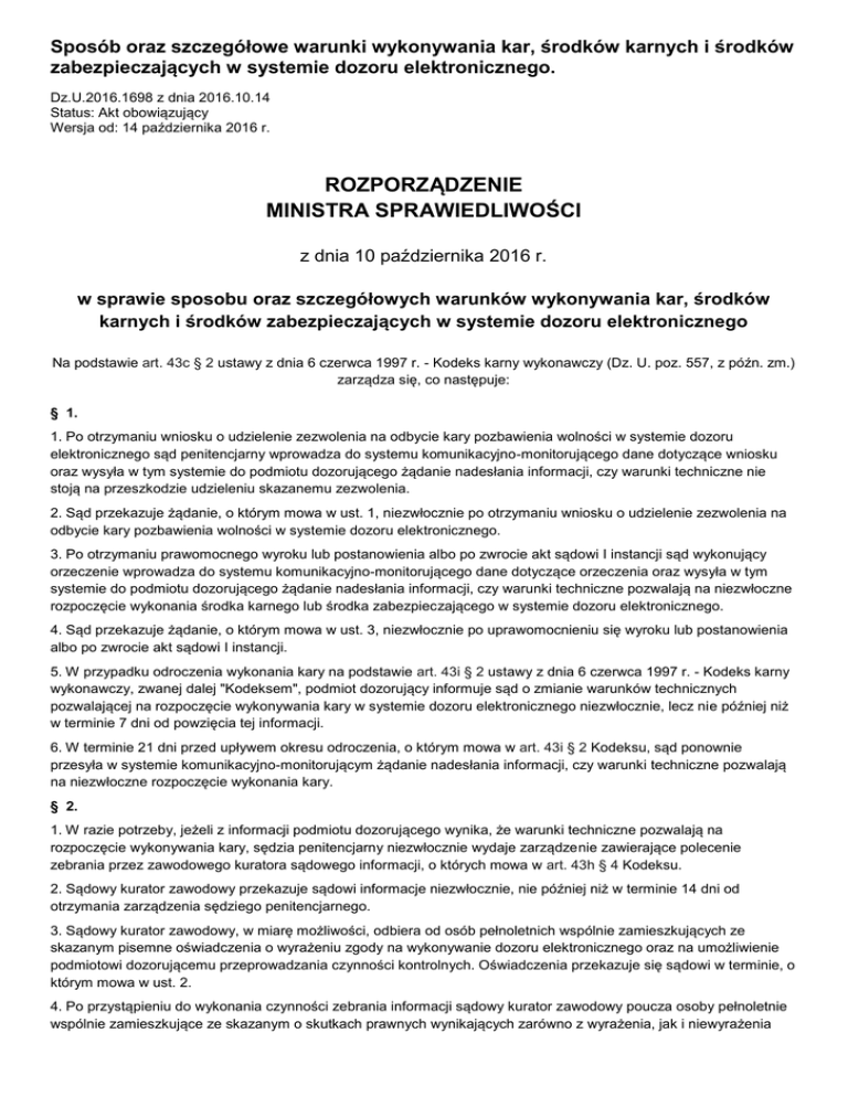 Sposób oraz szczegółowe warunki wykonywania kar, środków karnych i środków zabezpieczających w systemie dozoru elektronicznego. Dz.U.2016.1698 z dnia 2016.10.14 Status: Akt obowiązujący Wersja od: 14 października 2016 r. ROZPORZĄDZENIE MINISTRA SPRAWIEDLIWOŚCI z dnia 10 października 2016 r. w sprawie sposobu oraz szczegółowych warunków wykonywania kar, środków karnych i środków zabezpieczających w systemie dozoru elektronicznego Na podstawie art. 43c § 2 ustawy z dnia 6 czerwca 1997 r. - Kodeks karny wykonawczy (Dz. U. poz. 557, z późn. zm.) zarządza się, co następuje: § 1. 1. Po otrzymaniu wniosku o udzielenie zezwolenia na odbycie kary pozbawienia wolności w systemie dozoru elektronicznego sąd penitencjarny wprowadza do systemu komunikacyjno-monitorującego dane dotyczące wniosku oraz wysyła w tym systemie do podmiotu dozorującego żądanie nadesłania informacji, czy warunki techniczne nie stoją na przeszkodzie udzieleniu skazanemu zezwolenia. 2. Sąd przekazuje żądanie, o którym mowa w ust. 1, niezwłocznie po otrzymaniu wniosku o udzielenie zezwolenia na odbycie kary pozbawienia wolności w systemie dozoru elektronicznego. 3. Po otrzymaniu prawomocnego wyroku lub postanowienia albo po zwrocie akt sądowi I instancji sąd wykonujący orzeczenie wprowadza do systemu komunikacyjno-monitorującego dane dotyczące orzeczenia oraz wysyła w tym systemie do podmiotu dozorującego żądanie nadesłania informacji, czy warunki techniczne pozwalają na niezwłoczne rozpoczęcie wykonania środka karnego lub środka zabezpieczającego w systemie dozoru elektronicznego. 4. Sąd przekazuje żądanie, o którym mowa w ust. 3, niezwłocznie po uprawomocnieniu się wyroku lub postanowienia albo po zwrocie akt sądowi I instancji. 5. W przypadku odroczenia wykonania kary na podstawie art. 43i § 2 ustawy z dnia 6 czerwca 1997 r. - Kodeks karny wykonawczy, zwanej dalej "Kodeksem", podmiot dozorujący informuje sąd o zmianie warunków technicznych pozwalającej na rozpoczęcie wykonywania kary w systemie dozoru elektronicznego niezwłocznie, lecz nie później niż w terminie 7 dni od powzięcia tej informacji. 6. W terminie 21 dni przed upływem okresu odroczenia, o którym mowa w art. 43i § 2 Kodeksu, sąd ponownie przesyła w systemie komunikacyjno-monitorującym żądanie nadesłania informacji, czy warunki techniczne pozwalają na niezwłoczne rozpoczęcie wykonania kary. § 2. 1. W razie potrzeby, jeżeli z informacji podmiotu dozorującego wynika, że warunki techniczne pozwalają na rozpoczęcie wykonywania kary, sędzia penitencjarny niezwłocznie wydaje zarządzenie zawierające polecenie zebrania przez zawodowego kuratora sądowego informacji, o których mowa w art. 43h § 4 Kodeksu. 2. Sądowy kurator zawodowy przekazuje sądowi informacje niezwłocznie, nie później niż w terminie 14 dni od otrzymania zarządzenia sędziego penitencjarnego. 3. Sądowy kurator zawodowy, w miarę możliwości, odbiera od osób pełnoletnich wspólnie zamieszkujących ze skazanym pisemne oświadczenia o wyrażeniu zgody na wykonywanie dozoru elektronicznego oraz na umożliwienie podmiotowi dozorującemu przeprowadzania czynności kontrolnych. Oświadczenia przekazuje się sądowi w terminie, o którym mowa w ust. 2. 4. Po przystąpieniu do wykonania czynności zebrania informacji sądowy kurator zawodowy poucza osoby pełnoletnie wspólnie zamieszkujące ze skazanym o skutkach prawnych wynikających zarówno z wyrażenia, jak i niewyrażenia zgody na wykonywanie dozoru elektronicznego oraz na umożliwienie podmiotowi dozorującemu przeprowadzania czynności kontrolnych. § 3. 1. Przy uruchomieniu środków technicznych podmiot dozorujący informuje skazanego o: 1) sposobie działania powierzonych środków technicznych, w tym o możliwości wystąpienia zakłóceń w ich działaniu, a także o obowiązku powiadomienia podmiotu dozorującego i sposobie zachowania się skazanego w przypadkach wystąpienia tych zakłóceń; 2) obowiązku i sposobie dbania o powierzone środki techniczne, a zwłaszcza ich ochrony przed utratą, zniszczeniem, uszkodzeniem lub uczynieniem niezdatnymi do użytku oraz zapewnienia stałego zasilania energią elektryczną; 3) obowiązku poddania się czynnościom kontrolnym podmiotu dozorującego, mającym na celu sprawdzenie prawidłowości funkcjonowania powierzonych środków technicznych; 4) rodzaju i sposobach przeprowadzania czynności kontrolnych; 5) treści art. 43s Kodeksu oraz o odpowiedzialności karnej przewidzianej za naruszenie przepisów o wykonywaniu kar, środków karnych i środków zabezpieczających w systemie dozoru elektronicznego. 2. Przy uruchomieniu rejestratora przenośnego lub stacjonarnego podmiot dozorujący instruuje osobę chronioną zakazem zbliżania co do sposobu używania rejestratora. Przepisy ust. 1 stosuje się odpowiednio. § 4. 1. Przekazywanie żądań, poleceń, wniosków, informacji, wezwań i zawiadomień pomiędzy sądem, sędzią, sądowym kuratorem zawodowym, podmiotem dozorującym i podmiotem prowadzącym centralę monitorowania odbywa się za pośrednictwem systemu komunikacyjno-monitorującego. 2. W czasie pierwszego kontaktu ze skazanym sądowy kurator zawodowy uzyskuje od niego numer telefonu lub adres poczty elektronicznej, umożliwiające mu kontaktowanie się ze skazanym podczas wykonywania kary, środka karnego lub środka zabezpieczającego; jeżeli skazany wyraził na to zgodę, wezwań, zawiadomień lub przekazywania informacji można dokonywać także telefonicznie lub za pośrednictwem poczty elektronicznej. 3. Osoby upoważnione mogą żądać od skazanego wyjaśnień również przy użyciu rejestratora stacjonarnego w czasie, gdy skazany ma obowiązek przebywać w zasięgu tego urządzenia. W przypadku nieodebrania połączenia przychodzącego do rejestratora stacjonarnego w systemie komunikacyjno-monitorującym pozostawia się adnotację o czasie nieodebranego połączenia. § 5. 