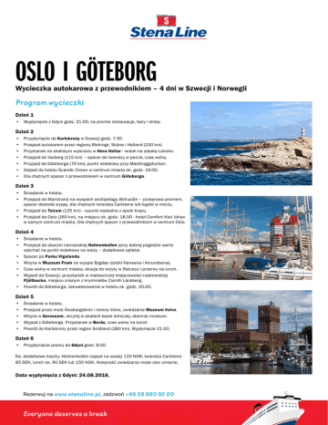 OSLO I GÖTEBORG Wycieczka autokarowa z przewodnikiem – 4 dni w Szwecji i Norwegii Program wycieczki Dzień 1 • Wypłynięcie z Gdyni godz. 21.00, na promie restauracje, bary i sklep. Dzień 2 • • • • • • • Przypłynięcie do Karlskrony w Szwecji godz. 7.30. Przejazd autokarem przez regiony Blekinge, Skåne i Halland (230 km). Przystanek na skalistym wybrzeżu w Hovs Hallar– widok na zatokę Laholm. Przejazd do Varberg (115 km) – spacer do twierdzy w porcie, czas wolny. Przyjazd do Göteborga (70 km), punkt widokowy przy Masthuggskyrkan. Dojazd do hotelu Scandic Crown w centrum miasta ok. godz. 19.00. Dla chętnych spacer z przewodnikiem w centrum Göteborga. Dzień 3 • Śniadanie w hotelu. • Przejazd do Marstrand na wyspach archipelagu Bohuslän – przeprawa promem, spacer dookoła wyspy, dla chętnych twierdza Carlstens lub kąpiel w morzu. • Przejazd do Tanum (125 km) - rysunki naskalne z epoki brązu. • Przejazd do Oslo (160 km), na miejscu ok. godz. 18.00 - hotel Comfort Karl Johan w samym centrum miasta. Dla chętnych spacer z przewodnikiem w centrum Oslo. Dzień 4 • Śniadanie w hotelu. • Przejazd do skoczni narciarskiej Holmenkollen (przy dobrej pogodzie warto wjechać na punkt widokowy na wieży – dodatkowa opłata). • Spacer po Parku Vigelanda. • Wizyta w Muzeum Fram na wyspie Bygdøy (statki Nansena i Amundsena). • Czas wolny w centrum miasta, okazja do wizyty w Ratuszu i przerwy na lunch. • Wyjazd do Szwecji, przystanek w malowniczej miejscowości nadmorskiej Fjällbacka, miejscu znanym z kryminałów Camilli Läckberg. • Powrót do Göteborga, zakwaterowanie w hotelu ok. godz. 20.00. Dzień 5 • • • • • Śniadanie w hotelu. Przejazd przez most Älvsborgsbron i tereny Volvo, zwiedzanie Muzeum Volvo. Wizyta w Aerosuem, ukrytej w skałach bazie lotniczej, obecnie muzeum. Wyjazd z Göteborga. Przystanek w Borås, czas wolny na lunch. Powrót do Karlskrony przez region Småland (280 km). Wypłynięcie 21.00. Dzień 6 • Przypłynięcie promu do Gdyni godz. 9.00. Ew. dodatkowe koszty: Holmenkollen (wjazd na wieżę) 120 NOK; twierdza Carlstens 85 SEK, lunch ok. 90 SEK lub 150 NOK. Kolejność zwiedzania może ulec zmianie. Data wypłynięcia z Gdyni: 24.08.2016. Rezerwuj na www.stenaline.pl, zadzwoń +48 58 660 92 00 Everyone deserves a break 20