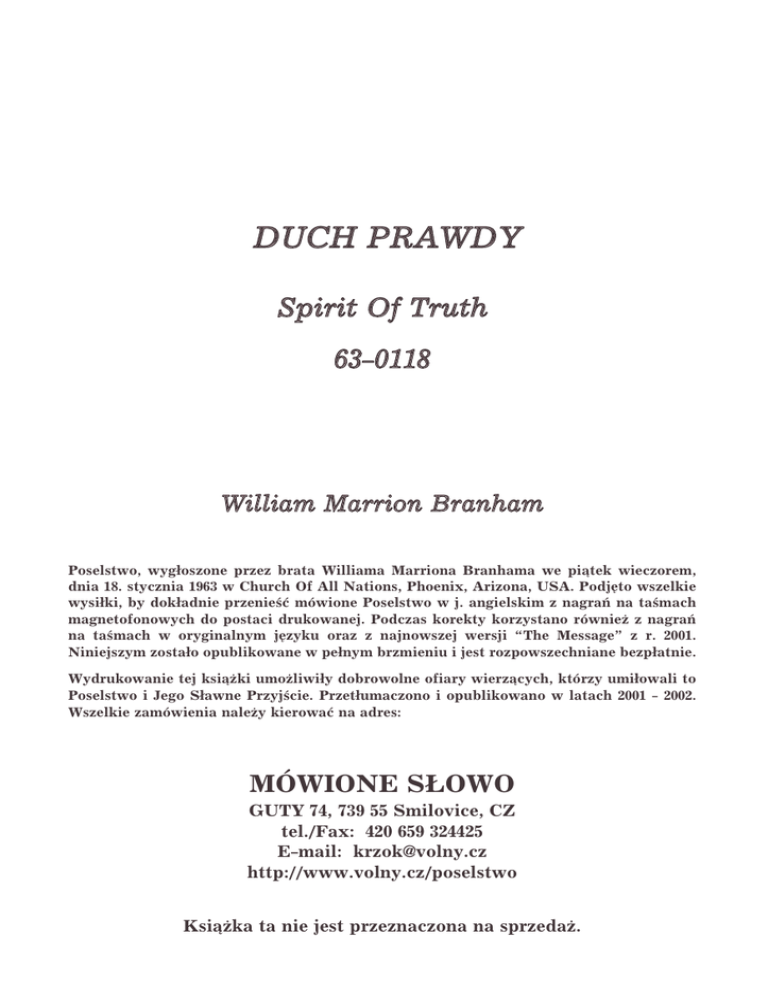 DUCH PRAWDY Spirit Of Truth 63-0118 William Marrion Branham Poselstwo, wygoszone przez brata Williama Marriona Branhama we pitek wieczorem, dnia 18. stycznia 1963 w Church Of All Nations, Phoenix, Arizona, USA. PodjŸto wszelkie wysiki, by dokadnie przenie™ø mówione Poselstwo w j. angielskim z nagra§ na ta™mach magnetofonowych do postaci drukowanej. Podczas korekty korzystano równieŒ z nagra§ na ta™mach w oryginalnym jŸzyku oraz z najnowszej wersji “The Message” z r. 2001. Niniejszym zostao opublikowane w penym brzmieniu i jest rozpowszechniane bezpatnie. Wydrukowanie tej ksiŒki umoŒliwiy dobrowolne ofiary wierzcych, którzy umiowali to Poselstwo i Jego Sawne Przyj™cie. Przetumaczono i opublikowano w latach 2001 - 2002. Wszelkie zamówienia naleŒy kierowaø na adres: MÓWIONE S~OWO GUTY 74, 739 55 Smilovice, CZ tel./Fax: 420 659 324425 E-mail: [email protected] http://www.volny.cz/poselstwo KsiŒka ta nie jest przeznaczona na sprzedaŒ. 2 Duch Prawdy 1 Pozosta§my teraz na chwilŸ staø, kiedy siŸ modlimy. Pochylmy nasze gowy. Nasz sprawiedliwy Niebia§ski Ojcze, kiedy zbliŒamy siŸ do Ciebie teraz w tym wszystko zaspakajajcym Imieniu Pana Jezusa, pragniemy Ci oddaø chwaŸ za to, co Ty uczynie™ dla nas, co nasze oczy widziay i nasze uszy syszay w tych ostatecznych dniach ko§czcych siŸ scen historii tego ™wiata, kiedy czas zanika i przechodzi do wieczno™ci i widzimy te ™wiecce ™wiata, i wiemy, Œe nie potrwa to juŒ dugo do przyj™cia Pana Jezusa. 2 Chcieliby™my CiŸ poprosiø, Niebia§ski Ojcze, aby™ o nas pamiŸta dzisiaj wieczorem. A jeŒeli jest w nas co™ zego, wyjmij to Panie, dzisiaj wieczorem, aby™my siŸ mogli pokazaø przed Tob, gdyby™ przyszed dzisiaj wieczorem. Modlimy siŸ o chorych i bŸdcych w potrzebie. Modlimy siŸ o Twój Ko™ció zarówno tutaj jak i po caym ™wiecie, o Twoje dzieci wszŸdzie w kaŒdym narodzie, aby™my mogli oczy™ciø nasze szaty we Krwi Baranka i usyszeø to woanie: Oto Oblubieniec przychodzi. Wyjd›cie Mu na spotkanie”. Oby™my mogli w tym czasie, Panie, z aski BoŒej i dla zasug Jezusa, Któremu ufamy, ochŸdoŒyø nasze lampy i potem wyj™ø na spotkanie z naszym Oblubie§cem. We› Sowo Pa§skie dzisiaj wieczorem i obrzeŒ nasze serca. Wyjmij wszelkie niedowiarstwo z nas. Daruj nam wspaniae naboŒe§stwo. Prosimy o to w Imieniu Jezusa. Amen. MoŒecie usi™ø. 3 Jest to naprawdŸ mie byø znowu tutaj w tej ™wityni Pa§skiej dzisiaj wieczorem na naboŒe§stwie. PrzeŒyli™my najwspanialsze chwile wczoraj wieczorem u brata Groomera. Przypominam sobie, Œe ubiegego roku mieli™my tam równieŒ wspaniae chwile. PrzeŒywali™my wspaniae chwile wszŸdzie. Pan pobogosawi nas po prostu nadzwyczaj obficie, wiŸcej niŒ siŸ w ogóle spodziewaem, Œe On nas pobogosawi. Lecz On jest po prostu tak peen miosierdzia i dobroci, i jest tak dobr rzecz poznaø Go, nieprawdaŒ? I pomy™lcie, poznaø Jego to ycie. Poznaø Go jest yciem. 4 OtóŒ, jutro wieczorem bŸdziemy w Zborze Central Avenue _ my™lŸ, Œe tak siŸ nazywa; u brata Fullera, kolejnego zacnego brata. I ja my™lŸ, Œe to jest wielki zbór, tam u niego. I mam nadziejŸ, Œe moŒe bŸdziemy mogli urzdziø kolejkŸ modlitwy, jeŒeli to bŸdzie odpowiadaø bratu Fullerowi. WiŸc my^ A potem _ nastŸpnego dopoudnia bŸdziemy w zborze _ my™lŸ, Œe nazywa siŸ Apostolski Ko™ció tutaj w Phoenix. I nie przypominam sobie po prostu, kto jest jego pastorem, kim jest ten brat. I ja _ czy byem tam ubiegego roku? [Brat odpowiada: Nie” _ wyd.] 5 A nastŸpnie w niedzielŸ wieczorem u naszego drogiego brata Outlaw _ w jego zborze tutaj powyŒej _ w Ko™ciele Imienia Jezus. I ja jestem w wielkim oczekiwaniu, równieŒ moja rodzina, by tam pój™ø i usyszeø co™ DUCH PRAWDY 3 z tego piŸknego ™piewania. Billy Paul powinien to znaø szczegóowo na pamiŸø. My grali™my t pie™§: Ja idŸ do góry, do góry” tak dugo, aŒ szczerze mówic ta pie™§ stara siŸ niemal z ta™my. On j wcza w biurze i bez wzglŸdu na to, o której porze dnia tam wszedem, on gra to: Do góry tam, do góry tam” po prostu w kóko^ My™my j zuŒyli przez cige odtwarzanie i to nagranie jest niemal starte. 6 Wiecie, odczuwaem dzisiaj wieczorem, Œe jestem trochŸ ochrypy. Pomy™laem sobie: O rety, gdybym tylko móg zobaczyø kogo™, kto mówiby zamiast mnie”. I przypadkowo spojrzaem tutaj na drug stronŸ i zobaczyem Jacka Moore. To bŸdzie zupenie wa™ciwe _ ja wcale^ O, ja my™lŸ, Œe to byoby po prostu cudowne, bracie Jack. [Brat odpowiada _ wyd.] NuŒe, suchajcie tego. I my™lŸ, Œe widzŸ równieŒ brata Roy Bordersa, siedzcego tutaj. Tak jest. Brat Noel Jones siedzi takŒe tutaj. O, moi drodzy. Ja usugujŸ po prostu wszŸdzie po okolicy. My™lŸ, Œe byoby dobre, gdybym trochŸ odpocz, wiecie, i poprosi kogo™ z tych zacnych mŸŒów, by wystpi tutaj i przemawia zamiast mnie, kiedy jestem ochrypy, wiecie. Brat Jack mi powiedzia: Nie ma Pana w tym objawieniu”. OtóŒ, byem zmŸczony, kiedy przyszedem, a byem trochŸ zmŸczony przez cay czas. I widzŸ ludzi, stojcych tam. Wiem, Œe oni musz staø i trochŸ mnie to cieszy, Œe stojŸ razem z nimi. WiŸc niech was Pan bogosawi. 7 I spodziewamy siŸ teraz tych nastŸpnych naboŒe§stw, które s przed nami. A wiŸc, w nastŸpnym tygodniu jest to w Zielono™witkowych Zborach i w innych. Zako§czymy w nastŸpn ™rodŸ wieczorem na ulicy 11. i Garfield (nie potrafiŸ ich po prostu wszystkich zapamiŸtaø), my™lŸ, Œe w Pierwszym Zborze BoŒym w tym mie™cie. A potem rozpoczyna siŸ konferencja w Ramada. A obecnie urzdzili bankiet dla biznesmenów tam _ w gównym mie™cie Arizony, w Tucson. I oczywi™cie, wszyscy wiemy, Œe Phoenix i te miejscowo™ci s tylko peryferiami tego miasta. A zatem, to siŸ zgadza. Ono jest gównym miastem. Ono jest miastem, w którym mieszkam, wiecie, wiŸc^ Tak wiŸc _ tam na wzgórzu. A zatem to miasto jest po prostu jakby jego peryferi. Wiecie, jest mi rzecz mieø