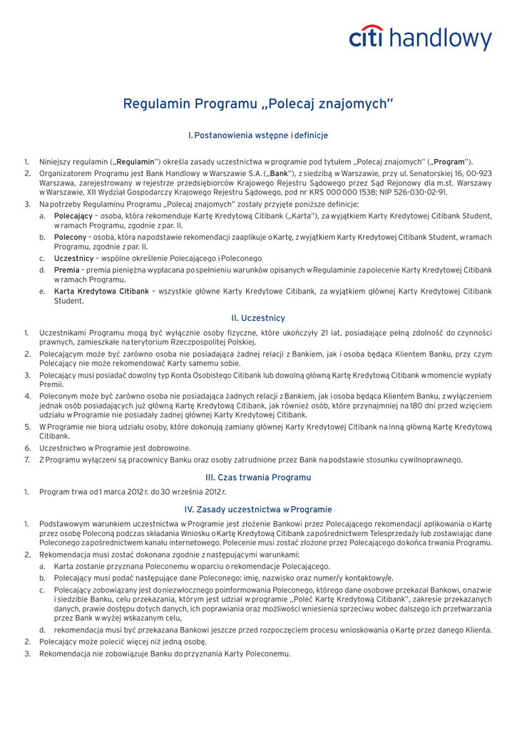Regulamin Programu „Polecaj znajomych” I. Postanowienia wstępne i definicje 1. Niniejszy regulamin („Regulamin”) określa zasady uczestnictwa w programie pod tytułem „Polecaj znajomych” („Program”). 2. Organizatorem Programu jest Bank Handlowy w Warszawie S.A. („Bank”), z siedzibą w Warszawie, przy ul. Senatorskiej 16, 00-923 Warszawa, zarejestrowany w rejestrze przedsiębiorców Krajowego Rejestru Sądowego przez Sąd Rejonowy dla m.st. Warszawy w Warszawie, XII Wydział Gospodarczy Krajowego Rejestru Sądowego, pod nr KRS 000 000 1538; NIP 526-030-02-91. 3. Na potrzeby Regulaminu Programu „Polecaj znajomych” zostały przyjęte poniższe definicje: a. Polecający – osoba, która rekomenduje Kartę Kredytową Citibank („Karta”), za wyjątkiem Karty Kredytowej Citibank Student, w ramach Programu, zgodnie z par. II. b. Polecony – osoba, która na podstawie rekomendacji zaaplikuje o Kartę, z wyjątkiem Karty Kredytowej Citibank Student, w ramach Programu, zgodnie z par. II. c. Uczestnicy – wspólne określenie Polecającego i Poleconego d. Premia – premia pieniężna wypłacana po spełnieniu warunków opisanych w Regulaminie za polecenie Karty Kredytowej Citibank w ramach Programu. e. Karta Kredytowa Citibank – wszystkie główne Karty Kredytowe Citibank, za wyjątkiem głównej Karty Kredytowej Citibank Student. II. Uczestnicy 1. Uczestnikami Programu mogą być wyłącznie osoby fizyczne, które ukończyły 21 lat, posiadające pełną zdolność do czynności prawnych, zamieszkałe na terytorium Rzeczpospolitej Polskiej. 2. Polecającym może być zarówno osoba nie posiadająca żadnej relacji z Bankiem, jak i osoba będąca Klientem Banku, przy czym Polecający nie może rekomendować Karty samemu sobie. 3. Polecający musi posiadać dowolny typ Konta Osobistego Citibank lub dowolną główną Kartę Kredytową Citibank w momencie wypłaty Premii. 4. Poleconym może być zarówno osoba nie posiadająca żadnych relacji z Bankiem, jak i osoba będąca Klientem Banku, z wyłączeniem jednak osób posiadających już główną Kartę Kredytową Citibank, jak również osób, które przynajmniej na 180 dni przed wzięciem udziału w Programie nie posiadały żadnej głównej Karty Kredytowej Citibank. 5. W Programie nie biorą udziału osoby, które dokonują zamiany głównej Karty Kredytowej Citibank na inną główną Kartę Kredytową Citibank. 6. Uczestnictwo w Programie jest dobrowolne. 7. Z Programu wyłączeni są pracownicy Banku oraz osoby zatrudnione przez Bank na podstawie stosunku cywilnoprawnego. III. Czas trwania Programu 1. Program trwa od 1 marca 2012 r. do 30 września 2012 r. IV. Zasady uczestnictwa w Programie 1. Podstawowym warunkiem uczestnictwa w Programie jest złożenie Bankowi przez Polecającego rekomendacji aplikowania o Kartę przez osobę Poleconą podczas składania Wniosku o Kartę Kredytową Citibank za pośrednictwem Telesprzedaży lub zostawiając dane Poleconego za pośrednictwem kanału internetowego. Polecenie musi zostać złożone przez Polecającego do końca trwania Programu. 2. Rekomendacja musi zostać dokonana zgodnie z następującymi warunkami: a. Karta zostanie przyznana Poleconemu w oparciu o rekomendacje Polecającego. b. Polecający musi podać następujące dane Poleconego: imię, nazwisko oraz numer/y kontaktowy/e. c. Polecający zobowiązany jest do niezwłocznego poinformowania Poleconego, którego dane osobowe przekazał Bankowi, o nazwie i siedzibie Banku, celu przekazania, którym jest udział w programie „Poleć Kartę Kredytową Citibank”, zakresie przekazanych danych, prawie dostępu do tych danych, ich poprawiania oraz możliwości wniesienia sprzeciwu wobec dalszego ich przetwarzania przez Bank w wyżej wskazanym celu, d. rekomendacja musi być przekazana Bankowi jeszcze przed rozpoczęciem procesu wnioskowania o Kartę przez danego Klienta. 2. Polecający może polecić więcej niż jedną osobę. 3. Rekomendacja nie zobowiązuje Banku do przyznania Karty Poleconemu. V. Premie 1. Za każdą wydaną przez Bank na podstawie rekomendacji Polecającego Kartę Kredytową Citibank, po spełnieniu odpowiednio warunków opisanych w ust. 2 i 3 poniżej, Uczestnicy otrzymują następujące Premie: a. 50 zł – jednorazowa Premia dla Polecającego b. 50 zł – jednorazowa Premia dla Poleconego 2. Polecony otrzyma Premię pod warunkiem, że dokona co najmniej jednej bezgotówkowej transakcji na dowolną kwotę nową wydaną Kartą Kredytową Citibank, nie później niż w następnym miesiącu kalendarzowym od daty zawarcia Umowy o Kartę Kredytową Citibank. 3. Polecający otrzyma Premię pod warunkiem, że: a) będzie posiadaczem Konta Osobistego Citibank lub Karty Kredytowej Citibank na dzień wypłacania Premii, b) Polecony spełni warunek wskazany w punkcie 2. powyżej. 4. W przypadku otrzymania informacji o wykorzystywaniu Programu przez Uczestnika w sposób naruszający przepisy prawa lub godzący w dobre obyczaje lub powszechnie obowiązujące normy obyczajowe i społeczne Bank zastrzega sobie wykluczenie Uczestnika z Programu, a także pozbawienie go praw do otrzymywania Premii oraz wyksięgowanie otrzymanych już Premii związanych z Programem, niezależnie od tego czy spełni pozostałe warunki opisane w niniejszym Regulaminie. 5. Naruszenie przez Uczestnika istotnych postanowień Regulaminu, a w szczególności: podanie nieprawdziwych lub nieaktualnych danych osobowych, złożenie nieprawdziwych oświadczeń, tworzenie stron internetowych mających na celu wykorzystanie Programu, naruszenie przepisów prawa oraz obyczajów w związku z uczestnictwem w Programie, upoważnia Bank do wykluczenia Uczestnika z Programu i powoduje utratę prawa do Premii oraz wyksięgowania otrzymanych już Premii związanych z Programem, niezależnie od tego czy dany Uczestnik spełni pozostałe warunki opisane w niniejszym Regulaminie. 6. Wypłata Premii nastąpi do końca miesiąca następującego p