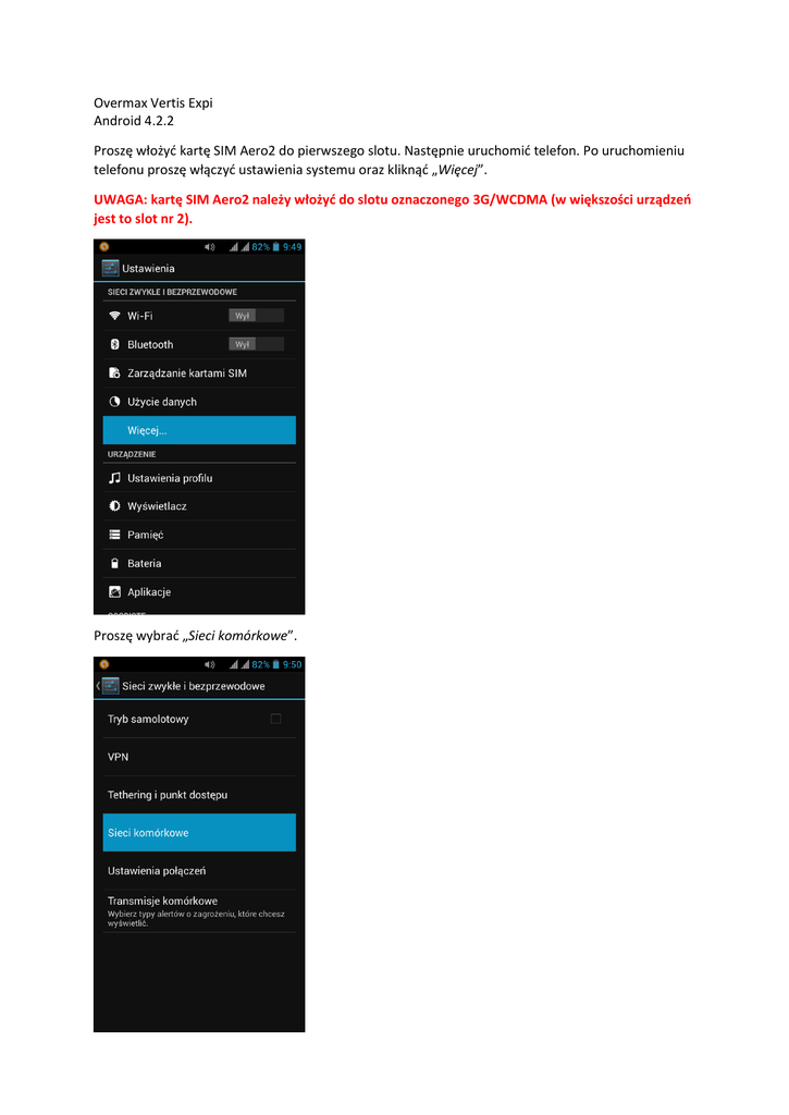 Overmax Vertis Expi Android 4.2.2 Proszę włożyć kartę SIM Aero2 do pierwszego slotu. Następnie uruchomić telefon. Po uruchomieniu telefonu proszę włączyć ustawienia systemu oraz kliknąć „Więcej”. UWAGA: kartę SIM Aero2 należy włożyć do slotu oznaczonego 3G/WCDMA (w większości urządzeń jest to slot nr 2). Proszę wybrać „Sieci komórkowe”. Następnie „Punkty dostępowe”. „Punkty dostępowe” na karcie Aero2 (SIM 1 Inne ustawienia – UWAGA: proszę zwrócić uwagę, w którym slocie znajduje się karta Aero2). Proszę kliknąć w „Nowy APN” W polu „Nazwa” proszę wpisać np.: „Aero2” W polu APN proszę wpisać „darmowy” Pozostałe ustawienia proszę pozostawić bez zmian. Następnie proszę wrócić do „Ustawień sieci komórkowej” i wybrać „Sieć 3G”. Proszę włączyć „Tylko 3G” na karcie Aero2. „Ustawienia” > „Zarządzanie kartami SIM” > proszę wybrać „Transmisja danych w roamingu”. Proszę zaznaczyć kartę Aero2. W opcji „Połączenia wideo” proszę ustawić Aero2. W opcji „Dane” proszę wybrać również Aero2, a połącznia głosowe oraz wiadomości proszę ustawić na drugą kartę. Urządzenie zostało poprawnie skonfigurowane. Proszę uruchomić przeglądarkę internetową w celu przepisania kodu CAPTCHA.