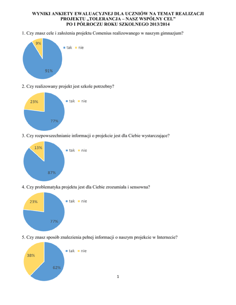 WYNIKI ANKIETY EWALUACYJNEJ DLA UCZNIÓW NA TEMAT REALIZACJI PROJEKTU „TOLERANCJA – NASZ WSPÓLNY CEL” PO I PÓŁROCZU ROKU SZKOLNEGO 2013/2014 1. Czy znasz cele i założenia projektu Comenius realizowanego w naszym gimnazjum? 2. Czy realizowany projekt jest szkole potrzebny? 3. Czy rozpowszechnianie informacji o projekcie jest dla Ciebie wystarczające? 4. Czy problematyka projektu jest dla Ciebie zrozumiała i sensowna? 5. Czy znasz sposób znalezienia pełnej informacji o naszym projekcie w Internecie? 1 6. Czy kiedykolwiek prowadziłaś(eś) rozmowę z koleżanką/kolegą na temat naszego projektu Comenius? 7. Czy jesteś / byłeś zaangażowana(y) w dotychczasowe działania projektowe, m.in.: 2 8. Jakie korzyści uzyskałaś(eś) z dotychczasowego udziału w działaniach projektowych: 9. Czy uważasz, że dzięki projektowi: a. rozbudziła się twoja wrażliwość na innych ludzi, inne kultury: b. zaistniałaś(eś) poza szkołą, inni dowiedzieli się, co robisz: 3 c. zwiększyła się twoja motywacja do nauki języków obcych: 10. Jakie masz inne uwagi na temat realizacji projektu, co Ci się podoba(ło), co Ci się nie podoba(ło), co chciałabyś/chciałbyś zmienić? Uczniowie wymienili wiele uwag na temat realizacji projektu. Podobały im się: koncert „Music makes tolerance” (4 osoby), spektakl “Mały Książę”, tablica z informacjami na temat uczniów niemieckich – ich listy - charakterystyki (4 osoby), akademie, prezentacje multimedialne, dobra komunikatywność z uczniami z Niemiec, występy, quizy, konkursy na logo i kartkę bożonarodzeniową (2 osoby), fakt wyjazdu naszych uczniów, przyjazd uczniów ze szkoły partnerskiej (4 osoby), że można poznać ludzi z innego kraju, projekt „Jaką rolę pełnią ludzie starsi w społeczeństwie”, dodatkowe zajęcia o tolerancji i każdy mógł poprawić swe zachowanie, jak było niepoprawne, dodatkowe prace na lekcjach języków obcych (2 osoby), że poprawią się stosunki z Niemcami, że nie było lekcji w czasie trwania niektórych projektów. Wielu uczniów stwierdziło, że wszystko im się podobało i nic nie chcą zmieniać, że wszytko jest dobrze, okey, dobrze dopracowane, że projekt jest bardzo fajny a działania projektowe wywarły na nich pozytywne wrażenie, ponieważ m.in. zdobywamy wiedzę. Jednemu uczniowi z klasy trzeciej nie podobało się to, że uczniowie ze szkoły partnerskiej przyjeżdżają dopiero za rok. Inny uczeń zasugerował, że powinniśmy zrobić projekt o tym, co powinni zobaczyć w Polsce. 4 Celem dokonania ewaluacji działań związanych z realizacją programu Comenius w Gimnazjum w Lelowie w I półroczu trwania projektu „Tolerancja – nasz wspólny cel” zostały opracowane ankiety dla uczniów, rodziców i nauczycieli. Badanie ankietowe zostało przeprowadzone w lutym 2014 r. Zbieranie informacji poprzez badanie ankietowe służyło wzmocnieniu pozytywnych działań w zakresie tworzenia odpowiednich warunków dla realizacji tego programu oraz eliminowaniu jego słabych stron. Ankieta dla uczniów zawierała 9 pytań zamkniętych i jedno pytanie otwarte, została przeprowadzona w lutym 2014 roku, wzięło w niej udział 124 uczniów – tj. 97% wszystkich uczniów gimnazjum, 4 uczniów było nieobecnych. Ankieta była anonimowa. Z badania ankietowego wynika, że uczniowie znają cele i założenia projektu Comenius realizowanego w naszym gimnazjum – 113 uczniów (91%), projekt jest szkole potrzebny a jego tematyka i problematyka zrozumiała i sensowna dla 96 uczniów (77%), rozpowszechnianie informacji o projekcie jest wystarczające dla 108 respondentów (87%). 76 uczniów (62%) wie, jak znaleźć pełną informację o naszym projekcie w Internecie a 55 uczniów (45%) prowadziło rozmowę z koleżanką/kolegą na temat naszego projektu. Większość ankietowanych była zaangażowana w kilka działań projektowych. Najwięcej uczniów – 96 (77%) brało udział w wykonaniu słowniczka polsko-niemiecko-angielskiego na temat życia codziennego i szkoły, 45 (36%) w konkursie na kartkę bożonarodzeniową dla szkoły partnerskiej a 29 (23%) wykonywało kalendarze adwentowe. Uczniowie wskazali korzyści uzyskane z udziału w działaniach projektowych w następującej kolejności: wzbogacenie wiedzy o ludziach, historii i kulturze naszych zachodnich sąsiadów – 61 uczniów (49%), rozwój umiejętności językowych – 46 uczniów (37%), rozwój kreatywności – 39 uczniów (31%) rozwój talentów artystycznych oraz rozwój umiejętności korzystania z technologii komunikacyjno-informacyjnych – po 25 uczniów (20%), nagrody w konkursach – 12 uczniów (10%). Tylko jeden uczeń napisał, że nie brał udziału w żadnych działaniach projektowych. Na pytanie, czy rozbudziła się twoja wrażliwość na innych ludzi, inne kultury, 56 respondentów (48%) udzieliło odpowiedzi twierdzącej. Dzięki projektowi zaistniało poza szkołą 25 uczniów (22%), a motywacja do nauki języków obcych zwiększyła się według 69 ankietowanych (59%). Na podstawie wyników i analizy powyższego badania ankietowego można stwierdzić, że prawidłowo realizowane są cele i założenia projektu „Tolerancja – nasz wspólny cel” w ramach programu Comenius – Uczenie się przez całe życie. Uczniowie angażują się w działania projektowe, o których mają pozytywne zdanie, wzbogacają swoją wiedzę o kraju i mieszkańcach naszego zachodniego sąsiada – Niemiec, a projekt motywuje ich do nauki języków obcych, rozwija kreatywność, talenty artystyczne i umiejętność korzystania z technologii komunikacyjno-informacyjnych (strona internetowa projektu, e-maile z nastolatkami niemieckimi, którzy przyjadą na wymianę młodzieży, udział w grupie facebookowej projektu). Pracować powinniśmy nad postawami uczniów wobec innych ludzi i ich kultury, kształtować pozytywne nastawienie w stosunku do drugiego człowieka a także zachęcać młodzież do nauki języków ob