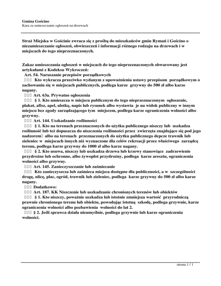 Gmina Gościno Kara za umieszczanie ogłoszeń na drzewach Straż Miejska w Gościnie zwraca się z prośbą do mieszkańców gmin Rymań i Gościno o niezamieszczanie ogłoszeń, obwieszczeń i informacji różnego rodzaju na drzewach i w miejscach do tego nieprzeznaczonych. Zakaz umieszczania ogłoszeń w miejscach do tego nieprzeznaczonych obwarowany jest artykułami z Kodeksu Wykroczeń: Art. 54. Naruszanie przepisów porządkowych Kto wykracza przeciwko wydanym z upoważnienia ustawy przepisom porządkowym o zachowaniu się w miejscach publicznych, podlega karze grzywny do 500 zł albo karze nagany. Art. 63a. Prywatne ogłoszenia § 1. Kto umieszcza w miejscu publicznym do tego nieprzeznaczonym ogłoszenie, plakat, afisz, apel, ulotkę, napis lub rysunek albo wystawia je na widok publiczny w innym miejscu bez zgody zarządzającego tym miejscem, podlega karze ograniczenia wolności albo grzywny. Art. 144. Uszkadzanie roślinności § 1. Kto na terenach przeznaczonych do użytku publicznego niszczy lub uszkadza roślinność lub też dopuszcza do niszczenia roślinności przez zwierzęta znajdujące się pod jego nadzorem albo na terenach przeznaczonych do użytku publicznego depcze trawnik lub zieleniec w miejscach innych niż wyznaczone dla celów rekreacji przez właściwego zarządcę terenu, podlega karze grzywny do 1000 zł albo karze nagany. § 2. Kto usuwa, niszczy lub uszkadza drzewa lub krzewy stanowiące zadrzewienie przydrożne lub ochronne, albo żywopłot przydrożny, podlega karze aresztu, ograniczenia wolności albo grzywny. Art. 145. Zanieczyszczanie lub zaśmiecanie Kto zanieczyszcza lub zaśmieca miejsca dostępne dla publiczności, a w szczególności drogę, ulicę, plac, ogród, trawnik lub zieleniec, podlega karze grzywny do 500 zł albo karze nagany. Dodatkowo: Art. 187. KK Niszczenie lub uszkadzanie chronionych terenów lub obiektów § 1. Kto niszczy, poważnie uszkadza lub istotnie zmniejsza wartość przyrodniczą prawnie chronionego terenu lub obiektu, powodując istotną szkodę, podlega grzywnie, karze ograniczenia wolności albo pozbawienia wolności do lat 2. § 2. Jeśli sprawca działa nieumyślnie, podlega grzywnie lub karze ograniczenia wolności. strona 1 / 1