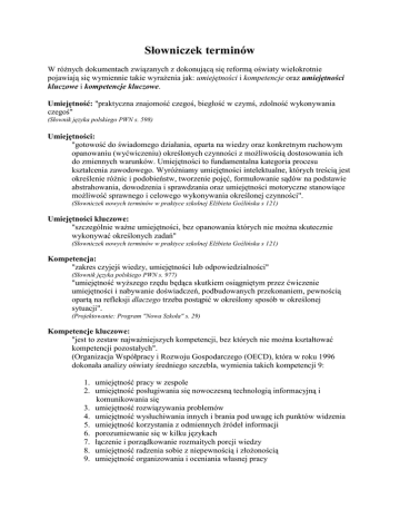 Słowniczek terminów W róŜnych dokumentach związanych z dokonującą się reformą oświaty wielokrotnie pojawiają się wymiennie takie wyraŜenia jak: umiejętności i kompetencje oraz umiejętności kluczowe i kompetencje kluczowe. Umiejętność: "praktyczna znajomość czegoś, biegłość w czymś, zdolność wykonywania czegoś" (Słownik języka polskiego PWN s. 598) Umiejętności: "gotowość do świadomego działania, oparta na wiedzy oraz konkretnym ruchowym opanowaniu (wyćwiczeniu) określonych czynności z moŜliwością dostosowania ich do zmiennych warunków. Umiejętności to fundamentalna kategoria procesu kształcenia zawodowego. WyróŜniamy umiejętności intelektualne, których treścią jest określenie róŜnic i podobieństw, tworzenie pojęć, formułowanie sądów na podstawie abstrahowania, dowodzenia i sprawdzania oraz umiejętności motoryczne stanowiące moŜliwość sprawnego i celowego wykonywania określonej czynności". (Słowniczek nowych terminów w praktyce szkolnej ElŜbieta Goźlińska s 121) Umiejętności kluczowe: "szczególnie waŜne umiejętności, bez opanowania których nie moŜna skutecznie wykonywać określonych zadań" (Słowniczek nowych terminów w praktyce szkolnej ElŜbieta Goźlińska s 121) Kompetencja: "zakres czyjejś wiedzy, umiejętności lub odpowiedzialności" (Słownik języka polskiego PWN s. 977) "umiejętność wyŜszego rzędu będąca skutkiem osiągniętym przez ćwiczenie umiejętności i nabywanie doświadczeń, podbudowanych przekonaniem, pewnością opartą na refleksji dlaczego trzeba postąpić w określony sposób w określonej sytuacji". (Projektowanie: Program "Nowa Szkoła" s. 29) Kompetencje kluczowe: "jest to zestaw najwaŜniejszych kompetencji, bez których nie moŜna kształtować kompetencji pozostałych". (Organizacja Współpracy i Rozwoju Gospodarczego (OECD), która w roku 1996 dokonała analizy oświaty średniego szczebla, wymienia takich kompetencji 9: 1. umiejętność pracy w zespole 2. umiejętność posługiwania się nowoczesną technologią informacyjną i komunikowania się 3. umiejętność rozwiązywania problemów 4. umiejętność wysłuchiwania innych i brania pod uwagę ich punktów widzenia 5. umiejętność korzystania z odmiennych źródeł informacji 6. porozumiewanie się w kilku językach 7. łączenie i porządkowanie rozmaitych porcji wiedzy 8. umiejętność radzenia sobie z niepewnością i złoŜonością 9. umiejętność organizowania i oceniania własnej pracy W Polsce przyjęto 5 kompetencji kluczowych.) A więc kompetencja, to jest umiejętność wyŜszego rzędu lub inaczej: kompetencja, to jest zbiór, czy zestaw pewnych umiejętności. Jeśli stwierdzę, Ŝe umiem ugotować zupę pomidorową, czy zmienić koło w samochodzie, czy znaczy to, Ŝe jestem kompetentnym kucharzem, czy mechanikiem samochodowym? Chyba nie. NaleŜy więc uznać, Ŝe pod stwierdzeniem - kompetentny kucharz - kryje się wiele umiejętności dotyczących gotowania, smaŜenia i pieczenia. A jak to jest w szkole? W czasie lekcji kształtujemy - umiejętności kluczowe - drobne umiejętności, które są składnikami - kompetencji kluczowych - uzyskiwanych, jako efekt procesu kształcenia; są więc one skutkiem wielu długofalowych działań. MoŜna na przykład zauwaŜyć, Ŝe kompetencja porozumiewania się składa się z wielu zintegrowanych umiejętności: czytania, pisania, słuchania, mówienia. W kompetencji, którą osiągamy zawiera się równieŜ nasza refleksja, wiedza, czy postawa. Wszystkie wymienione elementy są wzajemnie powiązane i warunkują osiągane kompetencje.Owe relacje, między kluczowymi umiejętnościami i kompetencjami, moŜna ukazać wyliczając główne składniki kompetencji: • • • system wiedzy teoretyczno-praktycznej, układy, czynności, których podstawę orientacyjną stanowi ta wiedza, podmiotowe uwarunkowania działalności człowieka. Kompetencje kluczowe w nowoczesnej szkole I. Planowanie, organizowanie i ocenianie własnego uczenia się. Kompetencja ta ma słuŜyć temu, aby uczniowie: • • • planowali wykonania zadania, byli świadomi celów i przedmiotów uczenia się, uczyli się świadomie i odpowiedzialnie. Kiedy człowiek się uczy, nieustannie podejmuje decyzje typu: czego i w jakiej kolejności uczyć się, jak wyłapać błędy i luki, co uznać za najwaŜniejsze i jak te najistotniejsze fragmenty wyróŜnić z całości materiału. Obecnie większość decyzji podejmuje w szkole nauczyciel, przekazuje je uczniowi, a więc uczeń uczy się pod dyktando. Trafne podejmowanie decyzji to umiejętność, którą młody człowiek powinien opanować, by w efekcie odciąŜyć nauczyciela z odpowiedzialności za swoją edukację. A więc naleŜy dąŜyć d tego, by uczeń posiadał umiejętność planowania, organizowania, kontrolowania przebiegu i rezultatów oraz doskonalenia własnego uczenia się. Czyli uczymy świadomego i planowego uczenia się. II. Skuteczne porozumiewanie się w róŜnych sytuacjach. Kompetencja ta ma słuŜyć temu, aby uczniowie: • • • • precyzyjnie wyraŜali swoje myśli, nauczyli się słuchać innych, mówili tak, aby byli rozumiani, odczytywali znaki pozawerbalne. Znaczenie umiejętności nawiązywania kontaktów między ludźmi nieustannie rośnie. Komunikują nam, czego się od nas oczekuje, my komunikujemy nasze oczekiwani. Dają nam do zrozumienia, jakie mają intencje, jacy są, informują. My zaś mamy własnych adresatów. Praca, sprawy publiczne i prywatne wymagają umiejętności porozumiewania się co do zamiarów, potrzeb, mości. Jeśli umiemy podzielić się wiedzą, nasze wprawy ułoŜą się lepiej. Innymi słowy, człowiek coraz częściej musi korzystać z umiejętności doprowadzania innych do rozumienia jego komunikatów i rozumienia komunikatów przekazywanych jemu. Czyli uczymy krytycznego rozumienia innych i czynienia siebie zrozumiałym. III. Efektywne współdziałanie w zespole