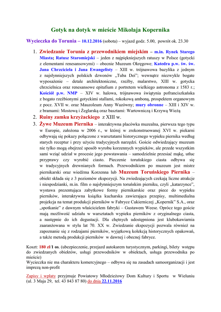 Gotyk na dotyk w mieście Mikołaja Kopernika Wycieczka do Torunia – 10.12.2016 (sobota) – wyjazd godz. 5.00, powrót ok. 23.30 1. Zwiedzanie Torunia z przewodnikiem miejskim – m.in. Rynek Starego Miasta; Ratusz Staromiejski – jeden z najpiękniejszych ratuszy w Polsce (gotycki z elementami renesansowymi) – obecnie Muzeum Okręgowe; Katedra p.w. św. św. Jana Chrzciciela i Jana Ewangelisty – XIII w. trójnawowa bazylika z jednym z najsłynniejszych polskich dzwonów „Tuba Dei”; wewnątrz niezwykle bogate wyposażenie – detale architektoniczne, rzeźby, malarstwo, XIII w. gotycka chrzcielnica oraz renesansowe epitafium z portretem wielkiego astronoma z 1583 r.; Kościół p.w. NMP – XIV w. halowa, trójnawowa świątynia pofranciszkańska z bogato rzeźbionymi gotyckimi stallami, rokokową amboną, prospektem organowym z pocz. XVII w. oraz Mauzoleum Anny Wazówny; mury obronne – XIII i XIV w. z bramami: Mostową i Żeglarską oraz basztami: Wartowniczą i Krzywą Wieżą 2. Ruiny zamku krzyżackiego z XIII w. 3. Żywe Muzeum Piernika – interaktywna placówka muzealna, pierwsza tego typu w Europie, założona w 2006 r., w której w zrekonstruowanej XVI w. piekarni odbywają się pokazy połączone z warsztatami historycznego wypieku piernika według starych receptur i przy użyciu tradycyjnych narzędzi. Goście odwiedzający muzeum nie tylko mogą obejrzeć sposób wyrobu korzennych wypieków, ale przede wszystkim sami wziąć udział w procesie jego powstawania – samodzielnie przesiać mąkę, utłuc przyprawy czy wyrobić ciasto. Pieczenie toruńskiego ciasta odbywa się w tradycyjnych drewnianych formach. Przewodnikiem po muzeum jest mistrz piernikarski oraz wiedźma Korzenna lub Muzeum Toruńskiego Piernika – obiekt składa się z 3 poziomów ekspozycji. Na zwiedzających czekają liczne atrakcje i niespodzianki, m.in. film o najsłynniejszym toruńskim pierniku, czyli „katarzynce”, wystawa prezentująca zabytkowe formy piernikarskie oraz piece do wypieku pierników, interaktywna książka kucharska zawierająca przepisy, multimedialna projekcja na temat produkcji pierników w Fabryce Cukierniczej „Kopernik” S.A., oraz „spotkanie” z dawnym właścicielem fabryki – Gustawem Weese. Oprócz tego goście mają możliwość udziału w warsztatach wypieku pierników z oryginalnego ciasta, a następnie do ich degustacji. Dla chętnych udostępniona jest klubokawiarnia zaaranżowana w stylu lat 70. XX w. Zwiedzanie ekspozycji pozwala również na zapoznanie się z rodzajami pierników, wyjątkową kolekcją historycznych opakowań, a także metodą produkcji pierników w dawnej i obecnej fabryce. Koszt: 180 zł/1 os. (ubezpieczenie, przejazd autokarem turystycznym, parkingi, bilety wstępu do zwiedzanych obiektów, usługi przewodników w obiektach, usługa przewodnika po mieście) Wycieczka nie ma charakteru komercyjnego – odbywa się na zasadach samoorganizacji i jest imprezą non-profit Zapisy i wpłaty przyjmuje Powiatowy Młodzieżowy Dom Kultury i Sportu w Wieluniu (ul. 3 Maja 29, tel. 43 843 87 80) do dnia 22.11.2016