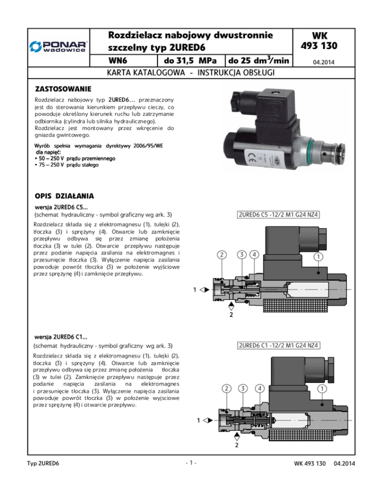 Rozdzielacz nabojowy dwustronnie szczelny typ 2URED6 WN6 do 31,5 MPa do 25 dm3/min KART ARTA KATALOGOWA - INSTRUK RUKCJA OBS OBSŁUGI WK 493 130 04.2014 ZASTOSOWANIE Rozdzielacz nabojowy typ 2 URED6 URED 6 … przeznaczony jest do sterowania kierunkiem przepływu cieczy, co powoduje określony kierunek ruchu lub zatrzymanie odbiornika (cylindra lub silnika hydraulicznego). Rozdzielacz jest montowany przez wkręcenie do gniazda gwintowego. Wyrób spełnia wymagania dyrektywy dyrektywy 2006/95/WE dla napięć: napięć: • 50 – 250 V prądu przemiennego • 75 – 250 V prądu stałego OPIS DZIAŁANIA wersja wersj a 2URED6 C5... (schemat hydrauliczny - symbol graficzny wg ark. 3) 2URED6 C5 -12/2 M1 G24 NZ4 Rozdzielacz składa się z elektromagnesu (1), tulejki (2), tłoczka (3) i sprężyny (4). Otwarcie lub zamknięcie przepływu odbywa się przez zmianę położenia tłoczka (3) w tulei (2). Otwarcie przepływu następuje przez podanie napięcia zasilania na elektromagnes i przesunięcie tłoczka (3). Wyłączenie napięcia zasilania powoduje powrót tłoczka (3) w położenie wyjściowe przez sprężynę (4) i zamknięcie przepływu. 3 2 4 1 1 2 wersja wersj a 2URED6 C1... 2URED6 C1 -12/2 M1 G24 NZ4 (schemat hydrauliczny - symbol graficzny wg ark. 3) Rozdzielacz składa się z elektromagnesu (1), tulejki (2), tłoczka (3) i sprężyny (4). Otwarcie lub zamknięcie przepływu odbywa się przez zmianę położenia tłoczka (3) w tulei (2). Zamknięcie przepływu następuje przez podanie napięcia zasilania na elektromagnes i przesunięcie tłoczka (3). Wyłączenie napięcia zasilania powoduje powrót tłoczka (3) w położenie wyjsciowe przez sprężynę (4) i otwarcie przepływu. 3 2 4 1 1 2 Typ 2URED6 -1- WK 493 130 04.2014 DANE TECHNICZNE Rodzaj cieczy hydraulicznej Wymag Wymaga agana klasa czyst c zysto zyst ości oleju leju Lepkość nominalna cieczy hydraulicznej Zakres lepkości cieczy hydraulicznej Zakres temperatury cieczy (w zbiorniku) Zakres temperatury otoczenia k a na ł 1 Max ciś ci śnien ienie pracy pr acy k a na ł 2 Moc elektromagnesu Stop Stopie ochro opień ień ochr hrony Masa olej mineralny IS ISO 4406 klasa 20/18/15 o 37 mm 2 /s w temperaturze 55 C 2,8 do 380 mm 2/s zalecany 40 oC do 55 oC max -20o C do +70 oC o o - 20 C do +50 C 21 M P a 31,5 1, 5 MPa 26 W IP 65 0,32 kg WYMAGANIA MONTAŻU I EKSPLOATACJI 1. Rozdzielacz należy użytkować tylko w pełni sprawny i prawidłowo przyłączony do instalacji instalacji elektrycznej. Przyłączanie lub lub odłączanie od instalacji elektrycznej musi być wykonywane przez wykwalifikowany personel. 2. Łączówka uziemiająca ( ) musi być połączona z przewodem ochronnym (PE PE ) w instalacji zasilającej zgodnie z odpowiednimi przepisami. 3. Wtyczka elektromagnesu powinna przylegać dokładnie do gniazda i należy ją zabezpieczyć poprzez dokręcenie wkręta mocującego do oporu. Zabrania się eksploatacji rozdzielacza, jeżeli wtyczka nie jest zabezpieczona i nie jest zapewniona szczelność i odpowiedni zacisk kabla w dławnicy wtyczki. 4. Podczas eksploatacji należy utrzymać zalecaną w niniejszej Karcie Katalogowej - Instrukcji Obsługi lepkość cieczy hydraulicznej. 5. Aby zapewnić bezawaryjną i bezpieczną pracę rozdzielacza należy systematycznie sprawdzać: sprawdzać • stan połączenia elektrycznego • działanie zaworu • czystość cieczy hydraulicznej 6. Ze względu na nagrzewanie się cewki elektromagnesu elektromagnesu i korpusu rozdzielacza rozdzielacza do wysokiej temperatury rozd rozdzielacz powinien być umiejscowiony tak, tak aby wyeliminować możliwość przypadkowego kontaktu z cewką lub korpusem podczas eksploatacji lub należy przewidzieć odpowiednie osłony zgodnie z wymaganiami norm europejskich: europejskich PN - EN ISO 13732 -1 i PN - EN 982. 982. 7. Dla zapewnienia szczelności przyłącza rozdzielacza do układu hydraulicznego należy przestrzegać wymiarów pierścieni uszczelniających, uszczelniających momentów dokręcenia i parametrów pracy rozdzielacza podanych w niniejszej Karcie Katalogowej - Instrukcji Obsługi. Obsługi. 8. Obsługujący rozdzielacz musi być zapoznany z treścią niniejszej Karty Katalogowej - Instrukcji Obsługi. Obsługi SCHEMATY Symbol graficzny rozdzielacza typ 2URED6... 2 2 2 1 1 1 wersja 2URED6C1... WK 493 130 04.2014 wersja 2URED6C5... -2- wersja 2URED6C5...N... Typ 2URED6 CHARAKTERYSTYKI o (dla lepkości cieczy hydraulicznej ν = 41 mm 2 /s i temperatury t = 50 C ) Chara arakterystyk terysty ka opor oporó orów przep pr zepły zepływ ływu wykres charakterystyki ∆p od Q 2,0 2,0 ∆p [MPa [MPa]] 1,6 1,6 1,2 1,2 0,8 0,8 0,4 0,4 0 6 12 18 Q [dm 3/min ] 24 30 Chara arakterystyk terysty ki zakresów resó w dz działania (przepływów granicznych) wykresy charakterystyk p-Q wersja 2URED6C5... 30 p [MPa [MPa]] 20 droga przepływu 1 15 → 2 droga przepływu 2 →1 droga przepływu 1 → 2 droga przepływu 2 → 1 10 5 0 5 10 15 Q [dm 3/min ] 20 25 30 wykresy charakterystyk p-Q wersja 2URED6C1... 30 p [MPa [MPa]] 20 15 10 5 0 Typ 2URED6 4 8 12 Q [dm 3/min ] -5- 16 20 25 WK 493 130 04.2014 WYMIARY GABARYTOWE I PRZYŁĄCZENIOWE wersja wersj a sta st andard ndardo ardowa 2URED6... 4 1 2 39 19 O O M22x1,5 53 3 30 S27 107 moment dokręcenia Md = 50 - 55 Nm 1 - Wtyczka typ ISO 4400 (DIN 43650 - A) 2 - Przycisk ręcznego przesterowania (występuje tylko wersji 2URED6 C5...) 3 - Pierścień uszczelniający o-ri -ring 18 x 2,6 2,6 4 - Pierścień uszczelniający o-r o -ri -ring 15,6 5,6 x 1,7 1, 78 WK 493 130 04.2014 -3- Typ 2URED6 WYMIARY GABARYTOWE I PRZYŁĄCZENIOWE wersja ersja standard andardo dardowa 2URED6... gni gn iazdo zdo przy pr zył zyłącze ączen zeniowe M-0 M-06-2 (M22 x 1,5; 2-drogowe) moment dokręcenia Md = 50 - 55 Nm aO 0,025 - dotyczy wszystkich średnic otworu głównego i faz O O 28 +0,15 23 0 O 0,025 A M22 x 1.5 +0,05 19 0 n 0,5 * 1,25 a 21 15 13 A O 30 ° 2,5 9,5 (max) 33 32 2 9,5 (max) 1 O 1 szczegół a 1,25 0,5 X 45° 