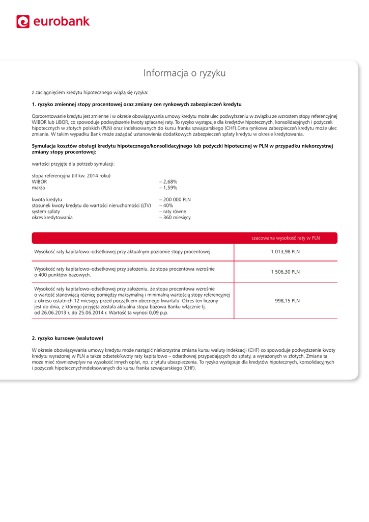 Informacja o ryzyku z zaciągnięciem kredytu hipotecznego wiążą się ryzyka: 1. ryzyko zmiennej stopy procentowej oraz zmiany cen rynkowych zabezpieczeń kredytu Oprocentowanie kredytu jest zmienne i w okresie obowiązywania umowy kredytu może ulec podwyższeniu w związku ze wzrostem stopy referencyjnej WIBOR lub LIBOR, co spowoduje podwyższenie kwoty spłacanej raty. To ryzyko występuje dla kredytów hipotecznych, konsolidacyjnych i pożyczek hipotecznych w złotych polskich (PLN) oraz indeksowanych do kursu franka szwajcarskiego (CHF).Cena rynkowa zabezpieczeń kredytu może ulec zmianie. W takim wypadku Bank może zażądać ustanowienia dodatkowych zabezpieczeń spłaty kredytu w okresie kredytowania. Symulacja kosztów obsługi kredytu hipotecznego/konsolidacyjnego lub pożyczki hipotecznej w PLN w przypadku niekorzystnej zmiany stopy procentowej: wartości przyjęte dla potrzeb symulacji: stopa referencyjna (III kw. 2014 roku) WIBOR marża – 2,68% – 1,59% kwota kredytu stosunek kwoty kredytu do wartości nieruchomości (LTV) system spłaty okres kredytowania – 200 000 PLN – 40% – raty równe – 360 miesięcy szacowana wysokość raty w PLN Wysokość raty kapitałowo–odsetkowej przy aktualnym poziomie stopy procentowej. 1 013,98 PLN Wysokość raty kapitałowo–odsetkowej przy założeniu, że stopa procentowa wzrośnie o 400 punktów bazowych. 1 506,30 PLN Wysokość raty kapitałowo–odsetkowej przy założeniu, że stopa procentowa wzrośnie o wartość stanowiącą różnicę pomiędzy maksymalną i minimalną wartością stopy referencyjnej z okresu ostatnich 12 miesięcy przed początkiem obecnego kwartału. Okres ten liczony jest do dnia, z którego przyjęta została aktualna stopa bazowa Banku włącznie tj. od 26.06.2013 r. do 25.06.2014 r. Wartość ta wynosi 0,09 p.p. 998,15 PLN 2. ryzyko kursowe (walutowe) W okresie obowiązywania umowy kredytu może nastąpić niekorzystna zmiana kursu waluty indeksacji (CHF) co spowoduje podwyższenie kwoty kredytu wyrażonej w PLN a także odsetek/kwoty raty kapitałowo – odsetkowej przypadających do spłaty, a wyrażonych w złotych. Zmiana ta może mieć równieżwpływ na wysokość innych opłat, np. z tytułu ubezpieczenia. To ryzyko występuje dla kredytów hipotecznych, konsolidacyjnych i pożyczek hipotecznychindeksowanych do kursu franka szwajcarskiego (CHF).