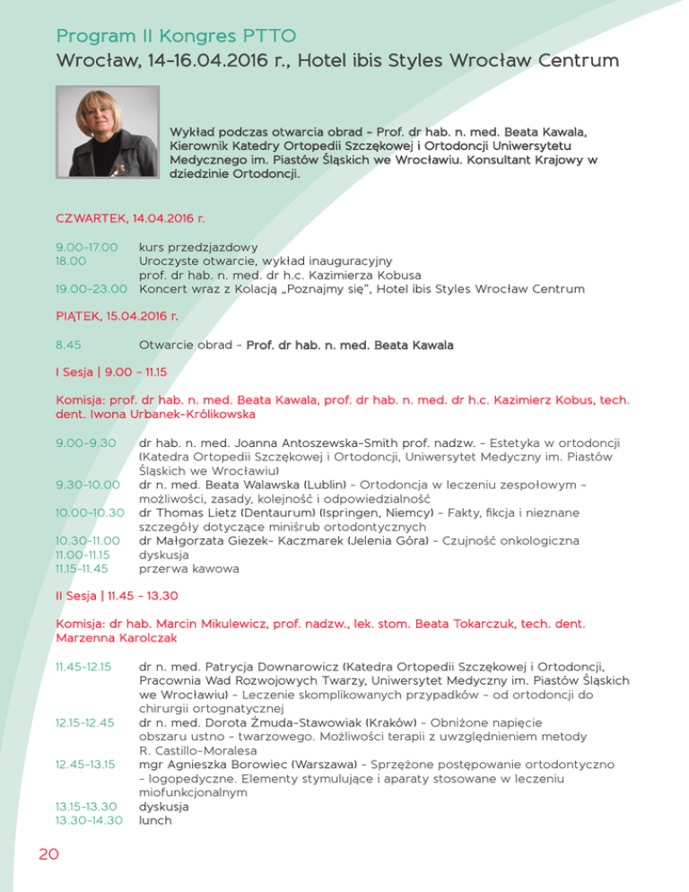 Program II Kongres PTTO Wrocław, 14-16.04.2016 r., Hotel ibis Styles Wrocław Centrum Wykład podczas otwarcia obrad - Prof. dr hab. n. med. Beata Kawala, Kierownik Katedry Ortopedii Szczękowej i Ortodoncji Uniwersytetu Medycznego im. Piastów Śląskich we Wrocławiu. Konsultant Krajowy w dziedzinie Ortodoncji. CZWARTEK, 14.04.2016 r. 9.00-17.00 kurs przedzjazdowy 18.00Uroczyste otwarcie, wykład inauguracyjny prof. dr hab. n. med. dr h.c. Kazimierza Kobusa 19.00-23.00 Koncert wraz z Kolacją „Poznajmy się”, Hotel ibis Styles Wrocław Centrum PIĄTEK, 15.04.2016 r. 8.45 Otwarcie obrad - Prof. dr hab. n. med. Beata Kawala I Sesja | 9.00 - 11.15 Komisja: prof. dr hab. n. med. Beata Kawala, prof. dr hab. n. med. dr h.c. Kazimierz Kobus, tech. dent. Iwona Urbanek-Królikowska 9.00-9.30 dr hab. n. med. Joanna Antoszewska-Smith prof. nadzw. - Estetyka w ortodoncji (Katedra Ortopedii Szczękowej i Ortodoncji, Uniwersytet Medyczny im. Piastów Śląskich we Wrocławiu) 9.30-10.00 dr n. med. Beata Walawska (Lublin) - Ortodoncja w leczeniu zespołowym możliwości, zasady, kolejność i odpowiedzialność 10.00-10.30 dr Thomas Lietz (Dentaurum) (Ispringen, Niemcy) - Fakty, fikcja i nieznane szczegóły dotyczące miniśrub ortodontycznych 10.30-11.00 dr Małgorzata Giezek- Kaczmarek (Jelenia Góra) - Czujność onkologiczna 11.00-11.15 dyskusja 11.15-11.45 przerwa kawowa II Sesja | 11.45 - 13.30 Komisja: dr hab. Marcin Mikulewicz, prof. nadzw., lek. stom. Beata Tokarczuk, tech. dent. Marzenna Karolczak 11.45-12.15dr n. med. Patrycja Downarowicz (Katedra Ortopedii Szczękowej i Ortodoncji, Pracownia Wad Rozwojowych Twarzy, Uniwersytet Medyczny im. Piastów Śląskich we Wrocławiu) - Leczenie skomplikowanych przypadków - od ortodoncji do chirurgii ortognatycznej 12.15-12.45 dr n. med. Dorota Żmuda-Stawowiak (Kraków) - Obniżone napięcie obszaru ustno - twarzowego. Możliwości terapii z uwzględnieniem metody R. Castillo-Moralesa 12.45-13.15 mgr Agnieszka Borowiec (Warszawa) - Sprzężone postępowanie ortodontyczno - logopedyczne. Elementy stymulujące i aparaty stosowane w leczeniu miofunkcjonalnym 13.15-13.30 dyskusja 13.30-14.30 lunch 20 III Sesja | 14.30 - 17.00 Komisja: dr n. med. Beata Walawska, dr n. med. Patrycja Downarowicz, tech. dent. Łukasz Grodziński 14.30-15.00 dr n. med. Michał Sarul (Katedra Ortopedii Szczękowej i Ortodoncji, Uniwersytet Medyczny im. Piastów Śląskich we Wrocławiu) - Nasilenie wady zgryzu, a współpraca pacjentów leczonych aparatami wyjmowanymi 15.00-15.30 dr n. med. Izabella Doniec-Zawidzka (Fabryka Zdrowego Uśmiechu, Szczecin) - Metoda pośredniego klejenia zamków - sposób na efektywną pracę i usprawnienie dnia codziennego w gabinecie ortodontycznym 15.30-16.00 tech. dent. Guido Pedroli (Szkoła Dentystyczna, Uniwersytet w Zurychu, Szwajcaria) - Retencja w ortodoncji - przegląd aparatów retencyjnych 16.00-16.30 tech. dent. Andrea Johnson (Derby, Wielka Brytania) - Dziwne i wspaniałe wzornictwo aparatów ortodontycznych (Weird & Wonderful Appliance Design) 16.30-17.00 Wystąpienia przedstawicieli Międzynarodowego Towarzystwa Techniki Ortodontycznej (GK), Brytyjskiego Towarzystwa Techników Ortodontycznych (OTA) i Włoskiego Towarzystwa Techniki Dentystycznej 17.00-18.00 Walne zebranie 20.00 Wieczór pełen niespodzianek, TIMES EVENT CENTER, Sponsorem występu artystycznego jest firma Denon Dental SOBOTA, 16.04.2016 r. IV Sesja | 9.00-10.30 Komisja: dr n. med. Michał Sarul, dr Szymon Chojnowski, tech. dent. Andrzej Baj 9.00-9.30 dr n. med. Maria Iwanecka-Zduńczyk (Zakład Ortodoncji, Katedra Dysfunkcji Narządu Żucia i Ortodoncji, Śląski Uniwersytet Medyczny w Katowicach) - Zaburzenia zębowe w aspekcie ortodontycznym 9.30-10.00 dr n. med. Małgorzata Kuc-Michalska (Podyplomowe Studium Ortologopedii i Glottodydaktyki, Uniwersytet Śląski w Katowicach) - Leczenie III klasy szkieletowej w różnych okresach rozwojowych od 4 do 64 roku życia. Przegląd różnych aparatów i technik leczenia w materiale własnym 10.00-10.30 dr n. med. Jakub Malinowski (Bio-Orto, Wrocław) - Wstępne leczenie w okresie zgryzu mieszanego. Omówienie postępowania ortodontycznego i stosowanych aparatów ortodontycznych 10.30-11.00 przerwa kawowa V Sesja | 11.00-13.30 Komisja: dr n. med. Maria Iwanecka-Zduńczyk, dr n. med. Jakub Malinowski, tech. dent. Helena Frączek 11.00-11.30 dr Szymon Chojnowski (Wrocław) - Techniki cyfrowe w ortodoncji 11.30-12.00 tech. dent. Niel Nairn (Glasgow, Wielka Brytania) - Skanowanie 3D Pipeline (The 3D Scanning Pipeline) 12.00-12.30 tech. dent. Emanuele Paoletto (Thiene-Vicenza, Włochy) - Zakotwienie szkieletowe podniebienne: Nowa technologia cyfrowa 3D do wprowadzania miniimplantów (Palatal skeletal Anchorage: New 3D digital technology for miniscrew insertion guide) 12.30-13.00 Thomas Bussmann (Lucerna, Szwajcaria) - Cyfrowa ortodoncja w laboratorium technicznym 21 13.00-13.30 m gr inż. Damian Kowalewski (Inżynier Serwisu Optident) - Nowoczesne technologie cyfrowe w stomatologii. Zastosowanie Tomografii 3D CBCT w Ortodoncji; mgr Zbigniew Sowiński (Specjalista CS Solutions CAD/CAM Optident) Wykorzystanie systemów CAD/CAM w Ortodoncji 13.30-14.30 lunch Pokazy praktyczne | 14.30-17.30 Sesje równoległe, każda sesja odbędzie się dwa razy. 1. Polkard/Dentaurum, tech. dent. Bartłomiej Gordon - Techniki łączenia metali (zgrzewanie, spawanie) 2. Optident, mgr Zbigniew Sowiński, Specjalista CS Solutions CAD/CAM, mgr inż. Damian Kowalewski, Inżynier Serwisu - Nowoczesne technologie cyfrowe w ortodoncji i protetyce. Praktyczne wykorzystanie systemów CAD / CAM w Praktyce Ortodontycznej 3. t ech. dent. Łukasz Grodziński - Dystalizacja - nowoczesne i skuteczne aparaty; firma Marrodent – aparat do dystalizacji Frog 2 4. mgr Łukasz Neć - Kalkulacja kosztów w działalności gospodarczej pracowni ortodontycznej 5. tech. dent. Andrzej Baj - Płytka Schwarza i jej modyfikacje 6. Denon Dental, Witold Fudali i Micha