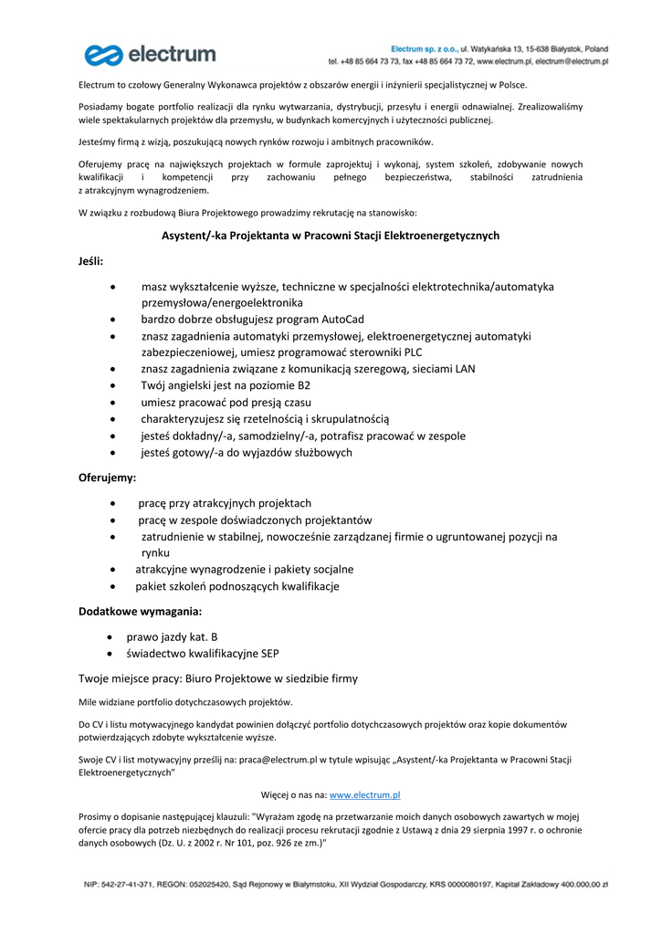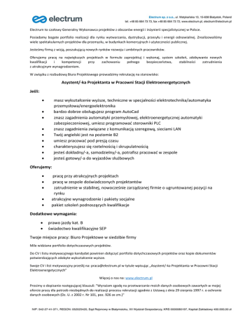 Electrum to czołowy Generalny Wykonawca projektów z obszarów energii i inżynierii specjalistycznej w Polsce. Posiadamy bogate ogate portfolio realizacji dla rynku wytwarzania, dystrybucji, przesyłu i energii odnawialnej odnawialnej. Zrealizowaliśmy wiele spektakularnych projektów dla przemysłu, w budynkach komercyjnych komercyjnych i użyteczności publicznej. Jesteśmy firmą z wizją, poszukującą nowych rynków rozwoju i ambitnych pracowników. Oferujemy pracę na największych szych projektach w formule zaprojektuj i wykonaj, system szkoleń, zdobywanie nowych kwalifikacji i kompetencji przy zachowaniu pełnego bezpieczeństwa, stabilności zatrudnienia z atrakcyjnym wynagrodzeniem. W związku z rozbudową Biura Projektowego prowadzimy prowadzi rekrutację na stanowisko: Asystent/-ka Projektanta w Pracowni Stacji Elektroenergetycznych Jeśli: masz wykształcenie wyższe, techniczne w specjalności elektrotechnika/automatyka przemysłowa/energoelektronika bardzo dobrze obsługujesz program AutoCad Au znasz zagadnienia automatyki przemysłowej, elektroenergetycznej automatyki zabezpieczeniowej, umiesz programować sterowniki PLC znasz zagadnienia związane z komunikacją szeregową, sieciami LAN Twój angielski jest na poziomie B2 umiesz pracować racować pod presją czasu charakteryzujesz się rzetelnością i skrupulatnością jesteś dokładny/-a, a, samodzielny/-a, samodzielny/ potrafisz pracować w zespole jesteś gotowy/-a do wyjazdów służbowych Oferujemy: pracę przy atrakcyjnych projektach pracę w zespole doświadczonych projektantów zatrudnienie w stabilnej, nowocześnie zarządzanej firmie o ugruntowanej pozycji na rynku atrakcyjne wynagrodzenie i pakiety socjalne pakiet szkoleń podnoszących kwalifikacje Dodatkowe wymagania: prawo jazdy kat. B świadectwo iadectwo kwalifikacyjne SEP Twoje miejsce pracy: Biuro Projektowe w siedzibie firmy Mile widziane portfolio dotychczasowych projektów. projektów Do CV i listu motywacyjnego kandydat powinien dołączyć portfolio dotychczasowych projektów oraz kopie dokumentów potwierdzających zających zdobyte wykształcenie wyższe. Swoje CV i list motywacyjny prześlij na: [email protected] w tytule wpisując „Asystent/-ka „Asystent/ ka Projektanta w Pracowni Stacji Elektroenergetycznych” Więcej o nas na: www.electrum.pl Prosimy simy o dopisanie następującej klauzuli: "Wyrażam zgodę na przetwarzanie moich danych osobowych zawartych w mojej ofercie pracy dla potrzeb niezbędnych do realizacji procesu rekrutacji zgodnie z Ustawą z dnia 29 sierpnia 1997 r. o ochronie danych osobowych (Dz. U. z 2002 r. Nr 101, poz. 926 ze zm.)"