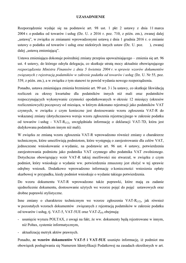 UZASADNIENIE Rozporządzenie wydaje się na podstawie art. 98 ust. 1 pkt 2 ustawy z dnia 11 marca 2004 r. o podatku od towarów i usług (Dz. U. z 2016 r. poz. 710, z późn. zm.), zwanej dalej „ustawą”, w związku ze zmianami wprowadzonymi ustawą z dnia 1 grudnia 2016 r. o zmianie ustawy o podatku od towarów i usług oraz niektórych innych ustaw (Dz. U. poz. ), zwanej dalej „ustawą zmieniającą”. Ustawa zmieniająca dokonuje pośredniej zmiany przepisu upoważniającego – zmienia się art. 96 ust. 4 ustawy, do którego odsyła delegacja, co skutkuje utratą mocy aktualnie obowiązującego rozporządzenia Ministra Finansów z dnia 5 kwietnia 2004 r. w sprawie wzorów dokumentów związanych z rejestracją podatników w zakresie podatku od towarów i usług (Dz. U. Nr 55, poz. 539, z późn. zm.), a w związku z tym stanowi to powód wydania nowego rozporządzenia. Ponadto, ustawa zmieniająca zmienia brzmienie art. 99 ust. 3 i 3a ustawy, co skutkuje likwidacją rozliczeń za okresy kwartalne dla podatników innych niż mali oraz podatników rozpoczynających wykonywanie czynności opodatkowanych w okresie 12 miesięcy (okresów rozliczeniowych) począwszy od miesiąca, w którym dokonano rejestracji jako podatników VAT czynnych, w związku z czym konieczne jest dostosowanie wzoru zgłoszenia VAT-R do wskazanej zmiany (dotychczasowa wersja wzoru zgłoszenia rejestracyjnego w zakresie podatku od towarów i usług - VAT-R(12), uwzględniała informację o deklaracji VAT-7D, która jest dedykowana podatnikom innym niż mali). W związku ze zmianą wzoru zgłoszenia VAT-R wprowadzono również zmiany o charakterze technicznym, które umożliwiają podmiotom, które występują o zarejestrowanie dla celów VAT, jednoczesne wnioskowanie o wydanie, na podstawie art. 96 ust. 4 ustawy, potwierdzenia zarejestrowania podmiotu jako podatnika VAT czynnego albo podatnika VAT zwolnionego. Dotychczas obowiązujący wzór VAT-R takiej możliwości nie stwarzał, w związku z czym podmiot, który wnioskuje o wydanie ww. potwierdzenia zmuszony jest złożyć w tej sprawie odrębny wniosek. Dodatkowo wprowadzono informację o konieczności wniesienia opłaty skarbowej w przypadku, kiedy podmiot wnioskuje o wydanie takiego potwierdzenia. Do wzoru dokumentu VAT-R wprowadzono także poprawki, które mają za zadanie ujednolicenie dokumentu, dostosowanie użytych we wzorze pojęć do pojęć ustawowych oraz drobne poprawki stylistyczne. Inne zmiany o charakterze technicznym we wzorze zgłoszenia VAT-R(12), jak również w pozostałych wzorach dokumentów związanych z rejestracją podatników w zakresie podatku od towarów i usług, tj. VAT-5, VAT-5UE oraz VAT-Z(4) obejmują: - usunięcie wyrazu POLTAX, z uwagi na fakt, że ww. dokumenty będą rejestrowane w innym, niż Poltax, systemie informatycznym, - aktualizację metryk aktów prawnych. Ponadto, ze wzorów dokumentów VAT-5 i VAT-5UE usunięto informację, iż podmiot ma obowiązek posługiwania się Numerem Identyfikacji Podatkowej na zasadach określonych w art. 96 ust. 11 ustawy z uwagi na to, że powoływany przepis został uchylony przez art. 1 pkt 43 lit. e) ustawy z dnia 7 grudnia 2012 r. zmieniającej ustawę (Dz. U. z 2013 r. poz. 35). Z wzoru VAT5UE usunięto informację dotyczącą dnia rejestracji podatnika. W zgłoszeniu o zaprzestaniu wykonywania czynności podlegających opodatkowaniu podatkiem od towarów i usług - VAT-Z(4), usunięto niektóre z informacji objętych dotychczasowym wzorem (praktyka stosowania wzoru VAT-Z wskazuje, że informacje te są zbędne - zbyt duża szczegółowość), natomiast dodano pouczenie o odpowiedzialności przewidzianej w Kodeksie karnym skarbowym w przypadku podania, przez podatnika, nieprawdy lub zatajenia prawdy i przez to narażenie podatku na uszczuplenie. Projektowane rozporządzenie zmienia wszystkie wzory dokumentów związanych z rejestracją podatników w zakresie podatku od towarów i usług: VAT-R, VAT-5, VAT-5UE, VAT-Z. Nowe wzory VAT-R(13), VAT-5(2), VAT-5UE(2) i VAT-Z(5), zostały oparte na dotychczasowych wzorach określonych na podstawie rozporządzenia Ministra Finansów z dnia 5 kwietnia 2004 r. w sprawie wzorów dokumentów związanych z rejestracją podatników w zakresie podatku od towarów i usług. Uszczegółowiając opisane wcześniej zmiany: A. Do wzoru zgłoszenia rejestracyjnego w zakresie podatku od towarów i usług VAT-R(12) wprowadzono następujące zmiany: 1) W części A. Cel i miejsce złożenia zgłoszenia oraz informacja dotycząca właściwości naczelnika urzędu skarbowego: ► w poz. 9 zastąpiono wyrazy: „urząd skarbowy” wyrazami: „naczelnik urzędu skarbowego” w celu zachowania spójności z poprzednimi pozycjami wzoru dokumentu, w których jest powoływany organ podatkowy; analogiczną zmianę wprowadzono do odnośnika 1); 2) W części C.1. Okoliczności określające obowiązek podatkowy: ► w poz. 47 pkt 1 i 2 zastąpiono wyrazy: „usług taksówkowych” wyrazami: „usług taksówek osobowych” z uwagi na to, że pojęcie to funkcjonuje w ustawie, 3) W części C.2. Informacje dotyczące składania deklaracji: ► w poz. 52: usunięto wyrazy „VAT-7D, w przypadkach, o których mowa w art. 99 ust. 3 ustawy”; 4) Wprowadzono część D. „Wniosek o potwierdzenie zarejestrowania podmiotu jako podatnika VAT (art. 96 ust. 4 ustawy)”, która zawiera wiersz: ► „Podatnik wnioskuje o wydanie potwierdzenia zarejestrowania jako podatnika VAT czynnego albo podatnika VAT zwolnionego5) (zaznaczyć właściwy kwadrat)”, który odnosi się do poz. 64, w której należy wskazać: kwadrat „1.tak” albo kwadrat „2.nie”; W związku z powyższym dodano odnośnik 5) w brzmieniu: „Zaznaczenie w poz. 64 kwadratu 1 skutkuje koniecznością wniesienia opłaty skarbowej, o której mowa w Części I. pkt 16 załącznika do ustawy z dnia 16 listopada 2006 r. o opłacie skarbowej (Dz. U. z 2016 r. poz. 1827).” W związku z ww. zamianami