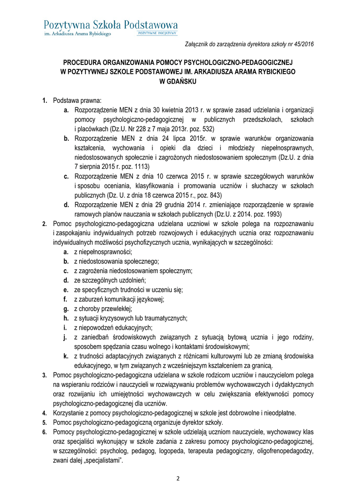 Załącznik do zarządzenia dyrektora szkoły nr 45/2016 PROCEDURA ORGANIZOWANIA POMOCY PSYCHOLOGICZNO-PEDAGOGICZNEJ W POZYTYWNEJ SZKOLE PODSTAWOWEJ IM. ARKADIUSZA ARAMA RYBICKIEGO W GDAŃSKU 1. Podstawa prawna: a. Rozporządzenie MEN z dnia 30 kwietnia 2013 r. w sprawie zasad udzielania i organizacji pomocy psychologiczno-pedagogicznej w publicznych przedszkolach, szkołach i placówkach (Dz.U. Nr 228 z 7 maja 2013r. poz. 532) b. Rozporządzenie MEN z dnia 24 lipca 2015r. w sprawie warunków organizowania kształcenia, wychowania i opieki dla dzieci i młodzieży niepełnosprawnych, niedostosowanych społecznie i zagrożonych niedostosowaniem społecznym (Dz.U. z dnia 7 sierpnia 2015 r. poz. 1113) c. Rozporządzenie MEN z dnia 10 czerwca 2015 r. w sprawie szczegółowych warunków i sposobu oceniania, klasyfikowania i promowania uczniów i słuchaczy w szkołach publicznych (Dz. U. z dnia 18 czerwca 2015 r., poz. 843) d. Rozporządzenie MEN z dnia 29 grudnia 2014 r. zmieniające rozporządzenie w sprawie ramowych planów nauczania w szkołach publicznych (Dz.U. z 2014. poz. 1993) 2. Pomoc psychologiczno-pedagogiczna udzielana uczniowi w szkole polega na rozpoznawaniu i zaspokajaniu indywidualnych potrzeb rozwojowych i edukacyjnych ucznia oraz rozpoznawaniu indywidualnych możliwości psychofizycznych ucznia, wynikających w szczególności: a. z niepełnosprawności; b. z niedostosowania społecznego; c. z zagrożenia niedostosowaniem społecznym; d. ze szczególnych uzdolnień; e. ze specyficznych trudności w uczeniu się; f. z zaburzeń komunikacji językowej; g. z choroby przewlekłej; h. z sytuacji kryzysowych lub traumatycznych; i. z niepowodzeń edukacyjnych; j. z zaniedbań środowiskowych związanych z sytuacją bytową ucznia i jego rodziny, sposobem spędzania czasu wolnego i kontaktami środowiskowymi; k. z trudności adaptacyjnych związanych z różnicami kulturowymi lub ze zmianą środowiska edukacyjnego, w tym związanych z wcześniejszym kształceniem za granicą. 3. Pomoc psychologiczno-pedagogiczna udzielana w szkole rodzicom uczniów i nauczycielom polega na wspieraniu rodziców i nauczycieli w rozwiązywaniu problemów wychowawczych i dydaktycznych oraz rozwijaniu ich umiejętności wychowawczych w celu zwiększania efektywności pomocy psychologiczno-pedagogicznej dla uczniów. 4. Korzystanie z pomocy psychologiczno-pedagogicznej w szkole jest dobrowolne i nieodpłatne. 5. Pomoc psychologiczno-pedagogiczną organizuje dyrektor szkoły. 6. Pomocy psychologiczno-pedagogicznej w szkole udzielają uczniom nauczyciele, wychowawcy klas oraz specjaliści wykonujący w szkole zadania z zakresu pomocy psychologiczno-pedagogicznej, w szczególności: psycholog, pedagog, logopeda, terapeuta pedagogiczny, oligofrenopedagodzy, zwani dalej „specjalistami”. 2 7. Pomoc psychologiczno-pedagogiczna jest organizowana i udzielana we współpracy z: a. b. c. d. e. 8. 9. 10. 11. 12. 13. 14. rodzicami uczniów; poradniami psychologiczno-pedagogicznymi, w tym poradniami specjalistycznymi; placówkami doskonalenia nauczycieli; innymi szkołami i placówkami; organizacjami pozarządowymi oraz innymi instytucjami działającymi na rzecz rodziny, dzieci i młodzieży Pomoc psychologiczno-pedagogiczna w szkole i jest udzielana na wniosek z inicjatywy: a. ucznia; b. rodziców ucznia; c. dyrektora szkoły; d. nauczyciela, wychowawcy grupy wychowawczej lub specjalisty, prowadzących zajęcia z uczniem; e. pielęgniarki środowiska nauczania i wychowania lub higienistki szkolnej; f. poradni; g. asystenta edukacji romskiej; h. pomocy nauczyciela; i. pracownika socjalnego; j. asystenta rodziny; k. kuratora sądowego. Uczeń, rodzice ucznia, pielęgniarka środowiska nauczania i wychowania lub higienistka szkolna, poradnia, asystent edukacji romskiej, pracownik socjalny, asystent rodziny, kurator sądowy składają wniosek do sekretariatu szkoły Załącznik Nr 1. dyrektora szkoły, nauczyciele, wychowawcy grupy wychowawczej lub specjalista, prowadzący zajęcia z uczniem, pomoc nauczyciela składają wniosek w programie EdPlan dostępny po zalogowaniu do dziennika elektronicznego LIBRUS. W szkole pomoc psychologiczno-pedagogiczna jest udzielana w trakcie bieżącej pracy z uczniem oraz w formie: a. zajęć rozwijających uzdolnienia; b. zajęć dydaktyczno-wyrównawczych; c. warsztatów; d. porad i konsultacji e. zajęć specjalistycznych: - korekcyjno-kompensacyjnych, - logopedycznych, - socjoterapeutycznych, - innych zajęć o charakterze terapeutycznym; W szkole pomoc psychologiczno-pedagogiczna jest udzielana rodzicom uczniów i nauczycielom w formie porad, konsultacji, warsztatów i szkoleń. Zajęcia rozwijające uzdolnienia organizuje się dla uczniów szczególnie uzdolnionych oraz prowadzi się przy wykorzystaniu aktywnych metod pracy. Liczba uczestników zajęć nie może przekraczać 8. Zajęcia dydaktyczno-wyrównawcze organizuje się dla uczniów mających trudności w nauce, w szczególności w spełnianiu wymagań edukacyjnych wynikających z podstawy programowej 3 15. 16. 17. 18. 19. 20. 21. 22. 23. 24. 25. 26. 27. kształcenia ogólnego dla danego etapu edukacyjnego. Liczba uczestników zajęć nie może przekraczać 8. Zajęcia korekcyjno-kompensacyjne organizuje się dla uczniów z zaburzeniami i odchyleniami rozwojowymi lub specyficznymi trudnościami w uczeniu się. Liczba uczestników zajęć nie może przekraczać 5. Zajęcia logopedyczne organizuje się dla uczniów z zaburzeniami mowy, które powodują zaburzenia komunikacji językowej oraz utrudniają naukę. Liczba uczestników zajęć nie może przekraczać 4. Zajęcia socjoterapeutyczne oraz inne zajęcia o charakterze terapeutycznym organizuje się dla uczniów z dysfunkcjami i zaburzeniami utrudniającymi funkcjonowanie społeczne. Liczba uczestników zajęć nie może przekraczać 10. Godzina zajęć rozwijających uzdolnienia i zajęć dydaktyczno-wyrównawczych trwa 45 minut, a godzina zajęć specjalistycznych
