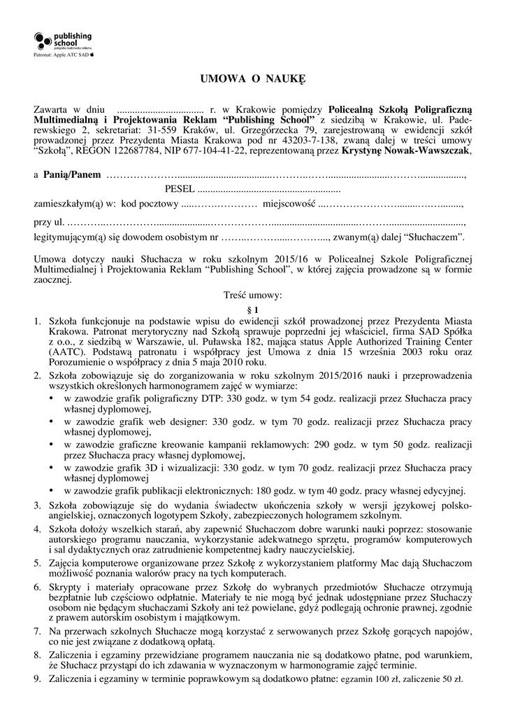 Patronat: Apple ATC SAD UMOWA O NAUKĘ Zawarta w dniu .................................. r. w Krakowie pomiędzy Policealną Szkołą Poligraficzną Multimedialną i Projektowania Reklam “Publishing School” z siedzibą w Krakowie, ul. Paderewskiego 2, sekretariat: 31-559 Kraków, ul. Grzegórzecka 79, zarejestrowaną w ewidencji szkół prowadzonej przez Prezydenta Miasta Krakowa pod nr 43203-7-138, zwaną dalej w treści umowy “Szkołą”, REGON 122687784, NIP 677-104-41-22, reprezentowaną przez Krystynę Nowak-Wawszczak, a Panią/Panem ………………….....................................………..……........................………................., PESEL ........................................................ zamieszkałym(ą) w: kod pocztowy .....…….………… miejscowość ...…………………........….…........, przy ul. .………..…………….....................………………..................................………............................., legitymującym(ą) się dowodem osobistym nr ……..……….....………..., zwanym(ą) dalej “Słuchaczem”. Umowa dotyczy nauki Słuchacza w roku szkolnym 2015/16 w Policealnej Szkole Poligraficznej Multimedialnej i Projektowania Reklam “Publishing School”, w której zajęcia prowadzone są w formie zaocznej. Treść umowy: §1 1. Szkoła funkcjonuje na podstawie wpisu do ewidencji szkół prowadzonej przez Prezydenta Miasta Krakowa. Patronat merytoryczny nad Szkołą sprawuje poprzedni jej właściciel, firma SAD Spółka z o.o., z siedzibą w Warszawie, ul. Puławska 182, mająca status Apple Authorized Training Center (AATC). Podstawą patronatu i współpracy jest Umowa z dnia 15 września 2003 roku oraz Porozumienie o współpracy z dnia 5 maja 2010 roku. 2. Szkoła zobowiązuje się do zorganizowania w roku szkolnym 2015/2016 nauki i przeprowadzenia wszystkich określonych harmonogramem zajęć w wymiarze: • w zawodzie grafik poligraficzny DTP: 330 godz. w tym 54 godz. realizacji przez Słuchacza pracy własnej dyplomowej, • w zawodzie grafik web designer: 330 godz. w tym 70 godz. realizacji przez Słuchacza pracy własnej dyplomowej, • w zawodzie graficzne kreowanie kampanii reklamowych: 290 godz. w tym 50 godz. realizacji przez Słuchacza pracy własnej dyplomowej, • w zawodzie grafik 3D i wizualizacji: 330 godz. w tym 70 godz. realizacji przez Słuchacza pracy własnej dyplomowej • w zawodzie grafik publikacji elektronicznych: 180 godz. w tym 40 godz. pracy własnej edycyjnej. 3. Szkoła zobowiązuje się do wydania świadectw ukończenia szkoły w wersji językowej polskoangielskiej, oznaczonych logotypem Szkoły, zabezpieczonych hologramem szkolnym. 4. Szkoła dołoży wszelkich starań, aby zapewnić Słuchaczom dobre warunki nauki poprzez: stosowanie autorskiego programu nauczania, wykorzystanie adekwatnego sprzętu, programów komputerowych i sal dydaktycznych oraz zatrudnienie kompetentnej kadry nauczycielskiej. 5. Zajęcia komputerowe organizowane przez Szkołę z wykorzystaniem platformy Mac dają Słuchaczom możliwość poznania walorów pracy na tych komputerach. 6. Skrypty i materiały opracowane przez Szkołę do wybranych przedmiotów Słuchacze otrzymują bezpłatnie lub częściowo odpłatnie. Materiały te nie mogą być jednak udostępniane przez Słuchaczy osobom nie będącym słuchaczami Szkoły ani też powielane, gdyż podlegają ochronie prawnej, zgodnie z prawem autorskim osobistym i majątkowym. 7. Na przerwach szkolnych Słuchacze mogą korzystać z serwowanych przez Szkołę gorących napojów, co nie jest związane z dodatkową opłatą. 8. Zaliczenia i egzaminy przewidziane programem nauczania nie są dodatkowo płatne, pod warunkiem, że Słuchacz przystąpi do ich zdawania w wyznaczonym w harmonogramie zajęć terminie. 9. Zaliczenia i egzaminy w terminie poprawkowym są dodatkowo płatne: egzamin 100 zł, zaliczenie 50 zł. 10. Jeżeli Słuchacz w terminie wyznaczonym w harmonogramie zajęć otrzymał pozytywną ocenę z egzaminu lub zaliczenia i chce poprawić ją na wyższą, Dyrektor Szkoły może zwolnić Słuchacza z opłaty poprawkowej. §2 1. Słuchacz jest zobowiązany do uczęszczania na wszystkie zajęcia szkolne, do przestrzegania zasad ustalonych w Statucie Szkoły, Regulaminie Słuchacza i Regulaminie Oceniania. 2. W przypadku rażącego naruszenia Statutu Szkoły lub Regulaminu Słuchacza, decyzją Dyrektora Szkoły Słuchacz może zostać skreślony z listy słuchaczy. 3. Słuchacz może skorzystać ze zbiorowego ubezpieczenia szkolnego od następstw nieszczęśliwych wypadków na okres trwania nauki w Szkole, wnosząc indywidualnie składkę ubezpieczeniową. §3 1. Z tytułu uczęszczania na zajęcia prowadzone przez Szkołę, Słuchacz zobowiązany jest do uiszczenia następujących opłat. grafik poligraficzny DTP: 460 zł. wpisowe + 10 transz po 490 zł. – łącznie 5.360 zł. grafik web designer: 390 zł. wpisowe + 10 transz po 490 zł. – łącznie 5.290 zł. graficzne kreowanie kampanii rekl.: 390 zł. wpisowe + 10 transz po 390 zł. – łącznie 4.290 zł. grafik 3D i wizualizacji: 390 zł. wpisowe + 10 transz po 490 zł. – łącznie 5.290 zł. grafik publikacji elektronicznych: 390 zł. wpisowe + 8 transz po 320 zł. – łącznie 2.950 zł. 2. Wpisowe jest płatne po pomyślnym przejściu rozmowy kwalifikacyjnej. Termin płatności kolejnych transz czesnego upływa 15 dnia każdego miesiąca, przy czym ostatnią transzę czesnego należy wpłacić: w zawodzie publikacje elektroniczne do dnia 9 maja 2016 r., a w pozostałych zawodach do dnia 4 lipca 2016 roku. 3. Niżej podpisany Słuchacz wybiera naukę zawodu ........................................................................................ i w związku z tym ponosi koszty określone w § 3 punkt 1 dla tego zawodu. §4 1. 2. 3. 4. 5. Wpłat czesnego należy dokonywać na rachunek bankowy nr 07 1910 1048 2117 0607 5842 0001 o nazwie: Policealn