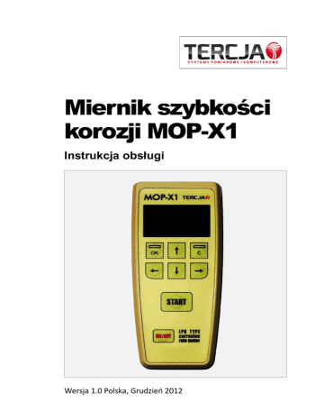 Miernik szybkości korozji MOP-X1 Instrukcja obsługi Wersja 1.0 Polska, Grudzień 2012 TERCJA – Systemy Pomiarowe i Komputerowe W razie problemów Skontaktuj się z producentem urządzenia. TERCJA – Systemy Pomiarowe i Komputerowe 80-534 Gdańsk, ul. Starowiejska 63 Polska tel.: +48 340 88 41 fax: +48 340 88 41 e-mail: [email protected] strona WWW: http://www.tercja.gda.pl Gwarancja Miernik szybkości korozji MOP-X1 objęty jest 2-letnią ograniczoną gwarancją od momentu zakupu. Gwarancji nie podlegają usterki wynikające z winy użytkownika. Wszelkie ślady uszkodzeń mechanicznych jak i ingerencji wewnętrznej w urządzeniu anulują gwarancję. Firma TERCJA zastrzega sobie prawo do zmian w konfiguracji sprzętowej i programowej swoich produktów bez wymogu wprowadzania tych zmian w już zakupionych produktach. Wszelkie zmiany mogą być wprowadzane bez dodatkowej informacji. Disclaimer Informacje zawarte w tej instrukcji zostały szczegółowo sprawdzone i wydają się poprawne w momencie publikacji tego dokumentu. Firma TERCJA nie ponosi jednak odpowiedzialności za błędy które mogą objawić się w przyszłości. Prawa autorskie Copyright 2013 by TERCJA – Systemy Pomiarowe i Komputerowe Wszystkie prawa zastrzeżone. Bez zgody autora, właściciela prawa autorskich i zarazem ich wydawcy żadna część tej publikacji nie możne być reprodukowana lub przekazywana w żadnej formie i żadnymi środkami elektronicznymi, mechanicznymi, za pośrednictwem fotokopiarek czy w inny sposób. TERCJA – Systemy Pomiarowe i Komputerowe TERCJA – Systemy Pomiarowe i Komputerowe MOP-X1 Instrukcja obsługi SPIS TREŚCI 1 Wprowadzenie ......................................................................7 2 Specyfikacja techniczna.........................................................9 3 Funkcje miernika .................................................................11 4 Zawartość zestawu ..............................................................13 5 Czujniki pomiarowe .............................................................15 5.1 Czujniki dedykowane ...................................................17 5.2 Czujniki własne ............................................................18 6 Panel czołowy ......................................................................21 7 Złącze ...................................................................................23 7.1 8 Przygotowanie do użycia .....................................................25 8.1 9 Podłączenie własnych czujników .................................23 Wymiana baterii ..........................................................26 Wykonanie pomiaru ............................................................27 10 Menu użytkownika ..............................................................31 10.1 Opcje miernika ............................................................31 10.1.1 Data i godzina.......................................................31 10.1.2 Automatyczne wyłączanie ...................................31 10.1.3 Ustawienia wyświetlacza i dźwięków...................32 10.1.4 Przywrócenie wartości domyślnych .....................33 10.2 Opcje pomiaru .............................................................33 10.2.1 Jednostki pomiaru................................................34 10.2.2 Automatyczny tryb pomiaru ................................34 10.2.3 Ustawienia czujników...........................................35 10.2.4 Rezystancja środowiska........................................38 10.2.5 Kolejność elektrod................................................38 TERCJA – Systemy Pomiarowe i Komputerowe 5 6 Spis treści 10.2.6 Kalibracja ............................................................. 40 10.3 Odczyt wyników pomiarów ........................................ 40 11 Wyniki pomiarów ............................................................... 43 12 Metoda obliczania szybkości korozji................................... 47 13 Dodatkowe adaptery .......................................................... 51 13.1 MOP-X1-US ................................................................. 51 13.2 MOP-X1-USB ............................................................... 52 14 Referencje........................................................................... 53 Dodatek A – Podstawy .............................................................. 55 TERCJA – Systemy Pomiarowe i Komputerowe MOP-X1 Instrukcja obsługi 1 WPROWADZENIE Dziękujemy za zainteresowanie się naszym produktem. Miernik szybkości korozji służy do wyznaczania szybkości z jaką ubywa materiał na skutek korozji, która jest nieuchronna. Wyniki podawane są w bardzo prostych jednostkach mm/rok. Pozwala to oszacować długość życia istniejącej instalacji. Pomiar jest natychmiastowy i odzwierciedla szybkość korozji w momencie pomiaru. Dzięki temu możliwe jest testowanie skuteczności zastosowanej ochrony przeciwkorozyjnej np. inhibitorowej. Miernik działa na zasadzie ogólnie uznanej metody polaryzacji liniowej (LPR – Linear Polarization Resistance) i ma zastosowanie w środowiskach przewodzących. Może służyć w ocenie szybkości korozji wszelkich instalacji wodnych wykonanych z różnorakich metali np. stali konstrukcyjnej, stali nierdzewnej, mosiądzu, miedzi etc. Jeśli potrzebujecie Państwo mierzyć szybkość korozji w mediach nieprzewodzących takich jak ciekłe węglowodory albo gazy to prosimy zainteresować się naszym innym produktem – rezystometrycznym miernikiem do pomiaru szybkości korozji. Działa on także na ogólnie uznanej zasadzie – rezystotometrii. Mierniki mogą być wykonane także w wersji stacjonarnej i wraz z czujnikami posiadać odpowiednie certyfikaty umożliwiające pracę w strefach zagrożenia wybuchem. TERCJA – Systemy Pomiarowe i Komputerowe 7 8 Wprowadzenie TERCJA – Systemy Pomiarowe i Komputerowe 9 MOP-X1 Instrukcja obs