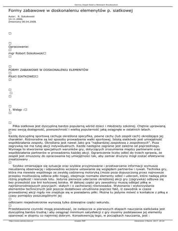 Gminny Zespół Szkół w Bielanach Wrocławskich Formy zabawowe w doskonaleniu elemenytów p. siatkowej Autor: R. Sokołowski 14.11.2006. Zmieniony 06.04.2008. Opracowanie: mgr Robert Sokołowski FORMY ZABAWOWE W DOSKONALENIU ELEMENTÓW PIŁKI SIATKOWEJ 1. Wstęp : Piłka siatkowa jest dyscypliną bardzo popularną wśród dzieci i młodzieży szkolnej. Chętnie uprawianą przez swoją dostępność, powszechność i wielką popularność jaką osiągnęła w ostatnich latach. Każdą dyscyplinę sportową cechuje określona specyfika, pewne cechy (lub zespół cech) określające jej charakter. Różnorodne są też sposoby prowadzenia walki sportowej. Istotą siatkówki jest umiejętność współdziałania zespołu. Określana jest nawet Jako gra "najbardziej zespołowa z zespołowych". Poza zagrywką nie ma tutaj akcji indywidualnych. Każde następne zagranie jest zależne od poprzedniego. Wymaga to stworzenia specjalnych warunków gry, dotyczących zrozumienia między partnerami oraz współdziałania partnerów w prowadzeniu każdej akcji. Ograniczenie liczby odbić do trzech sprawia, że zespół jest zmuszony do opracowania tej umiejętności tak, aby zamiar drużyny mógł zostać efektywnie zrealizowany . Szybko zmieniające się sytuacje oraz szybkie przyjmowanie i przetwarzanie informacji wymusza nieustanną obserwację i odpowiednio wczesne ustawianie się względem partnerów i rywali. Technika gry, która ma niewiele wspólnego ze zwykłą codzienną motoryką (może poza dopuszczoną przez najnowsze przepisy możliwością odbicia piłki nogą), obejmuje rozmaite elementy odbić i uderzeń, które nadają piłce różną prędkość i kierunek lotu. Jedynie pierwsze uderzenie określonej akcji gry (zagrywka) odbywa się bez przeszkód zza linii końcowej boiska. W dalszej części gry zawodnicy muszą odbijać piłkę w najróżnorodniejszych pozycjach: stałych i o zachwianej równowadze. Wykonanie i wykorzystanie elementów technicznych jest jeszcze dodatkowo utrudniona poprzez fakt, iż zawodnik w czasie prowadzonej akcji nigdy nie znajduje się w posiadaniu piłki. Można tu jedynie mówić o kontakcie z piłką a czasy pomiędzy poszczególnymi jej odbiciami niejednokrotnie wynoszą tylko dziesiętne części sekundy. Przedstawione czynniki mogą powodować, że zwłaszcza w pierwszych etapach nauczania siatkówka jest dyscypliną bardzo trudną i aby osiągnąć minimum satysfakcji z gry musimy podstawowe jej elementy opanować w stopniu co najmniej dobrym. Konsekwencją tego, w początkach nauczania, jest : http://www.szkola.sisco.pl Kreator PDF Utworzono 2 March, 2017, 18:24 Gminny Zespół Szkół w Bielanach Wrocławskich - mała atrakcyjność zajęć, wynikająca ze zbyt krótkiego czasu trwania akcji w typowych grach uproszczonych oraz ubogiego zasobu ćwiczeń dostosowanych do niedoskonałych umiejętności technicznych, - zbyt niska intensywność zajęć, spowodowana dużą liczbą błędów popełnianych w czasie ćwiczeń, - długotrwałość procesu nauczania elementów techniki niezbędnych do prowadzenia gry właściwej. Konieczne jest zatem aby w procesie nauczania elementów piłki siatkowej zastosować środki które zwiększą trakcyjność i tempo nauczania. Środkiem takim mogą być formy zabawowe. 2. Formy nauczania Środkami (narzędziami) umożliwiającymi realizację założeń programu nauczania są ćwiczenia (zadania ruchowe) skonstruowane i usystematyzowane zgodnie z przyjętą metodyką nauczania. Rodzaje zadania, jakie uczeń musi wykonać w toku konkretnego ćwiczenia, określany jest formą nauczania (lub typem ćwiczenia). Nauczanie oraz doskonalenie techniki i taktyki w grach zespołowych może odbywać się poprzez ćwiczenia w następujących formach: a / ścisłej, b / zabawowej, c / fragmentów gry, d / gry : uproszczonej szkolnej właściwej W formie ścisłej uczeń powinien wykonywać zadania ruchowe koncentrując uwagę, przede wszystkim na dokładności (przestrzeganiu schematu ruchowego). Forma ta sprzyja opanowaniu umiejętności zgadnie z modelem techniki. Należy pamiętać, że ze względu na stosunkowo małą atrakcyjność tej formy, nieprzemyślane stosowanie tego typu ćwiczeń może powodować zniechęcenia i obniżenie aktywności. Tak więc objętość ( czas ) ćwiczenia w formie ścisłej należy dostosować do specyfiki zajęć, gdyż inną motywacją cechują się i inne cele stawiają sobie uczniowie na lekcjach fychowania fizycznego, a inne na zajęciach pozalekcyjnych np. Szkolnego Klubu Sportowego lub Uczniowskiego Klubu Sportowego. Zauważyć należy, iż zwiększenie trudności zadań wpływa pozytywnie na zaangażowanie w tego typu ćwiczeniach. W formie zabawowej uczniowie rywalizując ze sobą (indywidualnie lub grupowo) skupiają uwagę, przede wszystkim, na osiągnięciu sukcesu, dlatego też dokładność wykonywanych czynności często odbiega od modelu techniki. Forma ta jest bardzo atrakcyjna, przez co motywuje uczniów do aktywnego udziału w zajęciach, jednak zbyt duża objętość ćwiczeń w formie zabaw powoduje zmęczenie emocjonalne, co zmniejsza zaangażowanie ćwiczących. Również niedostosowanie trudności zadań ( podobnie jak w formie ścisłej ) może znudzić i zniechęcić do aktywnego uczestniczenia w zajęciach. Zarówno forma ścisła, jak i forma zabawowa stosowane są przede wszystkim w unauczaniu i doskonaleniu elementów techniki. http://www.szkola.sisco.pl Kreator PDF Utworzono 2 March, 2017, 18:24 Gminny Zespół Szkół w Bielanach Wrocławskich W formie fragmentów gry ćwiczący rozwiązuje zadanie poprzez wykorzystanie posiadanych umiejętności w sytuacji zbliżonej do tej, jaka występuje w czasie gry (wycinek akcji). Od formy ścisłej różni ją występowanie przeciwnika, do którego działań należy się dostosować (np. w ataku skierować piłkę obok bloku, a w obronie przemieścić się na pozycję asekuracji, gdy przeciwnik sygnalizuje atak w formi