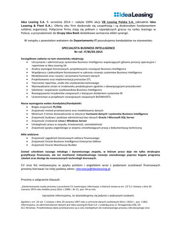 Idea Leasing S.A. 9. września 2014 r. nabyła 100% akcji VB Leasing Polska S.A. (aktualnie Idea Leasing & Fleet S.A.). Oferty obu firm doskonale się uzupełniają i są doskonałym fundamentem solidnej organizacji. Połączone firmy stają się jednym z największych graczy na rynku leasingu w Polsce, a przynależność do Grupy Idea Bank dodatkowo wzmacnia efekt synergii. W związku z powstałym wakatem do Departamentu IT poszukujemy kandydatów na stanowisko: SPECJALISTA BUSINESS INTELLIGENCE Nr ref. IT/BI/03.2015 Szczegółowe zadania na tym stanowisku obejmują: Utrzymanie i administracja systemów Business Intelligence wspierających główne procesy operacyjne i raportowe w Idea Leasing SA Analiza wymagań biznesowych, projektowanie rozwiązań Business Intelligence Współpraca z jednostkami biznesowymi w zakresie rozwoju systemów Business Intelligence Modelowanie oraz rozwój i utrzymanie hurtowni danych Projektowanie oraz implementacja procesów ETL Tworzenie raportów, analiz dla użytkownika końcowego Wprowadzanie zmian w środowisku produkcyjnym zgodnie z obowiązującymi procedurami Szkolenie i wspieranie użytkowników Business Intelligence Rozwiązywanie incydentów związanych z bieżącym działaniem systemów BI Uczestnictwo w projektach rozwojowych związanych BI/DWH/ETL Nasze wymagania wobec Kandydata/Kandydatki: Biegła znajomość PL/SQL Znajomość metod przetwarzania oraz modelowania danych Minimum 3 letnie doświadczenie w obszarze hurtowni danych i systemów Business Intelligence Znajomość budowy i podstaw administracji baz danych Oracle i Microsoft SQL Server Znajomość środowisk Linux i Windows Server Umiejętność pracy w zespole, kreatywność, samodzielność Znajomość języka angielskiego w stopniu umożliwiającym pracę z dokumentacją techniczną Mile widziane: Znajomość zagadnień biznesowych sektora finansowego Znajomość Oracle Business Intelligence Enterprise Edition Znajomość Oracle Warehouse Builder Zostań członkiem naszego młodego i dynamicznego zespołu, w którym praca daje nie tylko atrakcyjne gratyfikacje finansowe, ale też możliwość indywidualnego rozwoju zawodowego poprzez bogate programy szkoleń oraz dostęp do nowoczesnych technologii biurowych. CV oraz list motywacyjny w języku polskim i angielskim wraz z podaniem oczekiwań finansowych prosimy kierować na niżej podany adres: [email protected] Prosimy o załączenie klauzuli: „Zainteresowane osoby prosimy o przesłanie CV zawierające informacje, o których mowa w art. 22¹ § 1 Ustawy z dnia 26 czerwca 1974 roku Kodeks pracy (DzU z 1998 r. Nr 21, poz. 94 ze zm). Uprzejmie informujemy, że skontaktujemy się jedynie z wybranymi osobami. Zgodnie z art. 24 ust. 1 Ustawy z dnia 29 sierpnia 1997 roku o ochronie danych osobowych (DzU z 2014 r., poz. 1182) informujemy, że administratorem danych jest Idea Leasing & Fleet S.A. z siedzibą przy ul. Strzegomska 42b, 53611 Wrocław. Przedmiotowe dane przetwarzane są w celu niezbędnym do realizowanego procesu rekrutacyjnego oraz podjęcia działań przed zawarciem umowy i nie będą udostępniane innym odbiorcom danych. Obowiązek ich podania wynika z przepisów Ustawy z dnia 26 czerwca 1974 roku Kodeks pracy (DzU z 1998 r. Nr 21, poz. 94 ze zm.) oraz wydanych na jej podstawie aktów wykonawczych. Każda osoba ma prawo dostępu do treści swoich danych oraz do ich poprawiania. Wyrażam zgodę także na przetwarzanie w przyszłości podanych w CV danych w celu związanym z przyszłymi procesami rekrutacyjnymi realizowanymi przez Idea Leasing & Fleet S.A..”