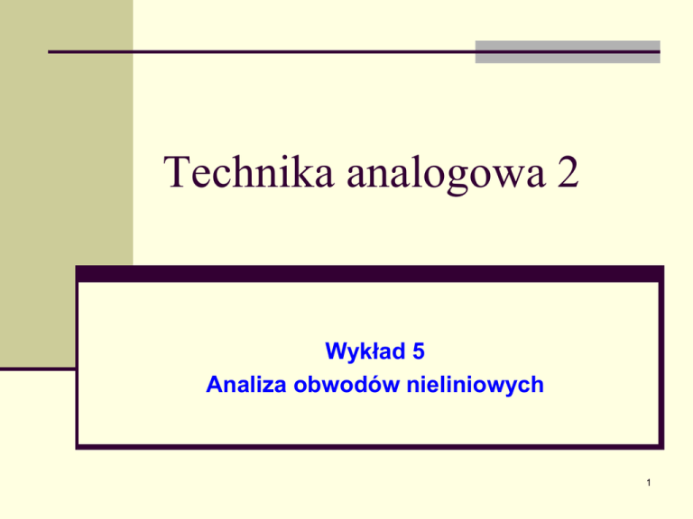 Technika analogowa 2 Wykład 5 Analiza obwodów nieliniowych 1 Plan wykładu Wprowadzenie Charakterystyki – parametry dwójników nieliniowych Rodzaje charakterystyk elementów nieliniowych Obwody z nieliniowymi elementami rezystancyjnymi. Metody analizy Linearyzacja warunkowa charakterystyk 2 Wprowadzenie Obwodem nieliniowym – w odróżnieniu od liniowego – będziemy nazywać obwód, w którym nie zachodzi liniowa zależność między wymuszeniami a odpowiedziami. Charakterystykę elementu można opisywać zwykle pewną funkcją, określającą zależność jednej wielkości (pobudzenie) elektrycznej od drugiej ( reakcja). Element rezystancyjny – to element opisany funkcją algebraiczną (brak pochodnych), wiążącą i z u (lub u z u, u z i, i z i ). Element reaktancyjny – to element opisany funkcją zawierającą pochodne, wiążące i z u . 3 Wprowadzenie Obwody elektryczne zawierające elementy, których parametry zależą od prądu i napięcia płynącego przez element, bądź napięcia panującego na zaciskach elementu nazywamy obwodami nieliniowymi. Charakterystyka elementu nieliniowego może być przedstawiona w postaci jednej krzywej (dla elementu niesterowanego jakim może być np. żarówka, bareter, dioda próżniowa czy półprzewodnikowa) lub rodziny krzywych - dla elementów sterowanych dodatkowym czynnikiem sterującym (np. lampy próżniowe, wieloelektrodowe, tranzystory). Rozróżniamy elementy nieliniowe o charakterystyce napięciowo-prądowej symetrycznej i niesymetrycznej. 4 Charakterystyka napięciowo-prądowa (symetryczna) Lampa żarowa z włóknem metalowym (żarówka) Stabilizator oporowy (bareter) Lampa żarowa z włóknem węglowym (żarówka) 5 Charakterystyka napięciowo-prądowa (niesymetryczna) Dioda próżniowa Dioda gazowana (gazotron) Dioda półprzewodnikowa Takie elementy nazywamy prostownikami 6 Charakterystyka napięciowo-prądowa (niesymetryczna) Elementy o charakterystyce niejednoznacznej Np. dioda tunelowa Element uzależniony napięciowo 7 Rezystancja statyczna i dynamiczna Dwójnik nieliniowy – w odróżnieniu od liniowego – nie może być opisany jednym lub kilkoma parametrami Dla elementu rezystancyjnego nieliniowego można mówić o wartości rezystancji (konduktancji) tylko w powiązaniu z określonym punktem pracy na charakterystyce prądowonapięciowej. Dla każdego punktu K charakterystyki wprowadzone są dwa pojęcia: rezystancja statyczna i rezystancja dynamiczna. Rezystancją statyczną Rs elementu nieliniowego w danym punkcie K charakterystyki nazywamy iloraz napięcia i prądu w tym punkcie: RsK UK IK ms tg ms – współczynnik skali 8 Rezystancja statyczna i dynamiczna Rezystancją dynamiczną (różniczkową) Rd elementu nieliniowego w danym punkcie K charakterystyki nazywamy pochodną napięcia względem prądu w tym punkcie: RdK lim I 0 U I K dU dI ms tg ms – współczynnik skali 9 Rezystancja statyczna i dynamiczna RsK UK IK ms tg RdK lim I 0 U I K dU dI ms tg dU dI dI dU Rs Rd Rs Rd 10 Współczynnik stabilizacji Dla zadanego punktu charakterystyki układ nieliniowy charakteryzuje się również współczynnikiem stabilizacji k, rozumianym jako stosunek względnych zmian wielkości wejściowej do względnych zmian wielkości na wyjściu. Dla elementów nieliniowych o charakterystykach jak na poprzednim slajdzie definiuje się (dla punktu pracy K) następujące współczynniki stabilizacji: - współczynnik prądowy k IK U UK wej I IK wyj U I K U I K RdK RsK 11 Współczynnik stabilizacji - współczynnik napięciowy I kUK IK wej U UK wyj U I K U I K RsK RdK Mówimy, że element o zadanej charakterystyce stabilizuje napięcie, gdy kU >1 , czyli gdy Rs > Rd ; stabilizuje prąd, gdy kI > 1 , czyli gdy Rs < Rd . 12 Połączenie szeregowe i równoległe dwóch rezystorów nieliniowych Przy połączeniu dwu i więcej elementów nieliniowych z liniowymi w dowolny sposób, wykorzystuje się tzw. charakterystykę łączną (wypadkową). Charakterystykę łączną otrzymujemy z charakterystyk prądowonapięciowych elementów przez dodanie napięć na poszczególnych elementach przy tym samym prądzie przy połączeniu szeregowym elementów lub przez dodanie prądów płynących przez poszczególne elementy przy tym samym napięciu - przy połączeniu równoległym elementów. 13 Element nieliniowy połączony szeregowo ze źródłem napięciowym I f (U N ) I f (U N ) I UN U f (U ) UN UN I f (U ) I U f (U N ) UN 14 Połączenie szeregowe i równoległe dwóch rezystorów nieliniowych Połączenie szeregowe Połączenie równoległe 15 Sposób graficzny wyznaczania prądu i napięcia na dwóch elementach połączonych szeregowo u Dla źródła u E Rg i f (i) Dla rezystora nieliniowego RN : u f (i) 16 Aproksymacja Charakterystyki otrzymuje się najczęściej pomiarowo i przedstawia graficznie, tabelarycznie lub analitycznie, czyli za pomocą wzoru będącego aproksymacją rzeczywistej, fizycznej zależności. Najczęściej stosuje się następujące funkcje zastępcze: a) aproksymacja odcinkiem prostej, b) aproksymacja dwoma lub większą liczbą odcinków (aproksymacja wieloodcinkowa) c) Aproksymacja wielomianem potęgowym y a0 a1 x a2 x 2 ... an x n , (zwykle jeden lub dwa wyrazy) 17 Aproksymacja d) aproksymacja funkcją wykładniku potęgowym a xn , y potęgową o niecałkowitym gdzie n – liczba niecałkowita, e) Aproksymacja funkcją wykładniczą lub logarytmiczną y a0 a1 eb1x lub y a0 a1 ln b1 x , f) aproksymacja funkcją hiperboliczną y a0 a1 sinh b1 x lub y a0 a1 tanh b1 x , 18 Aproksymacja g) aproksymacja funkcją trygonometryczną, np. y a0 a1tg b1 x h) aproksymacja funkcją wymierną, to jest będącą ilorazem wielomianów y a0 a1 x a2 x 2 ... an x n , 2 m b0 b1 x b2 x ... bm x najczęściej stosowana jest funkcja A. Fröhlicha y a0 a1 x . b0 b1 x i) Inne bardziej skomplikowane aproksymacje 19 Obwód zastępczy elementu nieliniowego U Rd 1 mRtg 1 U Rd 1 mRtg 2 20 Obliczanie obwodów nieliniowych Przykład 1