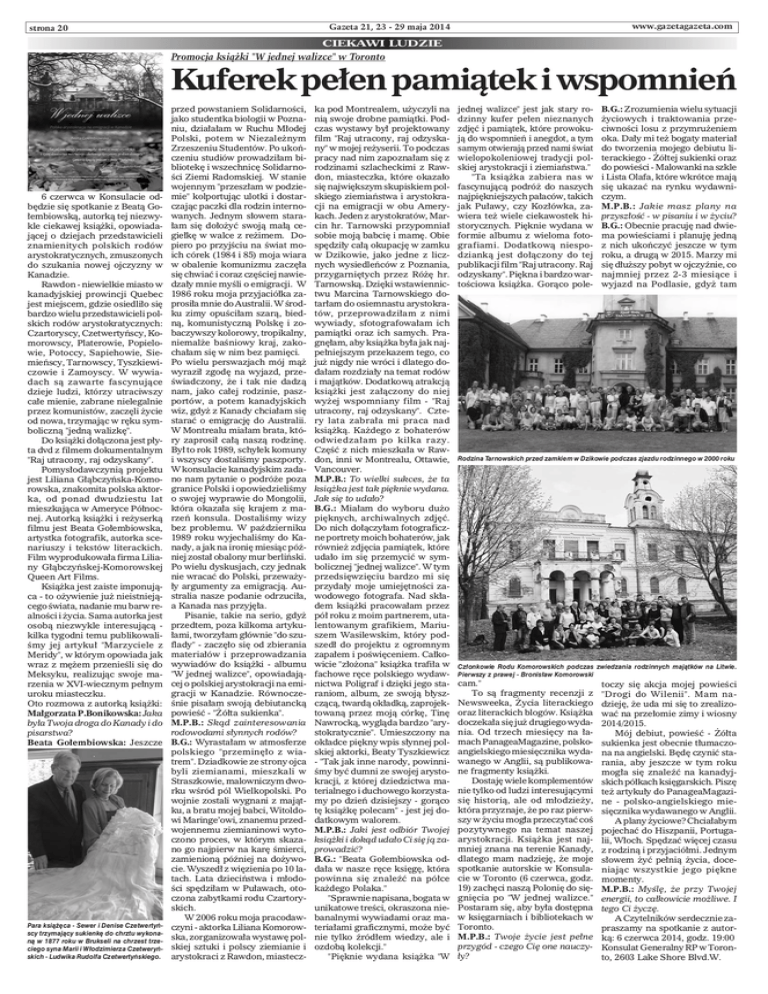 www.gazetagazeta.com Gazeta 21, 23 - 29 maja 2014 strona 20 CIEKAWI LUDZIE Promocja książki "W jednej walizce" w Toronto Kuferek pełen pamiątek i wspomnień 6 czerwca w Konsulacie odbędzie się spotkanie z Beatą Gołembiowską, autorką tej niezwykle ciekawej książki, opowiadającej o dziejach przedstawicieli znamienitych polskich rodów arystokratycznych, zmuszonych do szukania nowej ojczyzny w Kanadzie. Rawdon - niewielkie miasto w kanadyjskiej prowincji Quebec jest miejscem, gdzie osiedliło się bardzo wielu przedstawicieli polskich rodów arystokratycznych: Czartoryscy, Czetwertyńscy, Komorowscy, Platerowie, Popielowie, Potoccy, Sapiehowie, Siemieńscy, Tarnowscy, Tyszkiewiczowie i Zamoyscy. W wywiadach są zawarte fascynujące dzieje ludzi, którzy utraciwszy całe mienie, zabrane nielegalnie przez komunistów, zaczęli życie od nowa, trzymając w ręku symboliczną "jedną walizkę". Do książki dołączona jest płyta dvd z filmem dokumentalnym "Raj utracony, raj odzyskany". Pomysłodawczynią projektu jest Liliana Głąbczyńska-Komorowska, znakomita polska aktorka, od ponad dwudziestu lat mieszkająca w Ameryce Północnej. Autorką książki i reżyserką filmu jest Beata Gołembiowska, artystka fotografik, autorka scenariuszy i tekstów literackich. Film wyprodukowała firma Liliany Głąbczyńskej-Komorowskej Queen Art Films. Książka jest zaiste imponująca - to ożywienie już nieistniejącego świata, nadanie mu barw realności i życia. Sama autorka jest osobą niezwykle interesującą kilka tygodni temu publikowaliśmy jej artykuł "Marzyciele z Meridy", w którym opowiada jak wraz z mężem przenieśli się do Meksyku, realizując swoje marzenia w XVI-wiecznym pełnym uroku miasteczku. Oto rozmowa z autorką książki: Małgorzata P.Bonikowska: Jaka była Twoja droga do Kanady i do pisarstwa? Beata Gołembiowska: Jeszcze Para książęca - Sewer i Denise Czetwertyńscy trzymający sukienkę do chrztu wykonaną w 1877 roku w Brukseli na chrzest trzeciego syna Marii i Włodzimierza Czetweryńskich - Ludwika Rudolfa Czetwertyńskiego. przed powstaniem Solidarności, jako studentka biologii w Poznaniu, działałam w Ruchu Młodej Polski, potem w Niezależnym Zrzeszeniu Studentów. Po ukończeniu studiów prowadziłam bibliotekę i wszechnicę Solidarności Ziemi Radomskiej. W stanie wojennym "przeszłam w podziemie" kolportując ulotki i dostarczając paczki dla rodzin internowanych. Jednym słowem starałam się dołożyć swoją małą cegiełkę w walce z reżimem. Dopiero po przyjściu na świat moich córek (1984 i 85) moja wiara w obalenie komunizmu zaczęła się chwiać i coraz częściej nawiedzały mnie myśli o emigracji. W 1986 roku moja przyjaciółka zaprosiła mnie do Australii. W środku zimy opuściłam szarą, biedną, komunistyczną Polskę i zobaczywszy kolorowy, tropikalny, niemalże baśniowy kraj, zakochałam się w nim bez pamięci. Po wielu perswazjach mój mąż wyraził zgodę na wyjazd, przeświadczony, że i tak nie dadzą nam, jako całej rodzinie, paszportów, a potem kanadyjskich wiz, gdyż z Kanady chciałam się starać o emigrację do Australii. W Montrealu miałam brata, który zaprosił całą naszą rodzinę. Był to rok 1989, schyłek komuny i wszyscy dostaliśmy paszporty. W konsulacie kanadyjskim zadano nam pytanie o podróże poza granice Polski i opowiedzieliśmy o swojej wyprawie do Mongolii, która okazała się krajem z marzeń konsula. Dostaliśmy wizy bez problemu. W październiku 1989 roku wyjechaliśmy do Kanady, a jak na ironię miesiąc później został obalony mur berliński. Po wielu dyskusjach, czy jednak nie wracać do Polski, przeważyły argumenty za emigracją. Australia nasze podanie odrzuciła, a Kanada nas przyjęła. Pisanie, takie na serio, gdyż przedtem, poza kilkoma artykułami, tworzyłam głównie "do szuflady" - zaczęło się od zbierania materiałów i przeprowadzania wywiadów do książki - albumu "W jednej walizce", opowiadającej o polskiej arystokracji na emigracji w Kanadzie. Równocześnie pisałam swoją debiutancką powieść - "Żółta sukienka". M.P.B.: Skąd zainteresowania rodowodami słynnych rodów? B.G.: Wyrastałam w atmosferze polskiego "przeminęło z wiatrem". Dziadkowie ze strony ojca byli ziemianami, mieszkali w Straszkowie, malowniczym dworku wśród pól Wielkopolski. Po wojnie zostali wygnani z majątku, a bratu mojej babci, Witoldowi Maringe’owi, znanemu przedwojennemu ziemianinowi wytoczono proces, w którym skazano go najpierw na karę śmierci, zamienioną później na dożywocie. Wyszedł z więzienia po 10 latach. Lata dzieciństwa i młodości spędziłam w Puławach, otoczona zabytkami rodu Czartoryskich. W 2006 roku moja pracodawczyni - aktorka Liliana Komorowska, zorganizowała wystawę polskiej sztuki i polscy ziemianie i arystokraci z Rawdon, miastecz- ka pod Montrealem, użyczyli na nią swoje drobne pamiątki. Podczas wystawy był projektowany film "Raj utracony, raj odzyskany" w mojej reżyserii. To podczas pracy nad nim zapoznałam się z rodzinami szlacheckimi z Rawdon, miasteczka, które okazało się największym skupiskiem polskiego ziemiaństwa i arystokracji na emigracji w obu Amerykach. Jeden z arystokratów, Marcin hr. Tarnowski przypomniał sobie moją babcię i mamę. Obie spędziły całą okupację w zamku w Dzikowie, jako jedne z licznych wysiedleńców z Poznania, przygarniętych przez Różę hr. Tarnowską. Dzięki wstawiennictwu Marcina Tarnowskiego dotarłam do osiemnastu arystokratów, przeprowadziłam z nimi wywiady, sfotografowałam ich pamiątki oraz ich samych. Pragnęłam, aby książka była jak najpełniejszym przekazem tego, co już nigdy nie wróci i dlatego dodałam rozdziały na temat rodów i majątków. Dodatkową atrakcją książki jest załączony do niej wyżej wspomniany film - "Raj utracony, raj odzyskany". Cztery lata zabrała mi praca nad książką. Każdego z bohaterów odwiedzałam po kilka razy. Częś