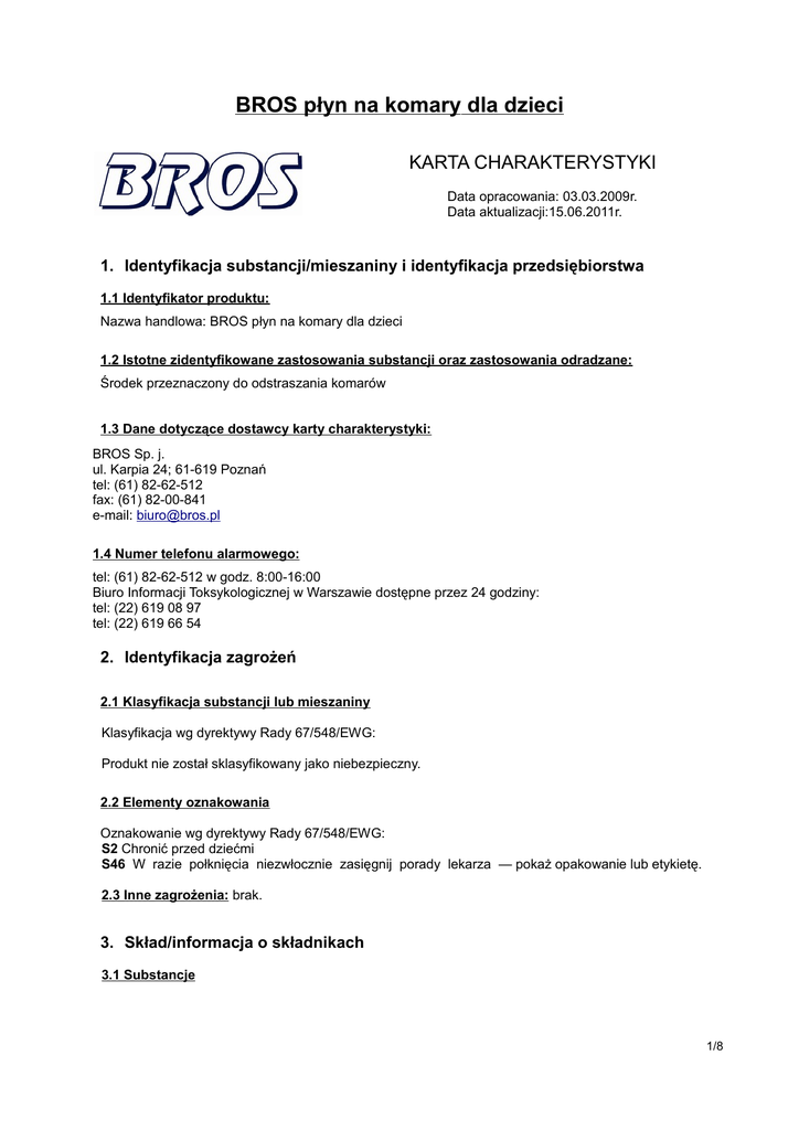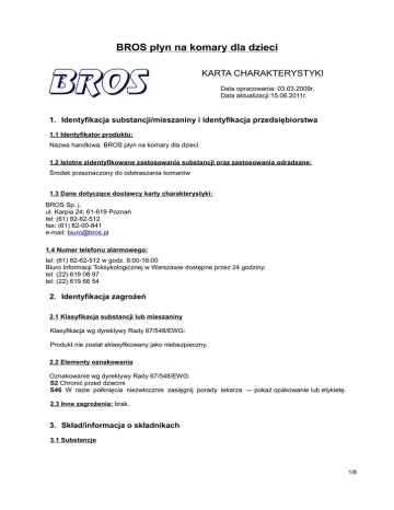 BROS płyn na komary dla dzieci KARTA CHARAKTERYSTYKI Data opracowania: 03.03.2009r. Data aktualizacji:15.06.2011r. 1. Identyfikacja substancji/mieszaniny i identyfikacja przedsiębiorstwa 1.1 Identyfikator produktu: Nazwa handlowa: BROS płyn na komary dla dzieci 1.2 Istotne zidentyfikowane zastosowania substancji oraz zastosowania odradzane: Środek przeznaczony do odstraszania komarów 1.3 Dane dotyczące dostawcy karty charakterystyki: BROS Sp. j. ul. Karpia 24; 61-619 Poznań tel: (61) 82-62-512 fax: (61) 82-00-841 e-mail: [email protected] 1.4 Numer telefonu alarmowego: tel: (61) 82-62-512 w godz. 8:00-16:00 Biuro Informacji Toksykologicznej w Warszawie dostępne przez 24 godziny: tel: (22) 619 08 97 tel: (22) 619 66 54 2. Identyfikacja zagrożeń 2.1 Klasyfikacja substancji lub mieszaniny Klasyfikacja wg dyrektywy Rady 67/548/EWG: Produkt nie został sklasyfikowany jako niebezpieczny. 2.2 Elementy oznakowania Oznakowanie wg dyrektywy Rady 67/548/EWG: S2 Chronić przed dziećmi S46 W razie połknięcia niezwłocznie zasięgnij porady lekarza — pokaż opakowanie lub etykietę. 2.3 Inne zagrożenia: brak. 3. Skład/informacja o składnikach 3.1 Substancje 1/8 BROS płyn na komary dla dzieci NAZWA SKŁADNIKA N-acetylo-N-butylo-.beta.alaninian etylu; IR 3535 ilość 10,0% CAS WE (CE) INDEKS KLASYFIKACJA KLASYFIKACJA CLP NUMER 52304-36-6 257-835-0 Nie nadano Nie klasyfikowano Nie klasyfikowano 4. Środki pierwszej pomocy 4.1 Opis środków pierwszej pomocy: Narażenie przez drogi oddechowe: zapewnić dostęp świeżego powietrza, przy wystąpieniu niepokojących objawów zwrócić się o pomoc lekarską. Narażenie przez kontakt ze skórą: mieszanina nie powinna działać drażniąco na skórę. W przypadku podrażnienia, skórę obficie spłukać dużą ilością wody, w razie potrzeby skontaktować się z lekarzem. Narażenie przez kontakt z oczami: natychmiast przemyć pod bieżącą wodą i skontaktować się z lekarzem. Narażenie przez drogi pokarmowe: nie powodować wymiotów, wypłukać usta wodą. Skontaktować się z lekarzem. 4.2 Najważniejsze ostre i opóźnione objawy oraz skutki narażenia: nie dotyczy 4.3 Wskazania dotyczące wszelkiej natychmiastowej pomocy lekarskiej i szczególnego postępowania z poszkodowanym: nie dotyczy 5. Postępowanie w przypadku pożaru 5.1 Środki gaśnicze: Odpowiednie środki gaśnicze: standardowe środki gaśnicze: proszki, piana, dwutlenek węgla, rozpylona woda. Niewłaściwe środki gaśnicze: nie stosować bezpośredniego, silnego strumienia wody. 5.2 Szczególne zagrożenia związane z substancją: produkt w warunkach pożaru ulegnie spaleniu. 5.3 Informacje dla straży pożarnej: standardowa odzież ochronna; rękawice, kombinezon ochronny, w razie konieczności aparat oddechowy. Stosować standardowe procedury gaszenia. 6. Postępowanie w przypadku niezamierzonego uwolnienia do środowiska 6.1 Indywidualne środki ostrożności, wyposażenie ochronne i procedury w sytuacjach awaryjnych: środki ochrony indywidualnej: okulary ochronne i rękawice ochronne. 2/8 BROS płyn na komary dla dzieci 6.2 Środki ostrożności w zakresie ochrony środowiska: zabezpieczyć przed przedostaniem się do cieków i zbiorników wodnych. 6.3 Metody i materiały zapobiegające rozprzestrzenianiu się skażenia i służące do usuwania skażenia: za pomocą sorbentu bądź piasku zebrać preparat do odpowiedniego pojemnika i przekazać do utylizacji. 6.4 Odniesienia do innych sekcji: patrz punkt 8 i 13 niniejszej karty charakterystyki. 7. Postępowanie z substancjami i mieszaninami oraz ich magazynowanie 7.1 Środki ostrożności dotyczące bezpiecznego postępowania: przed zastosowaniem zapoznać się z treścią etykiety. Unikać kontaktu z oczami i ustami. 7.2 Warunki bezpiecznego magazynowania: przechowywać w suchym, chłodnym miejscu. Chronić przed dziećmi i zwierzętami domowymi. 7.3 Szczególne zastosowanie końcowe: brak 8. Kontrola narażenia/środki ochrony indywidualnej 8.1 Parametry dotyczące kontroli: brak oznaczenia dla wartości NDS oraz NDSCh 8.2 Kontrola narażenia: brak szczególnych wymagań. 9. Właściwości fizyczne i chemiczne 9.1 Informacje na temat podstawowych właściwości fizycznych i chemicznych: Wygląd: płyn, barwa: mleczna Zapach: charakterystyczny, przyjemny Próg zapachu: brak danych PH: 1% r-ru 7,5 +/- 0,5 Temperatura topnienia / krzepnięcia: brak danych Początkowa temperatura wrzenia i zakres temperatur wrzenia: brak danych Temperatura zapłonu: brak danych Szybkość parowania: brak danych Palność: brak danych Górna/dolna granica palności lub górna/dolna granica wybuchowości: nie dotyczy 3/8 BROS płyn na komary dla dzieci Prężność par: brak danych Gęstość par: brak danych Gęstość [g/ml]: 0,876 Rozpuszczalność: rozpuszcza się w H2O Współczynnik podziału: n-oktanol/woda: brak danych Temperatura samozapłonu: nie dotyczy Temperatura rozkładu: nie dotyczy Lepkość: brak danych Właściwości wybuchowe: nie dotyczy Właściwości utleniające: nie dotyczy 9.2 Inne informacje: brak 10. Stabilność i reaktywność 10.1 Reaktywność: nie jest reaktywny 10.2 Stabilność chemiczna: produkt stabilny chemicznie w warunkach normalnych 10.3 Możliwość występowania niebezpiecznych reakcji: nie jest reaktywny, niebezpieczne reakcje nie zajdą 10.4 Warunki, których należy unikać: wysokich temperatur, kontaktu z silnymi kwasami, zasadami, utleniaczami 10.5 Materiały niezgodne: brak 10.6 Niebezpieczne produkty rozkładu: brak 11. Informacje toksykologiczne 11.1 Informacje dotyczące skutków toksykologicznych: Brak badań toksyczności ostrej dla mieszaniny. Poniższe dane przytoczono wg karty charakterystyki producenta substancji czynnej – IR3535. Informacje toksykologiczne IR 3535/52304-36-6 LD50 (Szczur - doustnie) 14 000 [mg/kg] LC50 (Szczur - inhalacyjnie) >5,1 [mg/l/4h] LD50 (Królik - dermalnie) >10 000 [mg/l] Działanie żrące/drażniące na skórę: nie działa drażniąco na sk
