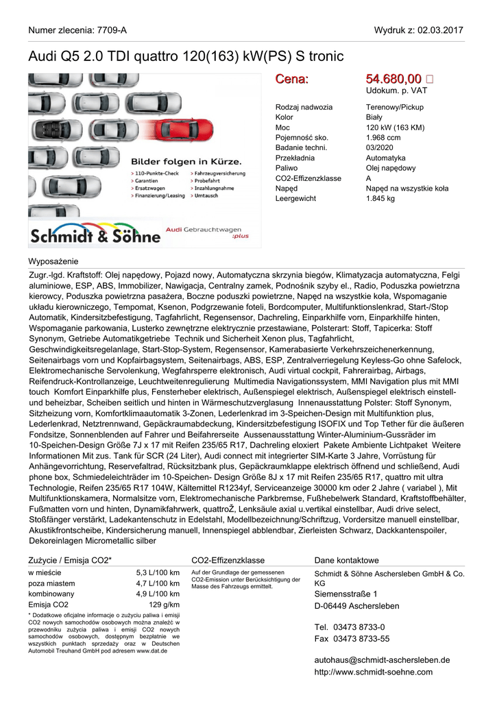 Numer zlecenia: 7709-A Wydruk z: 02.03.2017 Audi Q5 2.0 TDI quattro 120(163) kW(PS) S tronic Cena: 54.680,00 Rodzaj nadwozia Kolor Moc Pojemność sko. Badanie techni. Przekładnia Paliwo CO2-Effizenzklasse Napęd Leergewicht Terenowy/Pickup Biały 120 kW (163 KM) 1.968 ccm 03/2020 Automatyka Olej napędowy A Napęd na wszystkie koła 1.845 kg Udokum. p. VAT Wyposażenie Zugr.-lgd. Kraftstoff: Olej napędowy, Pojazd nowy, Automatyczna skrzynia biegów, Klimatyzacja automatyczna, Felgi aluminiowe, ESP, ABS, Immobilizer, Nawigacja, Centralny zamek, Podnośnik szyby el., Radio, Poduszka powietrzna kierowcy, Poduszka powietrzna pasażera, Boczne poduszki powietrzne, Napęd na wszystkie koła, Wspomaganie układu kierowniczego, Tempomat, Ksenon, Podgrzewanie foteli, Bordcomputer, Multifunktionslenkrad, Start-/Stop Automatik, Kindersitzbefestigung, Tagfahrlicht, Regensensor, Dachreling, Einparkhilfe vorn, Einparkhilfe hinten, Wspomaganie parkowania, Lusterko zewnętrzne elektrycznie przestawiane, Polsterart: Stoff, Tapicerka: Stoff Synonym, Getriebe Automatikgetriebe Technik und Sicherheit Xenon plus, Tagfahrlicht, Geschwindigkeitsregelanlage, Start-Stop-System, Regensensor, Kamerabasierte Verkehrszeichenerkennung, Seitenairbags vorn und Kopfairbagsystem, Seitenairbags, ABS, ESP, Zentralverriegelung Keyless-Go ohne Safelock, Elektromechanische Servolenkung, Wegfahrsperre elektronisch, Audi virtual cockpit, Fahrerairbag, Airbags, Reifendruck-Kontrollanzeige, Leuchtweitenregulierung Multimedia Navigationssystem, MMI Navigation plus mit MMI touch Komfort Einparkhilfe plus, Fensterheber elektrisch, Außenspiegel elektrisch, Außenspiegel elektrisch einstellund beheizbar, Scheiben seitlich und hinten in Wärmeschutzverglasung Innenausstattung Polster: Stoff Synonym, Sitzheizung vorn, Komfortklimaautomatik 3-Zonen, Lederlenkrad im 3-Speichen-Design mit Multifunktion plus, Lederlenkrad, Netztrennwand, Gepäckraumabdeckung, Kindersitzbefestigung ISOFIX und Top Tether für die äußeren Fondsitze, Sonnenblenden auf Fahrer und Beifahrerseite Aussenausstattung Winter-Aluminium-Gussräder im 10-Speichen-Design Größe 7J x 17 mit Reifen 235/65 R17, Dachreling eloxiert Pakete Ambiente Lichtpaket Weitere Informationen Mit zus. Tank für SCR (24 Liter), Audi connect mit integrierter SIM-Karte 3 Jahre, Vorrüstung für Anhängevorrichtung, Reservefaltrad, Rücksitzbank plus, Gepäckraumklappe elektrisch öffnend und schließend, Audi phone box, Schmiedeleichträder im 10-Speichen- Design Größe 8J x 17 mit Reifen 235/65 R17, quattro mit ultra Technologie, Reifen 235/65 R17 104W, Kältemittel R1234yf, Serviceanzeige 30000 km oder 2 Jahre ( variabel ), Mit Multifunktionskamera, Normalsitze vorn, Elektromechanische Parkbremse, Fußhebelwerk Standard, Kraftstoffbehälter, Fußmatten vorn und hinten, Dynamikfahrwerk, quattroŽ, Lenksäule axial u.vertikal einstellbar, Audi drive select, Stoßfänger verstärkt, Ladekantenschutz in Edelstahl, Modellbezeichnung/Schriftzug, Vordersitze manuell einstellbar, Akustikfrontscheibe, Kindersicherung manuell, Innenspiegel abblendbar, Zierleisten Schwarz, Dackkantenspoiler, Dekoreinlagen Micrometallic silber Zużycie / Emisja CO2* w mieście poza miastem kombinowany Emisja CO2 5,3 L/100 km 4,7 L/100 km 4,9 L/100 km 129 g/km * Dodatkowe oficjalne informacje o zużyciu paliwa i emisji CO2 nowych samochodów osobowych można znaleźć w przewodniku zużycia paliwa i emisji CO2 nowych samochodów osobowych, dostępnym bezpłatnie we wszystkich punktach sprzedaży oraz w Deutschen Automobil Treuhand GmbH pod adresem www.dat.de CO2-Effizenzklasse Dane kontaktowe Auf der Grundlage der gemessenen CO2-Emission unter Berücksichtigung der Masse des Fahrzeugs ermittelt. Schmidt & Söhne Aschersleben GmbH & Co. KG Siemensstraße 1 D-06449 Aschersleben Tel. 03473 8733-0 Fax 03473 8733-55 [email protected] http://www.schmidt-soehne.com Numer zlecenia: 7709-A Audi Q5 2.0 TDI quattro 120(163) kW(PS) S tronic Wydruk z: 02.03.2017