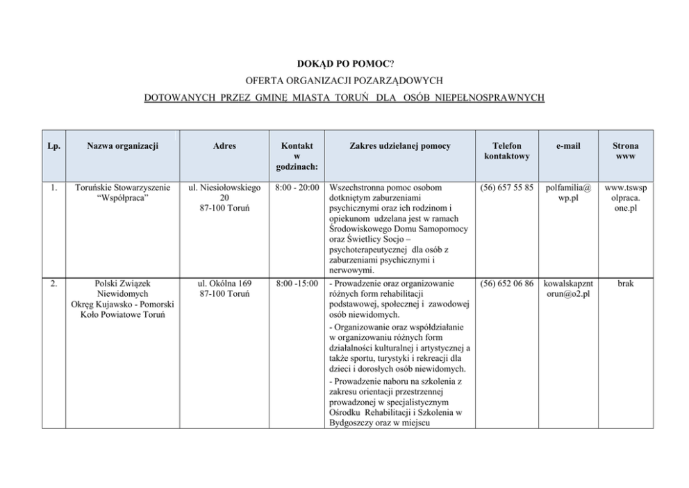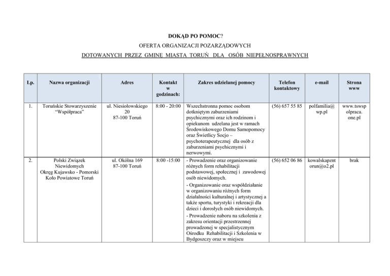 DOKĄD PO POMOC? OFERTA ORGANIZACJI POZARZĄDOWYCH DOTOWANYCH PRZEZ GMINĘ MIASTA TORUŃ DLA OSÓB NIEPEŁNOSPRAWNYCH Lp. Nazwa organizacji Adres Kontakt w godzinach: Zakres udzielanej pomocy Telefon kontaktowy e-mail Strona www 1. Toruńskie Stowarzyszenie “Współpraca” ul. Niesiołowskiego 20 87-100 Toruń 8:00 - 20:00 (56) 657 55 85 polfamilia@ wp.pl www.tswsp olpraca. one.pl 2. Polski Związek Niewidomych Okręg Kujawsko - Pomorski Koło Powiatowe Toruń ul. Okólna 169 87-100 Toruń 8:00 -15:00 Wszechstronna pomoc osobom dotkniętym zaburzeniami psychicznymi oraz ich rodzinom i opiekunom udzelana jest w ramach Środowiskowego Domu Samopomocy oraz Świetlicy Socjo – psychoterapeutycznej dla osób z zaburzeniami psychicznymi i nerwowymi. - Prowadzenie oraz organizowanie różnych form rehabilitacji podstawowej, społecznej i zawodowej osób niewidomych. - Organizowanie oraz współdziałanie w organizowaniu różnych form działalności kulturalnej i artystycznej a także sportu, turystyki i rekreacji dla dzieci i dorosłych osób niewidomych. - Prowadzenie naboru na szkolenia z zakresu orientacji przestrzennej prowadzonej w specjalistycznym Ośrodku Rehabilitacji i Szkolenia w Bydgoszczy oraz w miejscu (56) 652 06 86 kowalskapznt [email protected] brak Lp. 3. Nazwa organizacji Fundacja Szansa dla Niewidomych - Biuro Regionalne (Tyflopunkt) w Bydgoszczy Adres ul. Michała Kleofasa Ogińskiego 20 85-092 Bydgoszcz Kontakt w godzinach: Zakres udzielanej pomocy Telefon kontaktowy e-mail Strona www (52) 321-4783 606 275 200 bydgoszcz@s zansadlaniew idomych.org www.szansa dlaniewido mych. org 600 280 850 501 979 067 biuroimpuls @op.pl www.fundac jaimpuls. com.pl zamieszkania. - Zaopatrywanie osób niewidomych w drobny specjalistyczny sprzęt rehabilitacyjny a dzieci słabo widzących w zeszyty z pogrubioną linią i kratką oraz w przybory szkolne obrajlowione: papier brajlowski , rysiki, tabliczki i alfabety do nauki pisma punktowego 8.00 -16.00 - Prowadzenie specjalistycznego poradnictwa dotyczącego doboru sprzętu tyfloinformatycznego. - Pomoc w uzyskaniu dotacji na zakup specjalistycznego sprzętu. - Prowadzenie szkoleń i warsztatów pomagających znaleźć osobom z niepełnosprawnością wzrokową pracę lub otworzyć własną działalność gospodarczą. 4. Fundacja Wspierania Rozwoju IMPULS ul. Chopina 22/2 87-100 Toruń 14.00 18.00 Inicjowanie i wspieranie różnych form pomocy osobom niepełnosprawnym, osobom z dysfunkacjami rozwoju psychoruchowego, z zaburzeniami funkcjonowania społecznego, potrzebującym wsparcia w rozwoju działalność: - fizjoterapeutyczna, Lp. Nazwa organizacji Adres Kontakt w godzinach: 5. Centrum Pielęgnacji Caritas Diecezji Toruńskiej ul. Kard. St. Wyszyńskiego 7/9 87 -100 Toruń 8.00 - 16.00 6. “JESTEM” Stowarzyszenie Pomocy Dzieciom Niepełnosprawnym i Osobom Potrzebującym Wsparcia ul. Żółkiew-skiego 37/41 87-100 Toruń 8.00 -16.00 Zakres udzielanej pomocy - terapeutyczna, - pedagogiczna, - organizacja zajęć przedszkolnych, - sportowych, - wakacyjnych, - świetlicowych, - integracyjnych - Prowadzenie terapii zajęciowej dla osób niepełnosprawnych. - Prowadzenie wypożyczalni sprzętu rehabilitacyjnego. - Podstawowa opieka zdrowotna pielęgniarska /badanie krwi, badanie moczu, iniekcje, pomiar ciśnienia/. - Opieka długoterminowa i opieka w hospicjum domowym. - Rehabilitacja środowiskowa /w domu/ i rehabiliacja stacjonarna w Centrum. - Pomoc psychologiczna . - Organizowanie i prowadzenie różnych form edukacji, terapii, leczenia, poradnictwa, wypoczynku i rozrywki dla osób niepełnosprawnych, uzależnionych oraz potrzebujących wsparcia. - Organizowanie wszelkich form Telefon kontaktowy e-mail Strona www (56) 659 03 97 cpielegnacji @poczta.onet .pl www.cp– caritas.pl (56) 659 85 25 w. 170 s.jestem@po www.stowar czta.onet.pl zyszeniejest em.pl Lp. Nazwa organizacji Adres 7. Stowarzyszenie Pomocy Osobom z Autyzmem w Toruniu ul. Pająkow-skiego 44/52 87-100 Toruń 8. Katolickie Stowarzyszenie Osób Niepełnosprawnych Diecezji Toruńskiej im. Wandy Szuman ul. Łazienna 18 87-100 Toruń Kontakt w godzinach: Zakres udzielanej pomocy pomocy osobom poszkodowanym w wypadkach komunikacyjnych i ich rodzinom. - Integracja i reintegracja zawodowa osób zagrożonych wykluczeniem społecznym ze szczególnym uwzględnieniem osób niepełnosprawnych i uzależnionych 14:00 -16:00 Pomoc osobom z autyzmem, głównie dzeciom i młodzieży oraz ich rodzinom: -specjalistyczne konsultacje z zakresu terapii behawioralnej, -indywidualne zajęcia terapeutyczne, -szkolenia instruktażowe dla rodziców dzieci z autyzmem. - szkolenia dla nauczycieli, terapeutów, lekarzy, osób zajmujących się diagnozą autyzmu. 9:00 -15:00 - Opieka i wsparcie dla osób niepełnosprawnych (głównie z niepełnosprawnością intelektualną), odrzuconych i opuszczonych. Środowiskowy Dom Samopomocy, Pracownia Rozwijania Twórczosci Osób Niepełnosprawnych, Świetlica Terapeutyczna “PRACOWNIA” (Szosa Chełmińska 254/258 Toruń) Telefon kontaktowy e-mail Strona www 693 535 706 biuro@spoza. org www.spoza. org (56) 650 90 59 kson.dt@wp .pl www.szuma nowka.pl Lp. Nazwa organizacji Adres Kontakt w godzinach: 9. RC fundacja konsultingu i rehabilitacji ul. Podmurna 50/2 87-100 Toruń 7:30 -15:30 10. Toruńskie Stowarzyszenie “AMAZONKI” ul. Wojska Polskiego 47 A 87 -100 Toruń 14:00 18:00 11. Polskie Stowarzyszenie Diabetyków Zarząd Powiatowy w Toruniu ul. Jęczmienna 10 87-100 Toruń 10.00 13.00 12. Ogólnopolskie Stowarzyszenie ul. Wojska Polskiego 43/45 8:00 -16.00 Zakres udzielanej pomocy Telefon kontaktowy -Organizacja i świadczenie (56) 655 06 77 specjalistycznych usług opiekuńczych 795 456 653 dla osób z zaburzeniami psychicznymi w miejscu zamieszkania klienta. -Aktywizacja społeczno - zawodowa poprzez prowadzenie Centrum Dziennego w Toruniu. Rehabilitacja psychofizyczna kobiet po 661 491 991 chorobie nowotworowej raka piersi: 608 390 017 609 278 430 -reha