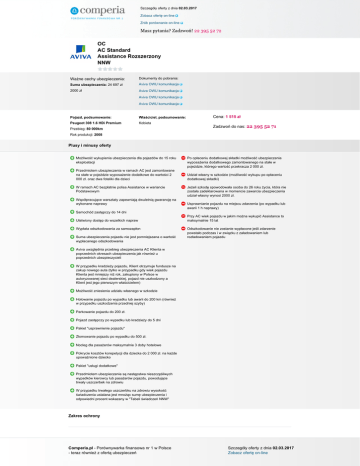 Szczegóły oferty z dnia 02.03.2017 Zobacz ofertę on-line Zrób porównanie on-line Masz pytania? Zadzwoń! 22 395 52 72 OC AC Standard Assistance Rozszerzony NNW Ważne cechy ubezpieczenia: Dokumenty do pobrania: Suma ubezpieczenia: 24 697 zł Aviva OWU komunikacja 2000 zł Aviva OWU komunikacja Aviva OWU komunikacja Aviva OWU komunikacja Pojazd, podsumowanie: Właściciel, podsumowanie: Peugeot 308 1.6 HDi Premium Kobieta Przebieg: 80 000km Cena: 1 515 zł Zadzwoń do nas: 22 395 52 71 Rok produkcji: 2008 Plusy i minusy oferty Możliwość wykupienia ubezpieczenia dla pojazdów do 15 roku eksploatacji Przedmiotem ubezpieczenia w ramach AC jest zamontowane na stałe w pojeździe wyposażenie dodatkowe do wartości 2 000 zł. oraz dwa foteliki dla dzieci W ramach AC bezpłatnie polisa Assistance w wariancie Podstawowym Współpracujące warsztaty zapewniają dwuletnią gwarancję na wykonane naprawy Po opłaceniu dodatkowej składki możliwość ubezpieczenia wyposażenia dodatkowego zamontowanego na stałe w pojeździe, którego wartość przekracza 2 000 zł. Udział własny w szkodzie (możliwość wykupu po opłaceniu dodatkowej składki) Jeżeli szkodę spowodowała osoba do 26 roku życia, która nie została zadeklarowana w momencie zawarcia ubezpieczenia udział własny wynosi 2000 zł. Usprawnianie pojazdu na miejscu zdarzenia (po wypadku lub awarii 1 h naprawy) Samochód zastępczy do 14 dni Ułatwiony dostęp do wszelkich napraw Wypłata odszkodowania za samozapłon Suma ubezpieczenia pojazdu nie jest pomniejszana o wartość wypłacanego odszkodowania Przy AC wiek pojazdu w jakim można wykupić Assistance to maksymalnie 15 lat Odszkodowanie nie zostanie wypłacone jeśli zdarzenie powstało podczas i w związku z załadowaniem lub rozładowaniem pojazdu Aviva uwzględnia przebieg ubezpieczenia AC Klienta w poprzednich okresach ubezpieczenia jak również u poprzednich ubezpieczycieli W przypadku kradzieży pojazdu, Klient otrzymuje fundusze na zakup nowego auta (tylko w przypadku gdy wiek pojazdu Klienta jest mniejszy niż rok, zakupiony w Polsce w autoryzowanej sieci dealerskiej, pojazd nie uszkodzony a Klient jest jego pierwszym właścicielem) Możliwość zniesienia udziału własnego w szkodzie Holowanie pojazdu po wypadku lub awarii do 200 km (również w przypadku uszkodzenia przedniej szyby) Parkowanie pojazdu do 200 zł. Pojazd zastępczy po wypadku lub kradzieży do 5 dni Pakiet "usprawnienie pojazdu" Złomowanie pojazdu po wypadku do 500 zł. Nocleg dla pasażerów maksymalnie 3 doby hotelowe Pokrycie kosztów korepetycji dla dziecka do 2 000 zł. na każde upoważnione dziecko Pakiet "usługi dodatkowe" Przedmiotem ubezpieczenia są następstwa nieszczęśliwych wypadków kierowcy lub pasażerów pojazdu, powodujące trwały uszczerbek na zdrowiu W przypadku trwałego uszczerbku na zdrowiu wysokość świadczenia ustalana jest mnożąc sumę ubezpieczenia i odpowiedni procent wskazany w "Tabeli świadczeń NNW" Zakres ochrony Comperia.pl - Porównywarka finansowa nr 1 w Polsce - teraz również z ofertą ubezpieczeń Szczegóły oferty z dnia 02.03.2017 Zobacz ofertę on-line Szczegóły oferty z dnia 02.03.2017 Zobacz ofertę on-line Zrób porównanie on-line Masz pytania? Zadzwoń! 22 395 52 72 Zakres ochrony ubezpieczenia OC Suma ubezpieczenia 5000000 na osobie 1000000 w mieniu Rozłożenie składki na raty Zielona karta Dodatkowe świadczenia w ramach OC Zakres ochrony ubezpieczenia AC Zderzenie z innym pojazdem Zderzenie z osobami, zwierzętami, lub przedmiotami znajdującymi się poza pojazdem Uszkodzenie przez osoby trzecie (wandalizm) Zamieszki, wewnętrzne niepokoje, wydarzenia wojenne Powstałych wskutek użycia pojazdu w związku z obowiązującymi świadczeniami na rzecz wojska i policji Wybuch Nagłe działanie czynnika termicznego lub chemicznego pochodzącego z zewnątrz pojazdu Powódź Lawina Osunięcie i zapadanie się ziemi Grad Uderzenie pioruna Huragan Trzęsienie ziemi Kradzież pojazdu z wyłączeniami Rabunek/Rozbój z wyłączeniami Upadek statku powietrznego Pożar Zakres ochrony Assistance Suma ubezpieczenia Zakres terytorialny Wiek pojazdu do którego można wykupić ubezpieczenie Rodzaj pojazdu na który można wykupić ubezpieczenie Ograniczenia ze względu na sposób użytkowania pojazdu (np. taxi, nauka jazdy, rent a car) Opcje zawarcia Usprawnienie pojazdu na miejscu zdarzenia Pomoc w razie awarii Pomoc w razie wypadku Limit odległości od miejsca zamieszkania Miejsce holowania Samochód zastępczy Złomowanie pojazdu Parkowanie pojazdu Transport zastępczy/przewóz osób Nocleg/zakwaterowanie Dodatkowe informacje Comperia.pl - Porównywarka finansowa nr 1 w Polsce - teraz również z ofertą ubezpieczeń Szczegóły oferty z dnia 02.03.2017 Zobacz ofertę on-line Szczegóły oferty z dnia 02.03.2017 Zobacz ofertę on-line Zrób porównanie on-line Masz pytania? Zadzwoń! 22 395 52 72 Zakres ochrony NNW Suma ubezpieczenia 50000 zł Wypłata świadczenia w razie śmierci W przypadku śmierci spowodowanej nieszczęśliwym wypadkiem wówczas 50% świadczenia(w wariancie podstawowym). 100% świadczenia (w wariancie rozszerzonym) Wsiadanie i wysiadanie z pojazdu Załadowanie lub wyładowanie pojazdu Pożar, wybuch pojazdu Zatrzymanie, postój, naprawa pojazdu Podwójne świadczenie w przypadku 90% trwałego uszczerbku na zdrowiu Garażowanie pojazdu Terytorium ochrony Terytorium ochrony ubezpieczenia AC Kraje Unii Europejskiej Algeria Albania Libia Maroko Mołdawia bez kradzieży i wyposażenia dodatkowego Białoruś bez kradzieży i wyposażenia dodatkowego Rosja (część europejska) Czarnogóra Serbia Bośnia i Hercegowina Tunezja Iran Turcja Izrael Ukraina bez kradzieży i wyposażenia dodatkowego Wyłączenia Wyłączenia ubezpieczenia AC Udział własny w szkodzie Możliwość zniesienia Amortyzacja za części Wariant serwis- brak.Wprowadzona w wariancie kosztorys Rodzaj stacji naprawczej (ze względu na metodę naprawy) Fakt