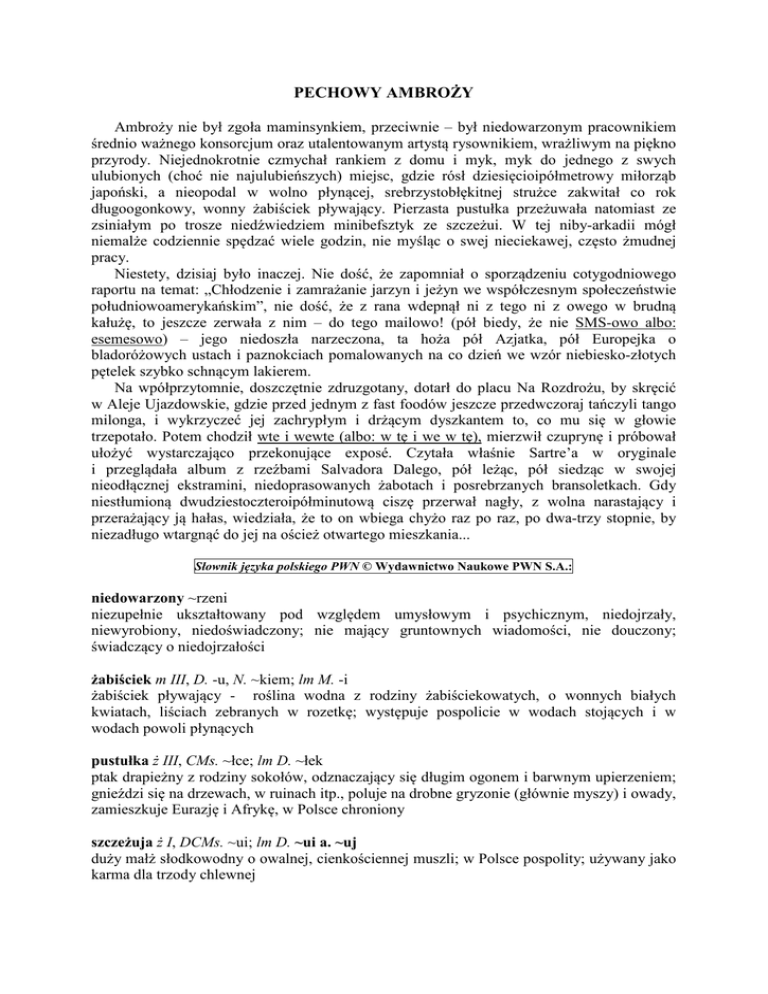 PECHOWY AMBROŻY Ambroży nie był zgoła maminsynkiem, przeciwnie – był niedowarzonym pracownikiem średnio ważnego konsorcjum oraz utalentowanym artystą rysownikiem, wrażliwym na piękno przyrody. Niejednokrotnie czmychał rankiem z domu i myk, myk do jednego z swych ulubionych (choć nie najulubieńszych) miejsc, gdzie rósł dziesięcioipółmetrowy miłorząb japoński, a nieopodal w wolno płynącej, srebrzystobłękitnej strużce zakwitał co rok długoogonkowy, wonny żabiściek pływający. Pierzasta pustułka przeżuwała natomiast ze zsiniałym po trosze niedźwiedziem minibefsztyk ze szczeżui. W tej niby-arkadii mógł niemalże codziennie spędzać wiele godzin, nie myśląc o swej nieciekawej, często żmudnej pracy. Niestety, dzisiaj było inaczej. Nie dość, że zapomniał o sporządzeniu cotygodniowego raportu na temat: „Chłodzenie i zamrażanie jarzyn i jeżyn we współczesnym społeczeństwie południowoamerykańskim”, nie dość, że z rana wdepnął ni z tego ni z owego w brudną kałużę, to jeszcze zerwała z nim – do tego mailowo! (pół biedy, że nie SMS-owo albo: esemesowo) – jego niedoszła narzeczona, ta hoża pół Azjatka, pół Europejka o bladoróżowych ustach i paznokciach pomalowanych na co dzień we wzór niebiesko-złotych pętelek szybko schnącym lakierem. Na wpółprzytomnie, doszczętnie zdruzgotany, dotarł do placu Na Rozdrożu, by skręcić w Aleje Ujazdowskie, gdzie przed jednym z fast foodów jeszcze przedwczoraj tańczyli tango milonga, i wykrzyczeć jej zachrypłym i drżącym dyszkantem to, co mu się w głowie trzepotało. Potem chodził wte i wewte (albo: w tę i we w tę), mierzwił czuprynę i próbował ułożyć wystarczająco przekonujące exposé. Czytała właśnie Sartre’a w oryginale i przeglądała album z rzeźbami Salvadora Dalego, pół leżąc, pół siedząc w swojej nieodłącznej ekstramini, niedoprasowanych żabotach i posrebrzanych bransoletkach. Gdy niestłumioną dwudziestoczteroipółminutową ciszę przerwał nagły, z wolna narastający i przerażający ją hałas, wiedziała, że to on wbiega chyżo raz po raz, po dwa-trzy stopnie, by niezadługo wtargnąć do jej na oścież otwartego mieszkania... Słownik języka polskiego PW © Wydawnictwo aukowe PW S.A.: niedowarzony ~rzeni niezupełnie ukształtowany pod względem umysłowym i psychicznym, niedojrzały, niewyrobiony, niedoświadczony; nie mający gruntownych wiadomości, nie douczony; świadczący o niedojrzałości żabiściek m III, D. -u, . ~kiem; lm M. -i żabiściek pływający - roślina wodna z rodziny żabiściekowatych, o wonnych białych kwiatach, liściach zebranych w rozetkę; występuje pospolicie w wodach stojących i w wodach powoli płynących pustułka ż III, CMs. ~łce; lm D. ~łek ptak drapieżny z rodziny sokołów, odznaczający się długim ogonem i barwnym upierzeniem; gnieździ się na drzewach, w ruinach itp., poluje na drobne gryzonie (głównie myszy) i owady, zamieszkuje Eurazję i Afrykę, w Polsce chroniony szczeżuja ż I, DCMs. ~ui; lm D. ~ui a. ~uj duży małż słodkowodny o owalnej, cienkościennej muszli; w Polsce pospolity; używany jako karma dla trzody chlewnej hoży m. os. hoży (nie: hozi), st. w. bardziej hoży książk. «żwawy, urodziwy, dziarski»: Hoża dziewczyna. Hoży młodzieńcy. pół-Polak pół-Polaka, pół-Polakiem; pół-Polacy, pół-Polaków (ale: pół Polak, pół Rosjanin) wpół- pierwszy człon wyrazów złożonych określający częściowe, połowiczne występowanie właściwości wyrażonej w drugim członie złożenia, np. wpółnagi, wpółprzymknięty; wpółprzytomnie, wpółdarmo; wpółleżeć, wpółdrzemać plac -cu; -ce, -ców (skrót: pl.): plac Konstytucji, plac Solny, plac a Rozdrożu, plac Sejmu Śląskiego aleja -ei, -eję; -ei a. -ej: aleja Mickiewicza, aleja Korfantego, aleja Róż, aleja Kasztanowa, ale: Aleje Jerozolimskie, Aleje Ujazdowskie wte i wewte (nie: w te i wewte) pot., p. w tę i we w tę: Przestań biegać wte i wewte. exposé [wym. ekspoze] n ndm wypowiedź programowa szefa lub innego członka rządu w parlamencie, przedstawiająca ogólną linię polityczną rządu lub jego zamierzenia w określonej dziedzinie; wygłaszane zwykle po powołaniu nowego rządu Sartre: Jean Paul Sartre, Jeana Paula Sart·re’a, Jeanem Paulem Sart·re’em, o Jeanie Paulu Sart·rze Dali: Sal·vador (a. Salwador) Dali, Sal·vadora Dalego (a. Sal·vadora Dali), o Sal·vadorze Dalim (a. o Sal·vadorze Dali) ekstra- I początkowy człon złożonych rzeczowników i przymiotników, pisany łącznie, o znaczeniu ‘bardzo, niezwykle, nadzwyczaj, najlepszy, wyborny‘, np. ekstraklasa, ekstranowoczesny, ekstrapoczta; jego synonimem bywa przedrostek super-. Element bardzo modny i nadużywany, czemu sprzyja jego uniwersalna łączliwość. chyży ~ższy książk. «szybko poruszający się lub szybko poruszany, wykonywany; prędki, szybki, żwawy, zwinny»