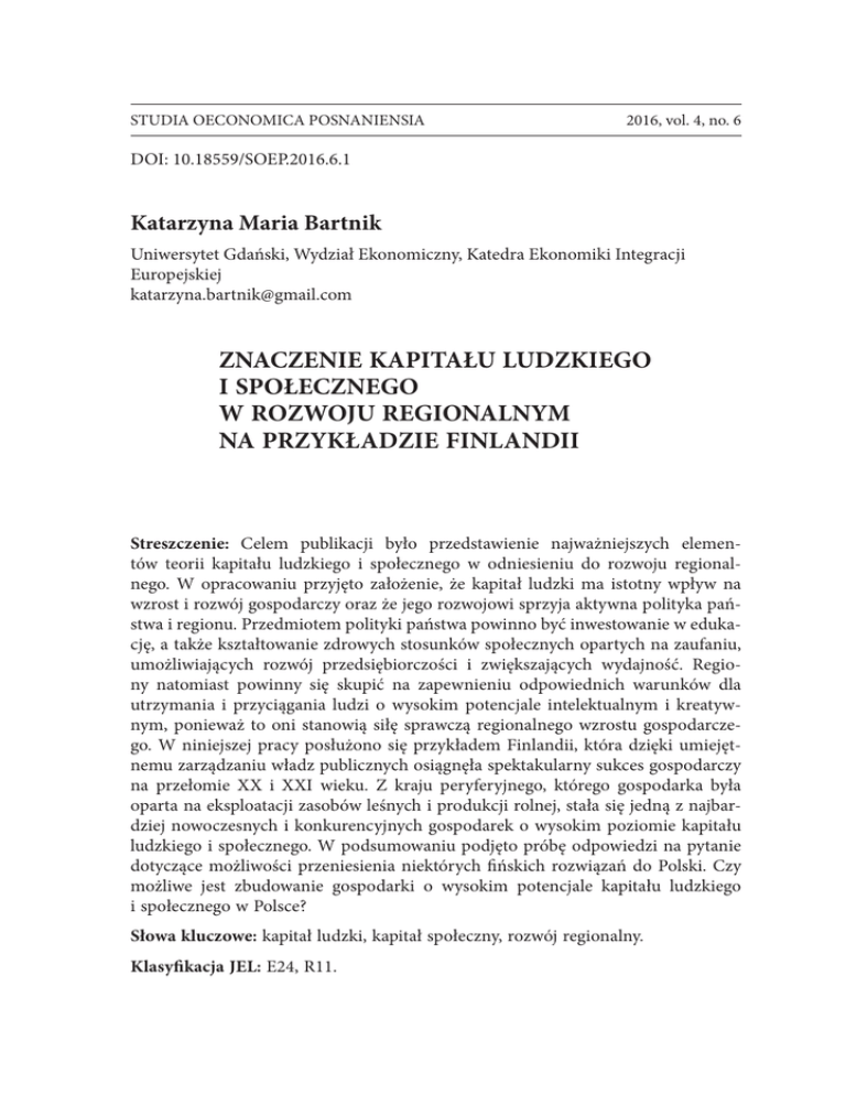 STUDIA OECONOMICA POSNANIENSIA 2016, vol. 4, no. 6 DOI: 10.18559/SOEP.2016.6.1 Katarzyna Maria Bartnik Uniwersytet Gdański, Wydział Ekonomiczny, Katedra Ekonomiki Integracji Europejskiej [email protected] ZNACZENIE KAPITAŁU LUDZKIEGO I SPOŁECZNEGO W ROZWOJU REGIONALNYM NA PRZYKŁADZIE FINLANDII Streszczenie: Celem publikacji było przedstawienie najważniejszych elementów teorii kapitału ludzkiego i społecznego w odniesieniu do rozwoju regionalnego. W opracowaniu przyjęto założenie, że kapitał ludzki ma istotny wpływ na wzrost i rozwój gospodarczy oraz że jego rozwojowi sprzyja aktywna polityka państwa i regionu. Przedmiotem polityki państwa powinno być inwestowanie w edukację, a także kształtowanie zdrowych stosunków społecznych opartych na zaufaniu, umożliwiających rozwój przedsiębiorczości i zwiększających wydajność. Regiony natomiast powinny się skupić na zapewnieniu odpowiednich warunków dla utrzymania i przyciągania ludzi o wysokim potencjale intelektualnym i kreatywnym, ponieważ to oni stanowią siłę sprawczą regionalnego wzrostu gospodarczego. W niniejszej pracy posłużono się przykładem Finlandii, która dzięki umiejętnemu zarządzaniu władz publicznych osiągnęła spektakularny sukces gospodarczy na przełomie XX i XXI wieku. Z kraju peryferyjnego, którego gospodarka była oparta na eksploatacji zasobów leśnych i produkcji rolnej, stała się jedną z najbardziej nowoczesnych i konkurencyjnych gospodarek o wysokim poziomie kapitału ludzkiego i społecznego. W podsumowaniu podjęto próbę odpowiedzi na pytanie dotyczące możliwości przeniesienia niektórych fińskich rozwiązań do Polski. Czy możliwe jest zbudowanie gospodarki o wysokim potencjale kapitału ludzkiego i społecznego w Polsce? Słowa kluczowe: kapitał ludzki, kapitał społeczny, rozwój regionalny. Klasyfikacja JEL: E24, R11. 8 Katarzyna Maria Bartnik THE IMPORTANCE OF HUMAN AND SOCIAL CAPITAL IN THE REGIONAL DEVELOPMENT: THE CASE STUDY OF FINLAND Abstract: The aim of the publication is to present the most important elements of human and social capital theory in relation to regional development. The study assumes that human capital has a significant impact on economic growth and development and that its development is supported by an active policy of the state and the region. The subject of state policy should be investing in education, but also the reinforcement of healthy social relations based on trust, enabling the development of entrepreneurship and increasing productivity. Regions, however, should focus on providing adequate conditions for maintaining and attracting people with high intellectual and creative potential, because they are the driving force behind regional economic growth. In this paper, the example of Finland was used, which, thanks to the skillful management of the public authorities, has achieved spectacular economic success at the turn of the twentieth and twenty-first centuries. From a peripheral country whose economy was based on the exploitation of forest resources and agricultural production, it has become one of the most modern and competitive economies, with high levels of human and social capital. In the conclusion, the possibility was discussed of transferring some of the Finnish solutions to Poland. Is it possible to create an economy with high potential of human and social capital in Poland? Keywords: human capital, social capital, regional development. Wstęp Podstawowym wyzwaniem dla państw i regionów w XXI wieku stało się budowanie gospodarki opartej na wiedzy, w której kluczową rolę odgrywa kapitał ludzki. Koncepcja gospodarki opartej na wiedzy po raz pierwszy została omówiona przez F. Machlupa [1962], natomiast spopularyzował ją P. Drucker [1994], który pisał o powstaniu nowej ery, nazywając ją erą społeczeństwa wiedzy. W nowym systemie to nie praca, surowce czy kapitał są podstawowym zasobem, lecz wiedza, która pozwala na osiągnięcie konkurencyjności i wysokiego poziomu rozwoju. Nośnikiem tej wiedzy jest wysokiej jakości kapitał ludzki. 1. Pojęcie kapitału ludzkiego Zainteresowanie wpływem wiedzy i zdolności człowieka na dobrobyt narodu sięga początków historii myśli ekonomicznej. Pierwsze badania dotyczą- Znaczenie kapitału ludzkiego i społecznego w rozwoju regionalnym9 ce kapitału ludzkiego przeprowadził William Petty w XVII wieku, traktując umiejętności ludzkie jako element składowy kapitału trwałego. Również Adam Smith w fundamentalnym dla ekonomii dziele Badania nad naturą i przyczynami bogactwa narodów z 1776 roku zwrócił uwagę na pożyteczne umiejętności nabywane przez członków społeczeństwa. Uważał, że wiedza i kwalifikacje ludzi wpływają na wydajność pracy, która bezpośrednio przekłada się na powiększanie bogactwa narodu. Kontynuatorami rozważań na temat roli człowieka byli tacy ekonomiści, jak J.S. Mill, K. Marks, A. Marshall czy T. Veblen. Jednak wiedza na ten temat została uporządkowana i ugruntowana dopiero w latach 60. XX wieku, dzięki pracom i badaniom prowadzonym przez J. Mincera, T. Schultza i G. Beckera. Na podstawie ich dokonań powstała teoria kapitału ludzkiego. Teoria kapitału ludzkiego przyniosła zupełnie nowe spojrzenie na istotę ludzką i jej zdolności. W pracy z 1958 roku J. Mincer zwrócił uwagę na szczególną rolę kapitału ludzkiego w kształtowaniu różnic pomiędzy wynagrodzeniami pracowników. Uważał, że wynagrodzenia pracowników zależą od długości okresów edukacji formalnej i doświadczenia zawodowego. Pracownicy bardziej wykształceni i posiadający dłuższy staż pracy są bardziej wydajni i przez to otrzymują wyższe wynagrodzenia. Następnie T. Schultz w 1961 roku w swojej pracy postawił tezę, że nabyte kompetencje i wiedzę pracowników można uznać za formę kapitału, który pozwoli wyjaśnić, dlaczego w XX wieku wzrost gospodarczy stał się tak szybki, mimo że wzrost zas