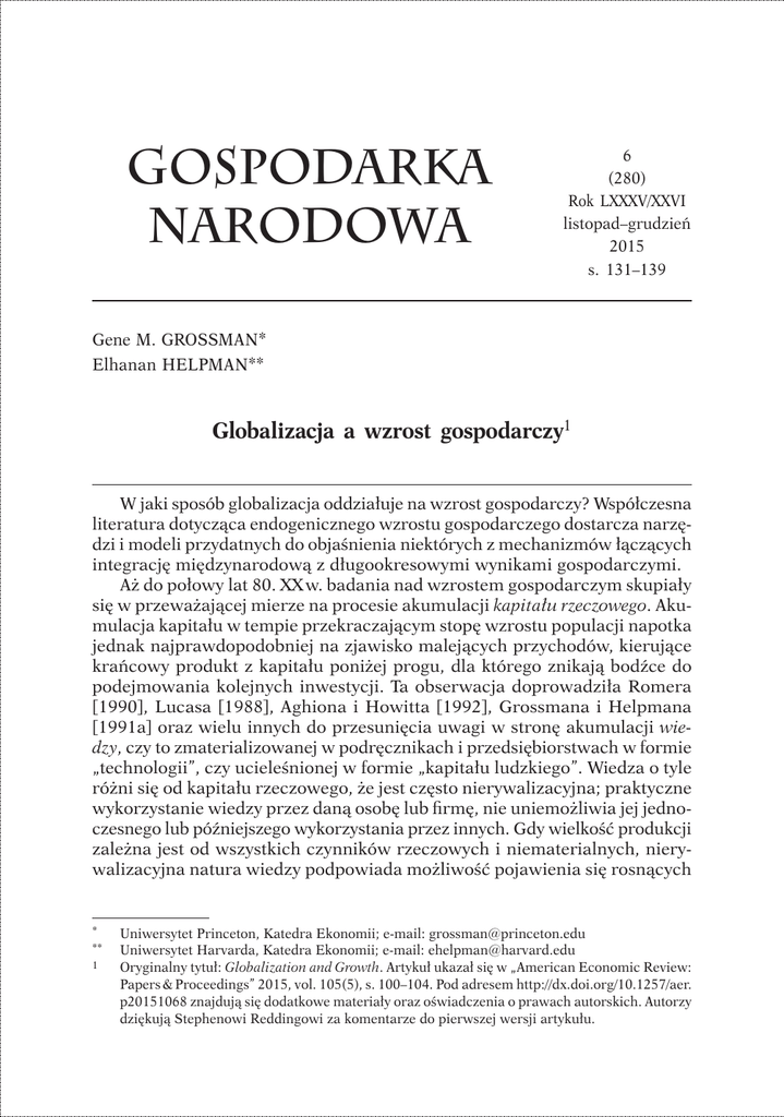 131 Gene M. Grossman, Elhanan Helpman, Globalizacja a wzrost gospodarczy Gospodarka narodowa 6 (280) Rok LXXXV/XXVI listopad–grudzień 2015 s. 131–139 Gene M. GROSSMAN* Elhanan HELPMAN** Globalizacja a wzrost gospodarczy1 W jaki sposób globalizacja oddziałuje na wzrost gospodarczy? Współczesna literatura dotycząca endogenicznego wzrostu gospodarczego dostarcza narzędzi i modeli przydatnych do objaśnienia niektórych z mechanizmów łączących integrację międzynarodową z długookresowymi wynikami gospodarczymi. Aż do połowy lat 80. XX w. badania nad wzrostem gospodarczym skupiały się w przeważającej mierze na procesie akumulacji kapitału rzeczowego. Akumulacja kapitału w tempie przekraczającym stopę wzrostu populacji napotka jednak najprawdopodobniej na zjawisko malejących przychodów, kierujące krańcowy produkt z kapitału poniżej progu, dla którego znikają bodźce do podejmowania kolejnych inwestycji. Ta obserwacja doprowadziła Romera [1990], Lucasa [1988], Aghiona i Howitta [1992], Grossmana i Helpmana [1991a] oraz wielu innych do przesunięcia uwagi w stronę akumulacji wiedzy, czy to zmaterializowanej w podręcznikach i przedsiębiorstwach w formie „technologii”, czy ucieleśnionej w formie „kapitału ludzkiego”. Wiedza o tyle różni się od kapitału rzeczowego, że jest często nierywalizacyjna; praktyczne wykorzystanie wiedzy przez daną osobę lub firmę, nie uniemożliwia jej jednoczesnego lub późniejszego wykorzystania przez innych. Gdy wielkość produkcji zależna jest od wszystkich czynników rzeczowych i niematerialnych, nierywalizacyjna natura wiedzy podpowiada możliwość pojawienia się rosnących * ** 1 Uniwersytet Princeton, Katedra Ekonomii; e-mail: [email protected] Uniwersytet Harvarda, Katedra Ekonomii; e-mail: [email protected] Oryginalny tytuł: Globalization and Growth. Artykuł ukazał się w „American Economic Review: Papers & Proceedings” 2015, vol. 105 (5), s. 100–104. Pod adresem http://dx.doi.org/10.1257/aer. p20151068 znajdują się dodatkowe materiały oraz oświadczenia o prawach autorskich. Autorzy dziękują Stephenowi Reddingowi za komentarze do pierwszej wersji artykułu. 132 GOSPODARKA NARODOWA nr 6/2015 korzyści skali, co odsuwa nieuchronność wystąpienia malejących przychodów niektórych czynników produkcji względem innych. Nowe modele akumulacji wiedzy odsłaniają kilka potencjalnych połączeń pomiędzy integracją międzynarodową a wzrostem gospodarczym. Badania skoncentrowały się na tym, jak międzynarodowa wymiana dóbr i idei oddziałuje na charakter zachęt do przyswajania wiedzy oraz skuteczności procesu powstawania wynalazków i rozprzestrzeniania się wiedzy. Kilka z tych mechanizmów zajmuje w literaturze przedmiotu wyróżnione miejsce. Po pierwsze, integracja pomiędzy ludźmi i kulturami ułatwia przepływ wiedzy ponad granicami państw. Zagraniczne idee mogą okazać się przydatne do powstawania nowych produktów, ulepszania tych już istniejących lub wytwarzania ich po niższych kosztach. Po drugie, integracja rynków produktowych przez handel międzynarodowy wynagradza tych, którzy odkrywają lub ulepszają produkty, oferując im większy potencjalny rynek zbytu, na którym mogą czerpać zyski, nawet jeśli wystawia ich to na dodatkową konkurencję ze strony zagranicznych rywali. W zależności od tego, czy wraz z postępującą integracją, silniejszy okaże się efekt skali, czy efekt konkurencji, zachęty do innowacji mogą ulec intensyfikacji lub osłabieniu. Po trzecie, integracja światowych rynków posiada implikacje dla cen czynników produkcji oraz względnych cen produktów ujętych w ramach równowagi ogólnej. Te zmiany cen oddziałują zarówno na koszty podejmowanych innowacji, jak i na stosunkową atrakcyjność alternatywnych kierunków badań przemysłowych. Międzynarodowe interakcje wpływają wreszcie nie tylko na zachęty do kreacji nowej wiedzy, ale także do rozprzestrzeniania się technologii, razem z towarzyszącymi jej skutkami dla wzrostu produktywności. Wielu autorów badało dotychczas, w jaki sposób jeden lub więcej z tych mechanizmów funkcjonuje w konkretnych uwarunkowaniach gospodarczych. Zebrana literatura przedmiotu oferuje wgląd w wiele teoretycznych kwestii z tego obszaru. Pewien postęp został również osiągnięty w analizach empirycznych, choć utrudnienia związane z danymi i metodami badawczymi pozostawiły w tyle kwestie oceny i pomiaru omawianych zjawisk. I. Międzynarodowe efekty zewnętrzne wiedzy Najbardziej bezpośredni związek pomiędzy globalizacją a wzrostem gospodarczym powstaje, kiedy wiedza zdobyta w jednym kraju może zostać wykorzystana do umożliwienia badań w innym państwie. Naukowcy wymieniają idee, kiedy spotykają się na międzynarodowych konferencjach. Wiedza przepływa wraz z biznesowymi transakcjami i innymi kanałami wzajemnego oddziaływania pomiędzy ludźmi. Proces uczenia się od zagranicy może występować bez osobistego kontaktu, poprzez publikacje lub inżynierię wsteczną. Helpman [2004] podsumowuje zbiór badań empirycznych potwierdzających występowanie istotnego zakresu międzynarodowych efektów zewnętrznych wiedzy. Coe i Helpman [1995], Eaton i Kortum [1999] i inni stwierdzili równocześnie, Gene M. Grossman, Elhanan Helpman, Globalizacja a wzrost gospodarczy 133 że efekty te są dalece niepełne, pozostawiając przestrzeń dla dalszej integracji gospodarki światowej i podniesienia zasobu wiedzy w ujęciu globalnym. Romer [1990] rozwinął model, w którym wiedza zakumulowana w trakcie działalności badawczo-rozwojowej zwiększa produktywność przyszłych wysiłków innowacyjnych. Grossman i Helpman [1991a] zezwolili w swoim modelu na międzynarodowe przepływy wiedzy, dzięki którym zasób wiedzy wyznaczający wydajność opracowywania nowych produktów odzwierciedla doświadczenia zebrane w kraju i za granicą lub inne sposoby podnoszenia jakości produkcji w k