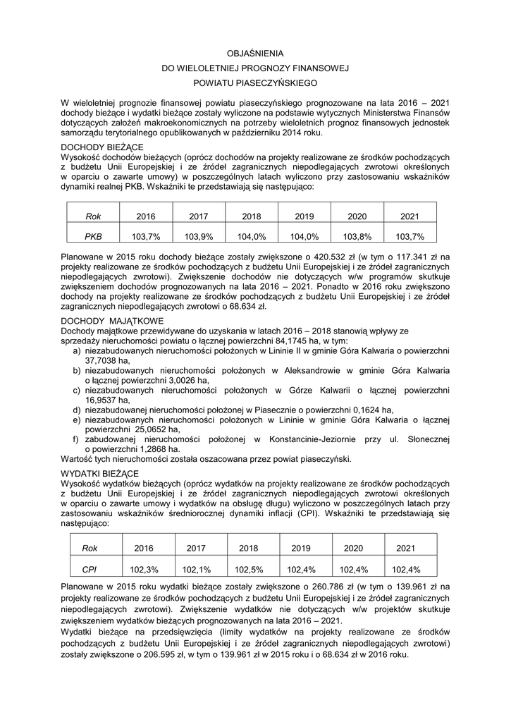 OBJAŚNIENIA DO WIELOLETNIEJ PROGNOZY FINANSOWEJ POWIATU PIASECZYŃSKIEGO W wieloletniej prognozie finansowej powiatu piaseczyńskiego prognozowane na lata 2016 – 2021 dochody bieżące i wydatki bieżące zostały wyliczone na podstawie wytycznych Ministerstwa Finansów dotyczących założeń makroekonomicznych na potrzeby wieloletnich prognoz finansowych jednostek samorządu terytorialnego opublikowanych w październiku 2014 roku. DOCHODY BIEŻĄCE Wysokość dochodów bieżących (oprócz dochodów na projekty realizowane ze środków pochodzących z budżetu Unii Europejskiej i ze źródeł zagranicznych niepodlegających zwrotowi określonych w oparciu o zawarte umowy) w poszczególnych latach wyliczono przy zastosowaniu wskaźników dynamiki realnej PKB. Wskaźniki te przedstawiają się następująco: Rok 2016 2017 2018 2019 2020 2021 PKB 103,7% 103,9% 104,0% 104,0% 103,8% 103,7% Planowane w 2015 roku dochody bieżące zostały zwiększone o 420.532 zł (w tym o 117.341 zł na projekty realizowane ze środków pochodzących z budżetu Unii Europejskiej i ze źródeł zagranicznych niepodlegających zwrotowi). Zwiększenie dochodów nie dotyczących w/w programów skutkuje zwiększeniem dochodów prognozowanych na lata 2016 – 2021. Ponadto w 2016 roku zwiększono dochody na projekty realizowane ze środków pochodzących z budżetu Unii Europejskiej i ze źródeł zagranicznych niepodlegających zwrotowi o 68.634 zł. DOCHODY MAJĄTKOWE Dochody majątkowe przewidywane do uzyskania w latach 2016 – 2018 stanowią wpływy ze sprzedaży nieruchomości powiatu o łącznej powierzchni 84,1745 ha, w tym: a) niezabudowanych nieruchomości położonych w Lininie II w gminie Góra Kalwaria o powierzchni 37,7038 ha, b) niezabudowanych nieruchomości położonych w Aleksandrowie w gminie Góra Kalwaria o łącznej powierzchni 3,0026 ha, c) niezabudowanych nieruchomości położonych w Górze Kalwarii o łącznej powierzchni 16,9537 ha, d) niezabudowanej nieruchomości położonej w Piasecznie o powierzchni 0,1624 ha, e) niezabudowanych nieruchomości położonych w Lininie w gminie Góra Kalwaria o łącznej powierzchni 25,0652 ha, f) zabudowanej nieruchomości położonej w Konstancinie-Jeziornie przy ul. Słonecznej o powierzchni 1,2868 ha. Wartość tych nieruchomości została oszacowana przez powiat piaseczyński. WYDATKI BIEŻĄCE Wysokość wydatków bieżących (oprócz wydatków na projekty realizowane ze środków pochodzących z budżetu Unii Europejskiej i ze źródeł zagranicznych niepodlegających zwrotowi określonych w oparciu o zawarte umowy i wydatków na obsługę długu) wyliczono w poszczególnych latach przy zastosowaniu wskaźników średniorocznej dynamiki inflacji (CPI). Wskaźniki te przedstawiają się następująco: Rok 2016 2017 2018 2019 2020 2021 CPI 102,3% 102,1% 102,5% 102,4% 102,4% 102,4% Planowane w 2015 roku wydatki bieżące zostały zwiększone o 260.786 zł (w tym o 139.961 zł na projekty realizowane ze środków pochodzących z budżetu Unii Europejskiej i ze źródeł zagranicznych niepodlegających zwrotowi). Zwiększenie wydatków nie dotyczących w/w projektów skutkuje zwiększeniem wydatków bieżących prognozowanych na lata 2016 – 2021. Wydatki bieżące na przedsięwzięcia (limity wydatków na projekty realizowane ze środków pochodzących z budżetu Unii Europejskiej i ze źródeł zagranicznych niepodlegających zwrotowi) zostały zwiększone o 206.595 zł, w tym o 139.961 zł w 2015 roku i o 68.634 zł w 2016 roku. Wprowadzone zmiany wysokości wydatków bieżących na przedsięwzięcia w 2015 roku (limitów zobowiązań na programy realizowane ze środków pochodzących z budżetu Unii Europejskiej i ze źródeł zagranicznych niepodlegających zwrotowi) dotyczą następujących przedsięwzięć: a) projektu dofinansowanego ze środków pochodzących z budżetu Unii Europejskiej pn.: „Łbiska – moja przystań” (zwiększenie się o 16.551 zł). Zakres rzeczowy pozostaje bez zmian, b) projektu dofinansowanego ze środków pochodzących z budżetu Unii Europejskiej pn.: „„Utrzymajmy jakość” (zwiększenie się o 6.203 zł). Zakres rzeczowy pozostaje bez zmian, c) nowego projektu finansowanego z budżetu Unii Europejskiej pn. "Zagraniczna mobilność kadry edukacji szkolnej”. Projekt jest realizowany przez Liceum Ogólnokształcące w Piasecznie w ramach Programu Operacyjnego Wiedza Edukacja Rozwój. Limit wydatków na realizacje tego projektu wynosi 185.841 zł, w tym: w roku 2015 – 117.207 zł i w roku 2016 – 68.634 zł. Wysokość wydatków na obsługę długu określono w oparciu o harmonogramy spłat kredytów oraz wykupu obligacji komunalnych. WYDATKI MAJĄTKOWE Wydatki majątkowe na przedsięwzięcia (w zakresie limitów wydatków na projekty realizowane ze środków pochodzących z budżetu Unii Europejskiej i ze źródeł zagranicznych niepodlegających zwrotowi) zostały zmniejszone w 2015 roku o 444.910 zł. Wprowadzone zmiany wysokości wydatków dotyczą następujących przedsięwzięć: a) projektu dofinansowanego ze środków pochodzących z budżetu Unii Europejskiej pn.: "Przyspieszenie wzrostu konkurencyjności województwa mazowieckiego przez budowanie społeczeństwa informacyjnego i gospodarki opartej na wiedzy poprzez stworzenie zintegrowanych baz wiedzy o Mazowszu" (zmniejszenie o 436.496 zł). Zakres rzeczowy pozostaje bez zmian, b) projektu dofinansowanego ze środków pochodzących z budżetu Unii Europejskiej pn.: "Rozwój elektronicznej administracji w samorządach województwa mazowieckiego wspomagającej niwelowanie dwudzielności potencjału województwa” (zmniejszenie o 8.414 zł). Zakres rzeczowy pozostaje bez zmian. Wydatki majątkowe na przedsięwzięcia (w zakresie limitów zobowiązań na zadania inwestycyjne) w 2015 roku zwiększono o 2.300.000 zł. Jednocześnie zmniejszeniu uległy limity zobowiązań w 2016 roku o 1.200.000 zł i w 2017 roku o 1.100.000 zł. Wprowadzone z