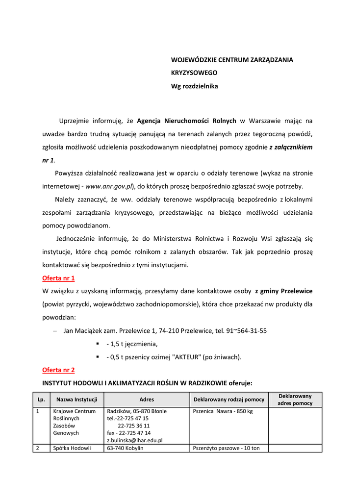 WOJEWÓDZKIE CENTRUM ZARZĄDZANIA KRYZYSOWEGO Wg rozdzielnika Uprzejmie informuję, że Agencja Nieruchomości Rolnych w Warszawie mając na uwadze bardzo trudną sytuację panującą na terenach zalanych przez tegoroczną powódź, zgłosiła możliwość udzielenia poszkodowanym nieodpłatnej pomocy zgodnie z załącznikiem nr 1. Powyższa działalność realizowana jest w oparciu o odziały terenowe (wykaz na stronie internetowej - www.anr.gov.pl), do których proszę bezpośrednio zgłaszać swoje potrzeby. Należy zaznaczyć, że ww. oddziały terenowe współpracują bezpośrednio z lokalnymi zespołami zarządzania kryzysowego, przedstawiając na bieżąco możliwości udzielania pomocy powodzianom. Jednocześnie informuję, że do Ministerstwa Rolnictwa i Rozwoju Wsi zgłaszają się instytucje, które chcą pomóc rolnikom z zalanych obszarów. Tak jak poprzednio proszę kontaktować się bezpośrednio z tymi instytucjami. Oferta nr 1 W związku z uzyskaną informacją, przesyłamy dane kontaktowe osoby z gminy Przelewice (powiat pyrzycki, województwo zachodniopomorskie), która chce przekazać nw produkty dla powodzian: Jan Maciążek zam. Przelewice 1, 74-210 Przelewice, tel. 91~564-31-55 - 1,5 t jęczmienia, - 0,5 t pszenicy ozimej "AKTEUR" (po żniwach). Oferta nr 2 INSTYTUT HODOWLI I AKLIMATYZACJI ROŚLIN W RADZIKOWIE oferuje: Lp. Nazwa Instytucji 1 Krajowe Centrum Roślinnych Zasobów Genowych 2 Spółka Hodowli Adres Radzików, 05-870 Błonie tel.-22-725 47 15 22-725 36 11 fax - 22-725 47 14 [email protected] 63-740 Kobylin Deklarowany rodzaj pomocy Pszenica Nawra - 850 kg Pszenżyto paszowe - 10 ton Deklarowany adres pomocy Lp. Nazwa Instytucji Roślin Smolice Sp.z o.o 3 Spółka Hodowli Roślin Zamarte Sp.z o.o Oddział Stare Olesno 4 Zakład Doświadczalny Hodowli i Aklimatyzacji Roślin - Oleśnica Mała Adres tel. 65-548 24 20 fax – 65-548 10 70 [email protected] 89-430 Kamień Krajeński tel. 52-388 15 76 fax 52-388 15 74 Stare Olesno: tel. 34-358 22 01 fax 34-358 22 02 [email protected] 55-200 Oława tel. 71-301 50 50 fax 71- 301 50 85 [email protected] Deklarowany rodzaj pomocy Deklarowany adres pomocy Jęczmień na cele paszowe 20 ton Zboże siewne - 1 tona Siano - 5 ton Powiat Oławski PROŚBA O POMOC - POTRZEBY W związku z klęską powodzi, która nastąpiła na terenie województwa Wojewoda Małopolski zwrócił się z prośbą o bezpłatne zabezpieczenie 1 089 ton pasz dla 12 gmin w tym: 757 ton dla trzody chlewnej, 209 ton dla bydła i koni, 123 tony dla drobiu, z przeznaczeniem dla gospodarstw rolnych prowadzących produkcję zwierzęcą, które utraciły większość plonów. Podana wyżej ilość paszy jest niezbędna do zaspokojenia potrzeb życiowych wymienionych zwierząt gospodarskich. W przypadku zgłoszenia chęci pomocy w zakresie dostarczenia potrzebnych pasz proszę o bezpośredni kontakt z Wojewódzkim Centrum Zarządzania Kryzysowego w Krakowie (Wydział Rolnictwa, ul. Basztowa 22, 31-156 Kraków, tel. 12 39 21 873 fax. 12 39 21 481, e-mail: [email protected] W miarę posiadania nowych informacji w przedmiotowym temacie, będziecie Państwo informowani oddzielnymi pismami. z upoważnienia Ministra Rolnictwa i Rozwoju Wsi płk Mieczysław Mosakowski Sekretarz Zespołu Zarządzania Kryzysowego Ministerstwa Rolnictwa i Rozwoju Wsi Centrum Zarządzania Kryzysowego MRiRW tel. 22 623 13 31 fax. 22 623 20 26 tel. kom. 0~798 463 468 [email protected] ROZDZIELNIK: 1. Wojewoda dolnośląski; 2. Wojewoda kujawsko-pomorski; 3. Wojewoda lubelski; 4. Wojewoda lubuski; 5. Wojewoda łódzki; 6. Wojewoda małopolski; 7. Wojewoda mazowiecki; 8. Wojewoda opolski; 9. Wojewoda podkarpacki; 10. Wojewoda podlaski; 11. Wojewoda śląski; 12. Wojewoda świętokrzyski; 13. Wojewoda wielkopolski; Do wiadomości: 1. Prezes Agencji Nieruchomości Rolnych w Warszawie; 2. Dyrektor Rządowego Centrum Bezpieczeństwa; 3. Instytut Hodowli i Aklimatyzacji Roślin w Radzikowie; 4. Gmina Przelewice.