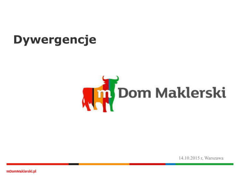 Dywergencje 14.10.2015 r, Warszawa Klaudia Morawska Absolwentka Uniwersytetu Warszawskiego. Z rynkami finansowymi związana od 2011 roku. Specjalizuje się w analizie mechanizmów psychologicznych mających wpływ na proces inwestowania. Pracownik Domu Maklerskiego mBanku od 2014 roku. Na co dzień odpowiedzialna za wsparcie Klientów oraz prowadzenie szkoleń. Do głównych zainteresowań należy badanie rozwoju polskiego złotego na rynku Forex oraz czytanie książek. Dywergencje |2 Pojęcie dywergencji Dywergencja – rozbieżność, tworzą ją nieprawidłowości w kształtowaniu się wykresu wskaźnika w stosunku do wykresu ceny Wyróżnić możemy dwa główne rodzaje dywergencji: • Regularną służy najczęściej do wyznaczania potencjalnych ekstremów, szczytów czy też dołków momentów zmiany trendu (tu dzielimy dywergencje na pozytywną oraz negatywną) • Ukrytą ta służy głównie do wskazywania miejsc potencjalnej kontynuacji głównego trendu na danym instrumencie podczas jego korekty. | Dywergencje |3 Gdzie i kiedy możemy stosować dywergencję? • W zasadzie na każdym rynku oraz interwale czasowym • Dywergencje można obserwować na niemal wszystkich oscylatorach (MACD, RSI, Stochastic) Dywergencje |4 MACD - klasyczne zachowanie wskaźnika 2 wyższe szczyty na wykresie i wskaźniku 2 wyższe dołki na wykresie i wskaźniku RSI – klasyczne zachowanie wskaźnika Optymalizacja wskaźnika RSI, 14 (close) RSI, 10 (weighte d) Parametry wskaźnika powinny być tak dobrane aby punkty zwrotne na wykresie wskaźnika jak najdokładniej odzwierciedlały te punkty na wykresie ceny. |7 Dywergencja negatywna Ma ona miejsce wtedy gdy coraz wyższym „szczytom” na wykresie cenowym, odpowiadają coraz niżej położone „szczyty” na wykresie wskaźnika. Sytuacja taka uznawana jest za sygnał do sprzedaży. Interesują nas szczyty (opory) Tego typu układ może zapowiadać koniec SWINGU (trendu, korekty czy impulsu) Dywergencje |8 Podwójna negatywna dywergencja |9 Dywergencja pozytywna Z taką sytuacją mamy do czynienia wtedy, gdy coraz niższym „dołkom” na wykresie ceny odpowiadają coraz wyżej położone „dołki” na wykresie wskaźnika. W takim przypadku mówić możemy o sygnale do kupna na danej parze walutowej. Interesują nas dołki (wsparcia) Tego typu układ może zapowiadać koniec SWINGU Dywergencje | 10 Podwójna pozytywna dywergencja 21,5249 -0,0421203 23,4760 -0,0104238 | 11 Dywergencję należy potwierdzić… • • • • Wsparcia i Opory Geometria Fale Elliota Inne | 12 Dywergencja i Geometria | 13 Dywergencje i linie wsparcia – Gold Wsparcie na W1 Interwał D1 Dywergencja | 14 Dywergencja Wewnętrzna by Vlad Ribakov 1.Wariacja na temat Dywergencji 2.Korzystamy ze Stochastica i MACD 3.Dywergencja wewnętrzna łączy się ze zwykłą do określenia miejsca otwarcia pozycji. Kolejność ma znaczenie. | 15 Ukryta Dywergencja Wzrostowa Cena Przy klasycznej dywergencji patrzyliśmy na szczyty tu patrzymy na dołki Wskaźni k | 16 Wskaźnik powinien podążać za ceną. | 17 Ukryta Dywergencja Spadkowa Cena Wskaźni k Przy klasycznej dywergencji patrzyliśmy na dołki tu patrzymy na szczyty | 18 Przykłady | 19 Połączenie dywergencji wewnętrznej i zwykłej Wewnętrzna na H4 EURCAD | 20 Dywergencja zwykła na mniejszej skali Interwał H1 BUY a Stop Loss na wsparciu z wyższej skali | 21 Podsumowanie „Dywergencja nigdy nie kłamie, czasami bywa po prostu źle zinterpretowana.” • Proste narzędzie pokazujące wyczerpanie ruchu • Może służyć do tworzenia kompletnej strategii • Może pokazywać kierunek zawierania pozycji | 22 Dziękuję za uwagę [email protected] tel. +48 (22) 329 49 26 | 23