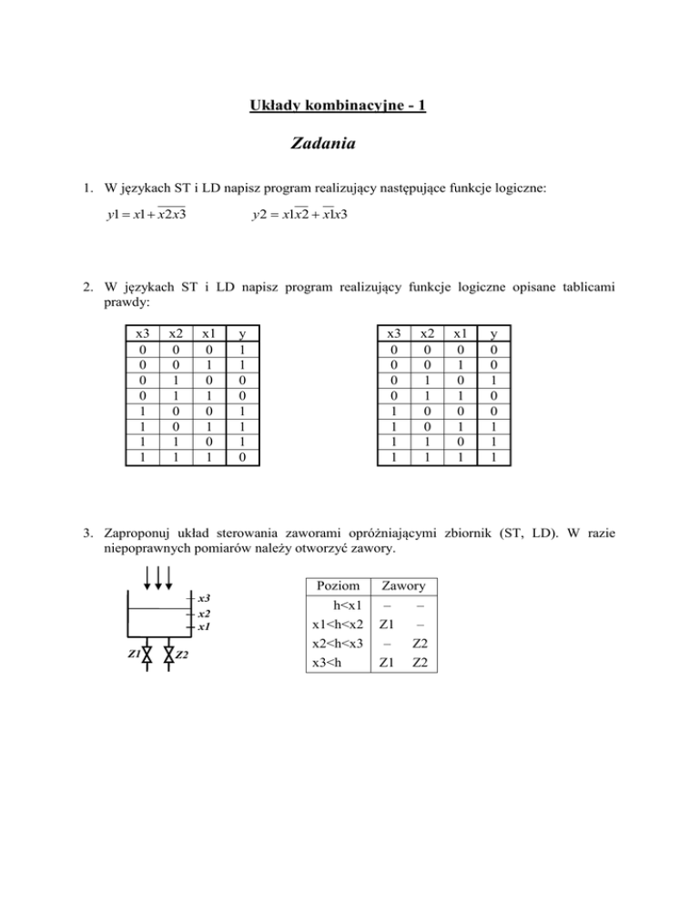 Układy kombinacyjne - 1 Zadania 1. W językach ST i LD napisz program realizujący następujące funkcje logiczne: y 2 x1x2 x1x3 y1 x1 x2 x3 2. W językach ST i LD napisz program realizujący funkcje logiczne opisane tablicami prawdy: x3 0 0 0 0 1 1 1 1 x2 0 0 1 1 0 0 1 1 x1 0 1 0 1 0 1 0 1 y 1 1 0 0 1 1 1 0 x3 0 0 0 0 1 1 1 1 x2 0 0 1 1 0 0 1 1 x1 0 1 0 1 0 1 0 1 y 0 0 1 0 0 1 1 1 3. Zaproponuj układ sterowania zaworami opróżniającymi zbiornik (ST, LD). W razie niepoprawnych pomiarów należy otworzyć zawory. Poziom x3 x2 x1 Z1 Z2 h<x1 x1<h<x2 x2<h<x3 x3<h Zawory – Z1 – Z1 – – Z2 Z2 4. Zaprojektuj układ sterujący grzejnikiem i wentylatorem (ST, LD). Urządzenia należy wyłączyć przy niepoprawnych pomiarach. Tablica wejść/wyjść c b a G W 0 0 0 1 0 0 0 1 1 1 0 1 1 0 0 1 1 1 0 1 c G b W a 5. Multiplekser MUX za pomocą wejścia selekcyjnego s przekazuje na wyjście q wartość wejścia x0 lub x1 (jeśli s=0, to q=x0). Utwórz tablicę zero–jedynkową multipleksera oraz podaj wzór opisujący jego funkcjonowanie (metoda Karnaugha). Zrealizuj multiplekser w językach ST i LD. MUX s q x0 x1 6. Koder 4–bitowy zamienia kod szeregowy „1 z 4” (jedynka może wystąpić tylko raz) na standardowy kod dwójkowy. Utwórz wzory opisujące funkcjonowanie kodera (metoda Karnaugha). Zrealizuj koder w języku ST. Uzupełnij go o trzecie wyjście P sygnalizujące poprawność/niepoprawność wejść. KODER a b c d x0 x1 d 0 0 0 1 c 0 0 1 0 b 0 1 0 0 a 1 0 0 0 x1 0 0 1 1 x0 0 1 0 1 7. Korzystając z operatorów negacji, iloczynu i sumy logicznej zapisz w języku ST funkcje implikacji (!p + q), równoważności (p ∙ q + !p ∙ !q) i różnicy symetrycznej (p ∙ !q + !p ∙ q). Jak wygląda realizacja w języku LD? 8. Zaprojektuj układ sterujący dwoma grzejnikami, które mogą być włączone niezależnie, lub szeregowo (ST, LD). Grzejniki należy wyłączyć przy niepoprawnych pomiarach. Temperatura c Grzejniki G1 t<a G1 G2 – G2 a<t<b G1 – – b<t<c – G2 – b a c<t G1, G2 szeregowo 9. Zaprojektuj układ sterowania grzejnikami i wentylatorem (ST, LD): c b t<a a<t<b b<t<c c<t G1 G2 włączone włączone włączone włączone G1+G2 G2 G2+W W W a 10. Zaprojektuj układ sterowania zaworami wlewowymi (ST, LD). W razie niepoprawnych pomiarów należy zamknąć zawory. Poziom Z2 Z1 Zawory h < x1 x1 < h < x2 x2 < h < x3 x3 < h x3 x2 x1 Z1 – Z1 – Z2 Z2 – – 11. Zaprojektuj układ sterowania grzejnikami (ST). W razie niepoprawnych pomiarów należy wyłączyć grzejniki. d c G1 b G2 a G3 Temperatura Grzejniki t<a G1 G2 – a<t<b G1 – G3 b<t<c – G2 – c<t<d – – G3 d<t – – – 12. Zaprojektuj układ sterowania grzejnikami i wentylatorem (ST). W razie niepoprawnych pomiarów należy wyłączyć urządzenia. d G1 c G2 b G3 a W t<a a<t<b b <t < c c<t<d d <t włączone włączone włączone włączone włączone G1+G2 G2+G3 G3+W G2+W W 13. Zaprojektuj układ sterowania pompami opóźniającymi zbiornik (ST, LD). W razie niepoprawnych pomiarów pompy mają być włączone (aby nie dopuścić do przelania zbiornika). P1 P2 Poziom P3 h < x1 x1 < h < x2 x2 < h < x3 x3 < h x3 x2 Pompy P1 – – P1 – P2 P2 P2 – – P3 P3 x1 14. Podaj wzór i zrealizuj układ (ST), który dla 4–bitowego słowa będzie generował bit parzystości (even). Poniższa tabelka podaje tylko cztery z 16–tu wariantów. 0 0 0 1 słowo 1 1 1 0 1 1 0 0 0 0 1 1 bit parzystości 0 1 1 0 15. Zrealizuj w języku ST multiplexer MUX2 przekazujący na wyjście a wartość tego z wejść x0 do x3, które wybrały wejścia selekcyjne s0, s1. MUX2 s0 s1 x0 x1 x2 x3 q 16. Urządzenie może być włączone albo sygnałem A, albo sygnałem B, ale nie przez obydwa sygnały jednocześnie (bo reprezentują odmienne sytuacje technologiczne). Przedstaw programy w językach ST i LD, które to realizują.