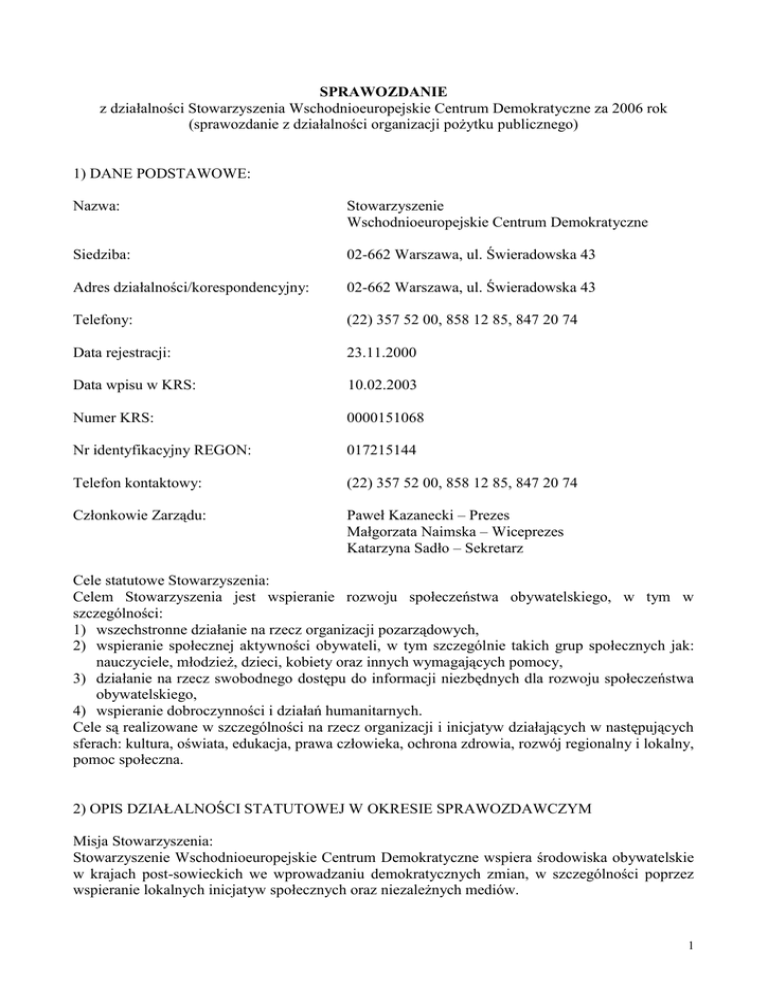 SPRAWOZDANIE z działalności Stowarzyszenia Wschodnioeuropejskie Centrum Demokratyczne za 2006 rok (sprawozdanie z działalności organizacji pożytku publicznego) 1) DANE PODSTAWOWE: Nazwa: Stowarzyszenie Wschodnioeuropejskie Centrum Demokratyczne Siedziba: 02-662 Warszawa, ul. Świeradowska 43 Adres działalności/korespondencyjny: 02-662 Warszawa, ul. Świeradowska 43 Telefony: (22) 357 52 00, 858 12 85, 847 20 74 Data rejestracji: 23.11.2000 Data wpisu w KRS: 10.02.2003 Numer KRS: 0000151068 Nr identyfikacyjny REGON: 017215144 Telefon kontaktowy: (22) 357 52 00, 858 12 85, 847 20 74 Członkowie Zarządu: Paweł Kazanecki – Prezes Małgorzata Naimska – Wiceprezes Katarzyna Sadło – Sekretarz Cele statutowe Stowarzyszenia: Celem Stowarzyszenia jest wspieranie rozwoju społeczeństwa obywatelskiego, w tym w szczególności: 1) wszechstronne działanie na rzecz organizacji pozarządowych, 2) wspieranie społecznej aktywności obywateli, w tym szczególnie takich grup społecznych jak: nauczyciele, młodzież, dzieci, kobiety oraz innych wymagających pomocy, 3) działanie na rzecz swobodnego dostępu do informacji niezbędnych dla rozwoju społeczeństwa obywatelskiego, 4) wspieranie dobroczynności i działań humanitarnych. Cele są realizowane w szczególności na rzecz organizacji i inicjatyw działających w następujących sferach: kultura, oświata, edukacja, prawa człowieka, ochrona zdrowia, rozwój regionalny i lokalny, pomoc społeczna. 2) OPIS DZIAŁALNOŚCI STATUTOWEJ W OKRESIE SPRAWOZDAWCZYM Misja Stowarzyszenia: Stowarzyszenie Wschodnioeuropejskie Centrum Demokratyczne wspiera środowiska obywatelskie w krajach post-sowieckich we wprowadzaniu demokratycznych zmian, w szczególności poprzez wspieranie lokalnych inicjatyw społecznych oraz niezależnych mediów. 1 Stowarzyszenie, niezależna organizacja pozarządowa, prowadzi działalność typu non-profit od 2001 roku, kontynuując tradycje oraz korzystając w swej pracy z kilkuletniego doświadczenia i dorobku programu białoruskiego Fundacji na rzecz Demokracji w Europie Wschodniej (IDEE). Swoją uwagę skupia na sytuacji społecznej krajów post-komunistycznych i do tych społeczeństw kieruje swoje programy, realizowane na poziomie lokalnym, adresowane w szczególności do starannie wyselekcjonowanych środowisk i grup. Dzięki szczegółowej wiedzy o mechanizmach działania i problemach tych grup Stowarzyszenie umiejętnie dostosowuje realizowane programy do ich potrzeb oraz możliwości. Zadania: Stowarzyszenie realizuje cele przez: 1) organizowanie i prowadzenie szkoleń, kursów, staży, seminariów i innych działań edukacyjnoszkoleniowych, 2) prowadzenie działalności wydawniczej i informacyjno-promocyjnej, 3) prowadzenie działalności badawczej, naukowej i archiwalnej, 4) wspieranie organizacji pozarządowych w procesie integracji europejskiej oraz ich współpracy międzynarodowej, 5) udzielanie wsparcia, w tym finansowego, inicjatywom i organizacjom pozarządowym, 6) promowanie i upowszechnianie nowoczesnych mediów i technologii, 7) współpracę z władzami samorządowymi, państwowymi, sektorem gospodarczym, środkami społecznej komunikacji zainteresowanymi w szczególności rozwojem społeczeństwa obywatelskiego Zarząd Stowarzyszenia, zgodnie z przyjętą strategią rozwoju, za najważniejsze w 2006 roku uznał następujące kierunki rozwoju prowadzonych programów: I. Program medialny - kontynuacja wsparcia niezależnej prasy lokalnej w Białorusi i w Ukrainie oraz Azji Centralnej, rozpoczęcie działań w Mołdowie; II. Program wsparcia rozwoju społeczeństwa obywatelskiego – aktywizacja grup społecznych, poszerzona o problematykę rozwoju lokalnego i regionalnego – kontynuowany w Białorusi i Ukrainie, w tym roku multiplikowany do Rosji; III. Wsparcie idei samorządności – poszerzenie programu rozwoju samorządu mieszkaniowego w Białorusi oraz cykliczny program promocji reformy administracji terytorialnej w regionach Ukrainy; IV. Działania na rzecz solidarności z Białorusią – cykl przedsięwzięć wspierających prodemokratyczne dążenia obywateli Białorusi w związku z wyborami prezydenckimi w tym kraju. I. Program medialny Wolność słowa, z której wynika idea niezależności prasy i etyka dziennikarska są wartościami najwyższymi, którymi kierujemy się przy doborze partnerów medialnych i kształtowaniu programów. Wartości te skłaniają wielu dziennikarzy i wydawców w krajach objętych naszą działalnością do tworzenia prasy podziemnej, która w trudnych warunkach politycznych jest często jedynym źródłem niezależnej od władz alternatywnej informacji. U podstaw realizacji programu medialnego leży przekonanie o postrzeganiu prasy lokalnej jako jednego z istotnych narzędzi budowania społeczeństwa obywatelskiego na poziomie lokalnym. Gazeta to zarówno płaszczyzna integracji lokalnych inicjatyw, jak również instrument wpływu na władze lokalne. Stąd w projektach prasowych Stowarzyszenie zwraca uwagę na treść gazety tj. 2 zawartość dotyczącą polityki, ekonomii i spraw społecznych danego regionu. Duży nacisk Stowarzyszenie kładzie również na lokalność gazety tj. na to aby informacja w niej zawarta dotyczyła miejscowego czytelnika, tematów dla niego aktualnych i bliskich, a nie wydarzeń poziomu ogólnokrajowego. Niezależność gazety opiera się przede wszystkim na jej ekonomicznej samowystarczalności. Dlatego ważny dla Stowarzyszenia jest fakt dążenia wydawców do realizacji interesów ekonomicznych gazety, bez uzależniania się od władzy, partii politycznej czy sfery biznesu. Gazeta niezależna musi opierać swoje funkcjonowanie o dochody własne, pochodzące ze sprzedaży gazety i reklamy. Wszelkie inne dochody uzależniają ją albo od tendencji politycznych albo od interesów finansowych. W oparciu o powyższe założenia, w 2006 roku Stowarzyszenie kontynuowało działania na rzecz wsparcia i rozwoju prasy niezależnej 