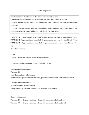 -Ulotka dla pacjenta- Należy zapoznać się z treścią ulotki przed zastosowaniem leku. - Należy zachować tę ulotkę, aby w razie potrzeby móc ją ponownie przeczytać. - Należy zwrócić się do lekarza lub farmaceuty, gdy potrzebna jest rada lub dodatkowa informacja. - Lek ten został przepisany ściśle określonej osobie i nie należy go przekazywać innym, gdyż może im zaszkodzić, nawet jeśli objawy ich choroby są takie same. TRANXENE 20, proszek i rozpuszczalnik do sporządzania roztworu do wstrzykiwań, 20 mg TRANXENE 50, proszek i rozpuszczalnik do sporządzania roztworu do wstrzykiwań, 50 mg TRANXENE 100, proszek i rozpuszczalnik do sporządzania roztworu do wstrzykiwań, 100 mg (Dikalii clorazepas) Skład: 1 fiolka z proszkiem zawiera jako substancję czynną: klorazepatu sól dwupotasowa 20 mg, 50 mg lub 100 mg oraz substancje pomocnicze: Tranxene 20: proszek: mannitol, węglan potasu; rozpuszczalnik: potasu diwodorofosforan, potasu wodorofosforan, woda do wstrzykiwań Tranxene 50 i Tranxene 100 proszek: mannitol, węglan potasu; rozpuszczalnik: potasu diwodorofosforan, woda do wstrzykiwań Opakowanie zawiera: Tranxene 20: 5 fiolek z proszkiem + 5 ampułek z rozpuszczalnikiem 2 ml Tranxene 50: 5 fiolek z proszkiem + 5 ampułek z rozpuszczalnikiem 2,5 ml Tranxene 100: 5 fiolek z proszkiem + 5 ampułek z rozpuszczalnikiem 5 ml Podmiot odpowiedzialny: Sanofi-Aventis France 1-13 boulevard Romain Rolland 75 014 Paryż Francja Wytwórca: Tranxene 20: Sanofi Winthrop Industrie 180 rue Jean Jaures 94702 Maisons-Alfort Francja Sanofi-Aventis S.p.A. Località Valcanello 03012 Anagni (FR) Włochy Tranxene 50: Sanofi Winthrop Industrie 180 rue Jean Jaures 94702 Maisons-Alfort Francja Tranxene 100: Glaxo Wellcome Production 1, rue de l’Abbaye 76960 Notre Dame de Bondeville Francja Spis treści ulotki: 2 1. Co to jest lek Tranxene 20, Tranxene 50, Tranxene 100 i w jakim celu się go stosuje 2. Zanim zastosuje się lek Tranxene 20, Tranxene 50, Tranxene 100 3. Jak stosować lek Tranxene 20, Tranxene 50, Tranxene 100 4. Możliwe działania niepożądane 5. Przechowywanie leku Tranxene 20, Tranxene 50, Tranxene 100 6. Inne konieczne informacje dotyczące leku Tranxene 20, Tranxene 50, Tranxene 100 1. Co to jest lek Tranxene 20, Tranxene 50, Tranxene 100 i w jakim celu się go stosuje Lek Tranxene 20, Tranxene 50, Tranxene 100 występuje w postaci proszku wraz z dołączonym rozpuszczalnikiem do sporządzania roztworu do wstrzykiwań domięśniowych i dożylnych. Tranxene 20, Tranxene 50, Tranxene 100 jest lekiem anksjolitycznym z grupy benzodiazepin. Charakteryzuje się właściwościami farmakologicznymi grupy benzodiazepin: działaniem rozluźniającym mięśnie, łagodzącym lęk, uspokajającym, nasennym, przeciwdrgawkowym, wywołującym niepamięć. Lek Tranxene 20, Tranxene 50, Tranxene 100 jest wskazany w: - leczeniu napadów lęku i niepokoju, - leczeniu napadów pobudzenia ruchowego i agresji, - zapobieganiu i/lub leczeniu delirium tremens i innych objawów zespołu abstynencji w uzależnieniu alkoholowym Lek ten jest także stosowany jako lek wspomagający w tężcu. 2. Zanim zastosuje się lek Tranxene 20, Tranxene 50, Tranxene 100 Nie należy stosować leku w przypadku: - ciężkiej niewydolności oddechowej, - zespołu bezdechu sennego, - ciężkiego, ostrego lub przewleklego upośledzenia czynności wątroby (ryzyko wystąpienia encefalopatii), - mastenii, - znanej nadwrażliwości na benzodiazepiny lub na którąkolwiek z substancji pomocniczych. 3 Zachować szczególną ostrożność stosując lek Tranxene 20, Tranxene 50, Tranxene 100 Skuteczność benzodiazepin może zmieniać się podczas długotrwałego podawania leku, ze względu na możliwość wystąpienia zjawiska tolerancji. Podobnie jak w przypadku innych benzodiazepin, szczególnie przy długotrwałym stosowaniu, może dojść do rozwoju uzależnienia fizycznego i psychicznego od tego leku. Niektóre czynniki, takie jak: czas trwania leczenia, zastosowana dawka, uzależnienie od innych leków lub od alkoholu w wywiadzie, mogą sprzyjać, wystąpieniu uzależnienia. Stan uzależnienia może pojawić się jako zaburzenie po odstawieniu leku. Często występują następujące objawy: bezsenność, ból głowy, nasilony lęk, ból mięśni, napięcie mięśni, drażliwość. Inne objawy występują rzadziej: pobudzenie, lub nawet epizody splątania, nasilona wrażliwość na różne bodźce (hałas, światło), depersonalizacja, utrata poczucia rzeczywistości, urojenia, drgawki. Zaburzenia po odstawieniu leku mogą pojawić się po kilku dniach od przerwania jego stosowania. Stosowanie kilku benzodiazepin, niezależnie od wskazań do stosowania (łagodzenie lęku czy działanie nasenne), może zwiększać ryzyko rozwoju uzależnienia od leku. Mogą wystąpić przejściowe zaburzenia w postaci nasilenia zaburzeń lękowych, które były wskazaniem do leczenia benzodiazepinami (tzw. zjawisko „z odbicia”). W ciągu kilku godzin po podaniu dawki leku może wystąpić niepamięć następcza. Opisywano także wystąpienie zachowań automatycznych. U niektórych osób benzodiazepiny i podobne leki mogą wywoływać reakcje paradoksalne, takie jak: - nasilenie bezsenności, koszmary senne, - pobudzenie, nerwowość, drażliwość, ataki gniewu, uwidocznienie się zachowań agresywnych, - urojenia, stan przypominający sen, objawy psychozy, nieprawidłowe zachowanie i inne zaburzenia zachowania. 4 Benzodiazepin i podobnych substancji nie należy stosować w monoterapii w leczeniu depresji lub lęku związanego z depresją, ponieważ mogą one zwiększać ryzyko samobójstwa. Lek należy stosować bardzo ostrożnie u pacjentów z alkoholizmem lub innego rodzaju uzależnieniami. U osób w podeszłym wieku, z niewydolnością nerek lub niewydolnością wątroby zaleca się zmniejszyć dawkę, na przykład o połowę. U pacjentów z niewydolnością oddechową należy brać pod uwagę działanie hamujące benzodia