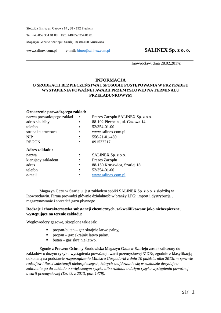 Siedziba firmy: ul. Gazowa 14 , 88 - 192 Piechcin Tel. +48 052 354 01 00 Fax. +48 052 354 01 01 Magazyn Gazu w Szarleju : Szarlej 18, 88-150 Kruszwica www.salinex.com.pl SALINEX Sp. z o. o. e-mail: [email protected] ___________________________________________________________________________ Inowrocław, dnia 28.02.2017r. INFORMACJA O ŚRODKACH BEZPIECZEŃSTWA I SPOSOBIE POSTĘPOWANIA W PRZYPADKU WYSTĄPIENIA POWAŻNEJ AWARII PRZEMYSŁOWEJ NA TERMINALU PRZEŁADUNKOWYM Oznaczenie prowadzącego zakład: nazwa prowadzącego zakład : adres siedziby : telefon : strona internetowa : NIP : REGON : Prezes Zarządu SALINEX Sp. z o.o. 88-192 Piechcin , ul. Gazowa 14 52/354-01-00 www.salinex.com.pl 556-21-01-430 091532217 Adres zakładu: nazwa kierujący zakładem adres telefon e-mail SALINEX Sp. z o.o. Prezes Zarządu 88-150 Kruszwica, Szarlej 18 52/354-01-00 www.salinex.com.pl : : : : : Magazyn Gazu w Szarleju jest zakładem spółki SALINEX Sp. z o.o. z siedzibą w Inowrocławiu. Firma prowadzi głównie działalność w branży LPG: import i dystrybucja , magazynowanie i sprzedaż gazu płynnego. Rodzaje i charakterystyka substancji chemicznych, zakwalifikowane jako niebezpieczne, występujące na terenie zakładu: Węglowodory gazowe, skroplone takie jak: propan-butan – gaz skrajnie łatwo palny, propan – gaz skrajnie łatwo palny, butan – gaz skrajnie łatwo. Zgonie z Prawem Ochrony Środowiska Magazyn Gazu w Szarleju został zaliczony do zakładów o dużym ryzyku wystąpienia poważnej awarii przemysłowej /ZDR/, zgodnie z klasyfikacją dokonaną na podstawie rozporządzenia Ministra Gospodarki z dnia 10 października 2013r. w sprawie rodzajów i ilości substancji niebezpiecznych, których znajdowanie się w zakładzie decyduje o zaliczeniu go do zakładu o zwiększonym ryzyku albo zakładu o dużym ryzyku wystąpienia poważnej awarii przemysłowej (Dz. U. z 2013, poz. 1479). str. 1 W związku z powyższym SALINEX Sp. z o.o. dokonał zgłoszenia zakładu o dużym ryzyku zagrożenia poważną awarią przemysłową, opracował: Program zapobiegania poważnym awariom przemysłowym, Wewnętrzny plan operacyjno-ratowniczy Raport o bezpieczeństwie. Zgodnie z wymaganiami Prawa Ochrony Środowiska (art. 254 ust. 1) w zakresie poważnych awarii, opracowany przez spółkę SALINEX raport o bezpieczeństwie został zatwierdzony w drodze decyzji przez Kujawsko-Pomorskiego Komendanta Wojewódzkiego Państwowej Straży Pożarnej w Toruniu po pozytywnym zaopiniowaniu kujawsko-Pomorskiego Wojewódzkiego Inspektora Ochrony Środowiska. Rodzaje zagrożeń możliwych do wystąpienia na terenie zakładu: pożar, wybuch, uwolnienie znacznej ilości gazu bez jego zapalenia. Zagrożenie mogące powstać z wykorzystaniem gazu płynnego (propan-butan, propan, butan) wynikają przede wszystkim z jego właściwości palnych i wybuchowych. Skutki pożaru i/lub wybuchu dla zdrowia i życia ludzi będą uzależnione od wielkości zaistniałej awarii. Bezpośredni kontakt z chmurą parową gazu nie jest niebezpieczny, jedynie przy dużych stężeniach ma działanie duszące. Pary gazu nie są toksyczne, żrące, czy utleniające. Zastosowane środki bezpieczeństwa W celu nie dopuszczenia do powstania na terenie zakładu poważnej awarii przemysłowej oraz ograniczenia jej ewentualnych skutków zastosowano: system detekcji gazu monitorujący wycieki, aparaturę kontrolno-pomiarową wspomagającą i kontrolującą procesy technologiczne, stałe urządzenia gaśnicze (zraszacze, działka wodne), podręczny sprzęt gaśniczy, wodociągową sieć przeciwpożarową z naziemnymi hydrantami, układ przeciwpożarowych wyłączników prądu, układ awaryjnego wyłączania zakładu- w przypadku uszkodzenia instalacji technologicznej, system wyłącza pompy i sprężarki par gazu, zamyka zawory technologiczne odcinające poszczególne węzły, uruchamia akustyczną i wizualną sygnalizację alarmową, układ włączników uruchamiających instalację zraszającą, zawory bezpieczeństwa na zbiornikach i instalacji technologicznej, instalację uziemiającą i odgromową, urządzenia technologiczne (sprężarki par gazu, pompy dystrybucyjne) przeznaczone do pracy z gazem, w strefach zagrożonych wybuchem instalację elektryczną i oświetleniową w wykonaniu przeciwwybuchowym, monitoring terenu zakładu. Obok technicznych systemów zabezpieczeń w zakładzie obowiązują i funkcjonują rozwiązania organizacyjne, procedury i instrukcje. Wprowadzone rozwiązania organizacyjne to: służba ratownicza, którą stanowi kierownik zmiany oraz operatorzy-mechanicy urządzeń gazowych, str. 2 określenie na wszystkich poziomach-stanowiskach pracowniczych, zakresu obowiązków i sposobu postępowania, projektowane instalacje technologiczne i ich wykonanie odbywa się wg obowiązujących przepisów z wykorzystaniem dostępnej wiedzy technicznej, na bazie urządzeń posiadających stosowne dopuszczenia, aprobaty i certyfikaty, przestrzeganie przez pracowników obsługi warunków i zasad bezpieczeństwa wynikających z przepisów, wiedzy i instrukcji pracy dla poszczególnych urządzeń, wykonanie wszystkich czynności i operacji technologicznych zgodnie z instrukcjami stanowiskowymi - zarówno w normalnych warunkach pracy, jak i w sytuacjach awaryjnych, posiadanie stosownych zaświadczeń i uprawnień kwalifikacyjnych przez pracowników obsługi, prowadzenie przeglądów, konserwacji i prób działania technicznych systemów zabezpieczeń, prowadzenie obowiązkowych, okresowych szkoleń bhp i przeciwpożarowych, stały nadzór UDT i TDT nad instalacjami i urządzeniami podlegającymi dozorowi technicznemu, zakaz palenia na terenie zakładu (poza miejscami do tego wyznaczonymi), indywidualne, w zależności od potrzeby planowanie remontów, określenie sposobów postępowania w przypadku wystąpienia pożaru, wybuchu lub wycieku i konieczności ewakuacji w „Instrukcji bezpieczeństwa pożarowego”, oraz w „Wewnętrznym planie opera