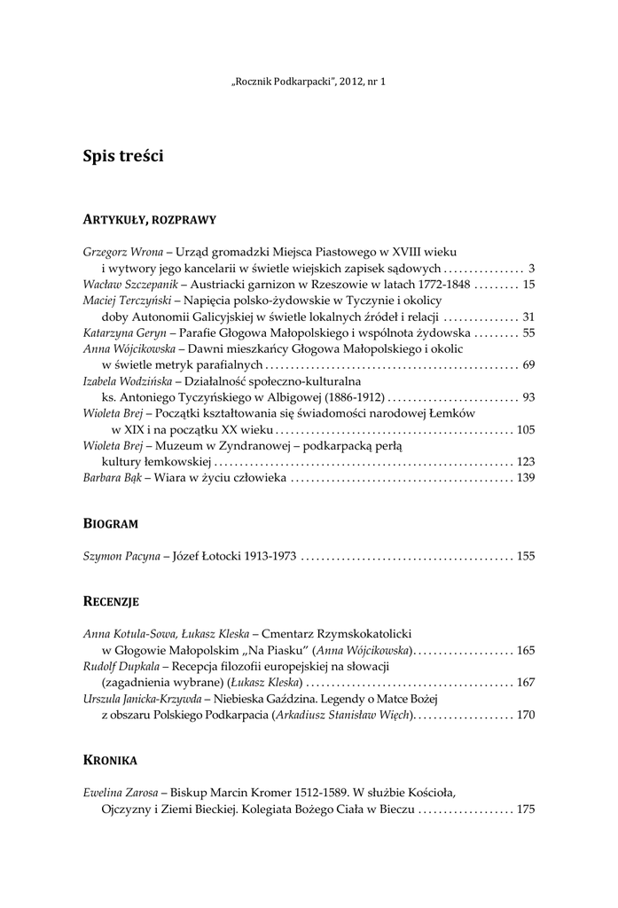 „Rocznik Podkarpacki”, 2012, nr 1 Spis treści ARTYKUŁY, ROZPRAWY Grzegorz Wrona – Urząd gromadzki Miejsca Piastowego w XVIII wieku i wytwory jego kancelarii w świetle wiejskich zapisek sądowych . . . . . . . . . . . . . . . . 3 Wacław Szczepanik – Austriacki garnizon w Rzeszowie w latach 1772-1848 . . . . . . . . . 15 Maciej Terczyński – Napięcia polsko-żydowskie w Tyczynie i okolicy doby Autonomii Galicyjskiej w świetle lokalnych źródeł i relacji . . . . . . . . . . . . . . . 31 Katarzyna Geryn – Parafie Głogowa Małopolskiego i wspólnota żydowska . . . . . . . . . 55 Anna Wójcikowska – Dawni mieszkańcy Głogowa Małopolskiego i okolic w świetle metryk parafialnych . . . . . . . . . . . . . . . . . . . . . . . . . . . . . . . . . . . . . . . . . . . . . . . . . . 69 Izabela Wodzińska – Działalność społeczno-kulturalna ks. Antoniego Tyczyńskiego w Albigowej (1886-1912) . . . . . . . . . . . . . . . . . . . . . . . . . . 93 Wioleta Brej – Początki kształtowania się świadomości narodowej Łemków w XIX i na początku XX wieku . . . . . . . . . . . . . . . . . . . . . . . . . . . . . . . . . . . . . . . . . . . . . . . 105 Wioleta Brej – Muzeum w Zyndranowej – podkarpacką perłą kultury łemkowskiej . . . . . . . . . . . . . . . . . . . . . . . . . . . . . . . . . . . . . . . . . . . . . . . . . . . . . . . . . . . 123 Barbara Bąk – Wiara w życiu człowieka . . . . . . . . . . . . . . . . . . . . . . . . . . . . . . . . . . . . . . . . . . . . 139 BIOGRAM Szymon Pacyna – Józef Łotocki 1913-1973 . . . . . . . . . . . . . . . . . . . . . . . . . . . . . . . . . . . . . . . . . . 155 RECENZJE Anna Kotula-Sowa, Łukasz Kleska – Cmentarz Rzymskokatolicki w Głogowie Małopolskim „Na Piasku” (Anna Wójcikowska) . . . . . . . . . . . . . . . . . . . . 165 Rudolf Dupkala – Recepcja filozofii europejskiej na słowacji (zagadnienia wybrane) (Łukasz Kleska) . . . . . . . . . . . . . . . . . . . . . . . . . . . . . . . . . . . . . . . . . 167 Urszula Janicka-Krzywda – Niebieska Gaździna. Legendy o Matce Bożej z obszaru Polskiego Podkarpacia (Arkadiusz Stanisław Więch). . . . . . . . . . . . . . . . . . . . 170 KRONIKA Ewelina Zarosa – Biskup Marcin Kromer 1512-1589. W służbie Kościoła, Ojczyzny i Ziemi Bieckiej. Kolegiata Bożego Ciała w Bieczu . . . . . . . . . . . . . . . . . . . 175 „Rocznik Podkarpacki”, 2012, nr 1 Contents ARTICLES, PAPERS Grzegorz Wrona – The District Office of Miejsce Piastowe in the 18th century and the products of its chancellery on the basis of judicial records . . . . . . . . . . . . . . . 3 Wacław Szczepanik – The Austrian garrison in Rzeszów in the years 1772-1848 . . . . . . 15 Maciej Terczyński – Polish – Jewish tensions in Tyczyn and its vicinity during the Galician Autonomy based on local sources and relations. . . . . . . . . . . . . . . . . . . . 31 Katarzyna Geryn – Parishes of Głogów Małopolski and the Jewish community. . . . . . 55 Anna Wójcikowska – Old-time inhabitants of Głogów Małopolski and its surroundings on the basis of the parish certificates . . . . . . . . . . . . . . . . . . . . . . 69 Izabela Wodzińska – Social and cultural activities of priest Antoni Tyczyński in Albigowa (1886-1912) . . . . . . . . . . . . . . . . . . . . . . . . . . . . . . . . . . . . . . . . . . . . . . . . . . . . . . . . 93 Wioleta Brej – The beginnings of shaping national consciousness of Lemkos in the 19th and at the beginning of the 20th century . . . . . . . . . . . . . . . . . . . . . . . . . . . . . 105 Wioleta Brej – Museum in Zyndranowa as a Subcarpathian pearl of the Lemko culture . . . . . . . . . . . . . . . . . . . . . . . . . . . . . . . . . . . . . . . . . . . . . . . . . . . . . . . . . . . 123 Barbara Bąk – Faith in human life . . . . . . . . . . . . . . . . . . . . . . . . . . . . . . . . . . . . . . . . . . . . . . . . . . . 139 BIOGRAM Szymon Pacyna – Józef Łotocki 1913-1973 . . . . . . . . . . . . . . . . . . . . . . . . . . . . . . . . . . . . . . . . . . . . 155 REVIEWS Anna Kotula-Sowa, Łukasz Kleska – The Roman Catholic Cemetery in Głogów Małopolski „Na Piasku” (Anna Wójcikowska) . . . . . . . . . . . . . . . . . . . . . . . . . . . . . . . . . . . 165 Rudolf Dupkala – Reception of the European philosophy in Slovakia (selected issues) (Łukasz Kleska) . . . . . . . . . . . . . . . . . . . . . . . . . . . . . . . . . . . . . . . . . . . . . . . . 167 Urszula Janicka-Krzywda – Blue Hostess. Legends of the Saint Mary from the Polish Subcarpathian Voivodeship (Arkadiusz Stanisław Więch). . . . . . . . . . . . . 170 CHRONICLE Ewelina Zarosa – Bishop Marcin Kromer 1512-1589. On duty for Church, Fatherland and Biecz. The Collegiate Church of Corpus Christi in Biecz . . . . . . . 175