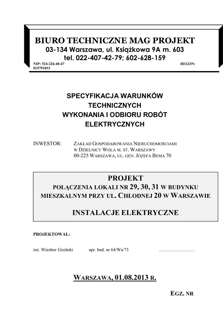 BIURO TECHNICZNE MAG PROJEKT 03-134 Warszawa, ul. Książkowa 9A m. 603 tel. 022-407-42-79; 602-628-159 NIP: 524-226-40-47 015791033 REGON: SPECYFIKACJA WARUNKÓW TECHNICZNYCH WYKONANIA I ODBIORU ROBÓT ELEKTRYCZNYCH ZAKŁAD GOSPODAROWANIA NIERUCHOMOŚCIAMI W DZIELNICY WOLA M. ST. WARSZAWY 00-225 WARSZAWA, UL. GEN. JÓZEFA BEMA 70 INWESTOR: PROJEKT POŁĄCZENIA LOKALI NR 29, 30, 31 W BUDYNKU MIESZKALNYM PRZY UL. CHŁODNEJ 20 W WARSZAWIE INSTALACJE ELEKTRYCZNE PROJEKTOWAŁ: inż. Wiesław Giziński upr. bud. nr 64/Wa/73 …………………… WARSZAWA, 01.08.2013 R. EGZ. NR SPIS TREŚCI 1. WSTĘP 1.1 Zakres opracowania 1.2 Wykaz norm i przepisów 2. WYMAGANIA TECHNICZNE I WYROBY DO STOSOWANIA 2.1 Wyroby do stosowania 2.2 Wymagania techniczne 3. WYKONANIE INSTALACJI ELEKTRYCZNYCH W BUDYNKU 3.1 Wymagania ogólne 3.2 Tablice rozdzielcze 3.3 Instalacje odbiorcze 3.4 Instalacje ochrony przeciwporażeniowej 4. ODBIÓR INSTALACJI ELEKTRYCZNEJ W BUDYNKU 4.1 Ogólne warunki dotyczące odbioru robót budowlanych 4.2 Warunki odbioru wykonanej instalacji elektrycznej 4.3 Obowiązki wykonawcy robót elektrycznych w zakresie przygotowania instalacji elektrycznych do odbioru 4.5 Odbiór końcowy 5. WARUNKI PRZEKAZANIA NSTALACJI ELEKTRYCZNEJ DO EKSPLOATACJI 1. WSTĘP 1.1 Zakres opracowania Niniejsze opracowanie obejmuje warunki techniczne wykonania i odbioru wymiany instalacji elektrycznej w budynku mieszkalnym przy ul. Chłodnej 20 w Warszawie. Podane w niniejszym opracowaniu informacje odnoszą się do wykonania i odbioru instalacji elektrycznych wnętrzowych do 1kV. Opracowanie obejmuje wytyczne w zakresie wymagań związanych z dokumentacją techniczną - podstawowych wyrobów stosowanych przy wykonaniu instalacji elektrycznych - wykonania instalacji elektrycznych, technologii układania instalacji - odbioru instalacji - zakresu badań i sprawdzeń odbiorczych W opracowaniu przedstawiono wykaz przepisów koniecznych do stosowania przy projektowaniu i wykonywaniu instalacji elektrycznych. 2 1.2 Wykaz norm i przepisów PN-IEC 364-4-481 : 1994 Instalacje elektryczne w obiektach budowlanych. Ochrona zapewniająca bezpieczeństwo. Dobór środków ochrony w zależności od wpływów zewnętrznych. Wybór środków ochrony przeciwporażeniowej w zależności od wpływów zewnętrznych. PN-IEC 60364-4-42 : 1999 Instalacje elektryczne w obiektach budowlanych. Ochrona dla zapewnienia bezpieczeństwa. Ochrona przed skutkami oddziaływania cieplnego. Instalacje elektryczne w obiektach budowlanych. Ochrona dla zapewnienia bezpieczeństwa. Ochrona przed prądem przetężeniowym. Instalacje elektryczne w obiektach budowlanych. Ochrona dla zapewnienia bezpieczeństwa. Zastosowanie środków ochrony zapewniających bezpieczeństwo. Postanowienia ogólne. Środki ochrony przed porażeniem prądem elektrycznym. Instalacje elektryczne w obiektach budowlanych. Ochrona dla zapewnienia bezpieczeństwa. Stosowanie środków ochrony zapewniających bezpieczeństwo. Środki ochrony przed prądem przetężeniowym. Instalacje elektryczne w obiektach budowlanych. Dobór i montaż wyposażenia elektrycznego. Aparatura łączeniowa i sterownicza. Instalacje elektryczne w obiektach budowlanych. Dobór i montaż wyposażenia elektrycznego. Uziemienia i przewody ochronne. Instalacje elektryczne w obiektach budowlanych. Dobór i montaż wyposażenia elektrycznego. Instalacje bezpieczeństwa. Instalacje elektryczne w obiektach budowlanych. Dobór i montaż wyposażenia elektrycznego. Aparatura rozdzielcza i sterownicza. Urządzenia do odłączania izolacyjnego i łączenia. Wytyczne do instalacji elektrycznych. Dobór i montaż wyposażenia elektrycznego. Oprzewodowanie. Instalacje elektryczne w obiektach budowlanych. Zakres, przedmiot i wymagania podstawowe). Instalacje elektryczne w obiektach budowlanych. Ustalenie ogólnych charakterystyk). Instalacje elektryczne w obiektach budowlanych. Ochrona zapewniająca bezpieczeństwo. Ochrona przeciwporażeniowa). PN-IEC 60364-4-43 : 1999 PN-IEC 60364-4-47 : 1999 PN-IEC 60364-4-473 : 1999 PN-IEC 60364-5-53 : 1999 PN-IEC 60364-5-54 : 1999 PN-IEC 60364-5-56 : 1999 PN-IEC 60364-5-537 : 1999 PN-E-05033 : 1994 PN-IEC 60364-1 : 2000 PN-IEC 60364-3 : 2000 PN-IEC 60364-4-41 : 2000 PN-IEC 60364-5-51 : 2000 PN-IEC 60364-5-523 : 2001 PN-IEC 60364-6-61 : 2000 Instalacje elektryczne w obiektach budowlanych. Dobór i montaż wyposażenia elektrycznego. Postanowienia wspólne). Instalacje elektryczne w obiektach budowlanych. Dobór i montaż wyposażenia elektrycznego. Obciążalność prądowa długotrwała Instalacje elektryczne w obiektach budowlanych. Sprawdzenie. 3 2. WYMAGANIA TECHNICZNE I WYROBY DO STOSOWANIA Wyroby do stosowania Do wykonania instalacji elektrycznych w budynku należy stosować kable, przewody osprzęt oraz aparaturę i urządzenia elektryczne posiadające dopuszczenia do stosowania w budownictwie oraz oznakowane znakiem CE lub B zgodnie z obowiązującymi przepisami. Wymagania techniczne Stosownie od ostatecznie zbilansowanego zapotrzebowania na moc elektryczną dla poszczególnych rozdzielnic należy dobrać linie zasilające o odpowiednim typie i przekroju żył linii kablowych. Zaleca się wykonanie zasilaczy z żyłami z miedzi, wykonanych z kabli wielożyłowych typu YKY, YDY lub z przewodów jednożyłowych typu DY lub LgY o przekroju dostosowanym do obciążenia i dopuszczalnego spadku napięcia na linii zasilającej oraz o liczbie żył 5. Napięcie znamionowe kabli 0,6/1 kV. Instalacje oświetlenia należy wykonać przewodami o żyłach z miedzi. Minimalny przekrój żyły 1,5 mm2. Instalacje układane podtynkowo, wykonać przewodami typu YDY (YDYp). Oprawy powinny być wyposażone w możliwość podłączenia przewodów 3-żyłowych (L,N,PE). Materiały Rozdzielnice elektryczne - aparatura i obudowa firmy Legrand, Hulanicki & Bednarek. Oprawy oświetleniowe żarowe typu PLAFONIERA wykonane tworzywa sztucznego IP44. Osprzęt instalacyjny w standardzie firmy ELDA seria F