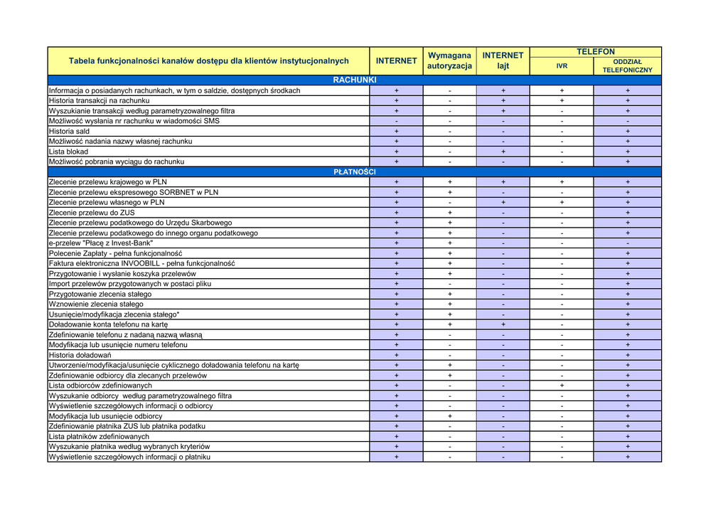 Tabela funkcjonalności kanałów dostępu dla klientów