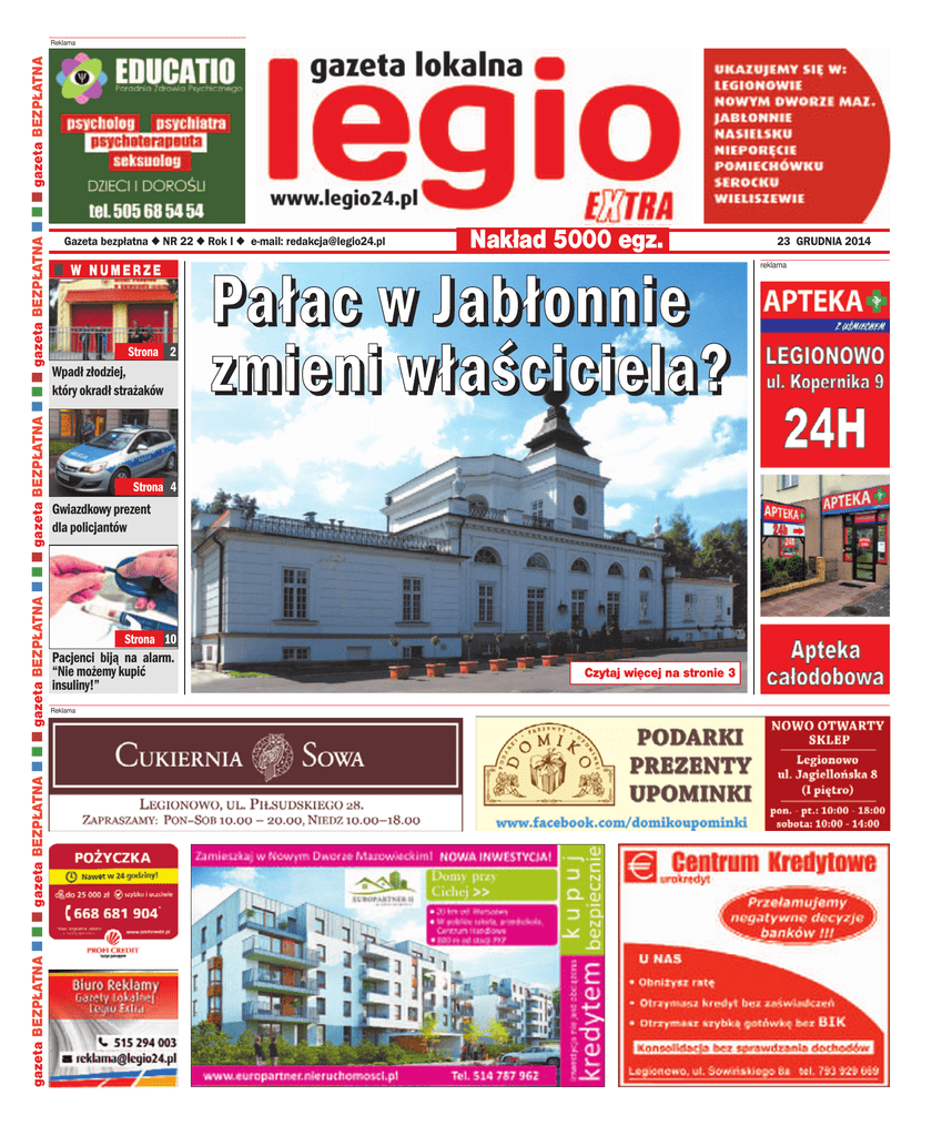 gazeta BEZPŁATNA n n n gazeta BEZPŁATNA n n n gazeta BEZPŁATNA n n n gazeta BEZPŁATNA n n n gazeta BEZPŁATNA n n n gazeta BEZPŁATNA Reklama Gazeta bezpłatna u NR 22 u Rok I u e-mail: [email protected] n W NUMERZE Strona 2 Wpadł złodziej, który okradł strażaków Nakład 5000 egz. reklama Pałac w Jabłonnie zmieni właściciela? Strona 4 Gwiazdkowy prezent dla policjantów Strona 10 Pacjenci biją na alarm. “Nie możemy kupić insuliny!” Reklama 23 GRUDNIA 2014 Czytaj więcej na stronie 3 2 Ciało 63-letniego mężczyzny wiszące na drzewie znaleziono w czwartek (18.12) na terenie os. Piaski w Legionowie. Najprawdopodobniej 63-latek targnął się na własne życie. Dokładną przyczynę śmierci ma wyjaśnić sekcja zwłok, którą zarządził prokurator. Fot. KPP Legionowo Schwytano sprawcę wrześniowej kradzieży w OSP Zatrzymany 32-letni Michał B. to mieszkaniec powiatu otwockiego. Mężczyzna podejrzany jest o kradzież z włamaniem do remizy Ochotniczej Straży Pożarnej w Kałuszynie. Do zdarzenia doszło w połowie września, a łupem padł specjalistyczny sprzęt potrzebny strażakom do ratowania ludzkiego życia, m.in. piły do cięcia drewna, stali, betonu, agregat prądotwórczy, nawigacja, paliwo do wozów strażackich. Wartość strat oszacowano na przeszło 23 tysiące złotych. Od chwili tej zuchwałej kradzieży legionowska policja prowadziła intensywne i szeroko zakrojone śledztwo. Rezultatem pracy mundurowych było ustalenie osoby podejrzanej o popełnienie tego przestępstwa. Kiedy poli- cjanci wpadli na trop Michała G. okazało się, że przebywa on w areszcie śledczym jako tymczasowo aresztowany za dokonany w listopadzie br. na terenie powiatu otwockiego rozbój z użyciem niebezpiecznego narzędzia. Policjanci przeszukując miejsce zamieszkania mężczyzny, znaleźli część skradzionego sprzętu. -Strażacy rozpoznali te przedmioty jako swoją własność. – mówi asp. Emilia Kuligowska z KPP Legionowo. Ostatecznie śledczy przedstawili 32-latkowi zarzut kradzieży z włamaniem, do którego mężczyzna przyznał się i dobrowolnie poddał karze. Michał B. był już w przeszłości karany m.in. za kradzież z włamaniem dokonaną w okresie recydywy, za które to przestępstwo odbywał karę pozbawienia wolności w zakładzie karnym od 2006 do 2010 roku. Obecnie trwają czynności zmierzające do odzyskania skradzionego mienia. /RED/ Legionowo Samobójstwo na os. Piaski Około godz. 7:40 dyżurny Komendy Powiatowej Policji w Legionowie został poinformowany o makabrycznym znalezisku. Na jednym z drzew na os. Piaski, w pobliżu stacji PKP wisiały zwłoki starszego mężczyzny. Na miejsce Legionowo Za znęcanie się nad żoną może odsiedzieć 5 lat Pięć lat pozbawienia wolności grozi 38-letniemu mężczyźnie, który znęcał się nad swoją małżonką. Mieszkaniec powiatu legionowskiego nie tylko wszczynał awantury, ale także znęcał się nad żoną fizycznie. Do zatrzymania mężczyzny doszło podczas policyjnej interwencji. Kiedy kobieta opowiedziała funkcjonariuszom o swoim horrorze, ci nie mieli żadnych wątpliwości, że 38-latek zagraża swojej żonie. W toku przeprowadzonego dochodzenia ustalono, że mąż nie tylko wszczyna kłótnie, ale także znęca się nad małżonką fizycznie i psychicznie. Postawiono mu zarzut znęcania się natychmiast zadysponowano służby ratunkowe. Lekarz pogotowia ratunkowego stwierdził zgon, jak się później okazało 63-letniego mieszkańca Legionowa. Wstępne ustalenia prokuratora wskazują, że najprawdopodobniej do śmierci mężczyzny nie przyczyniły się osoby postronne. Wszystko wskazuje więc na to, że było to samobójstwo. Fot. Legio24 Kałuszyn Kryminalni z Legionowa zatrzymali mężczyznę, który w połowie września włamał się i okradł Ochotniczą Straż Pożarną w Kałuszynie (gm. Wieliszew). Grozi mu teraz do 10 lat więzienia. WTOREK, 23 grudnia 2014 Na sygnale nad kobietą i poproszono prokuratora o zastosowanie wobec mężczyzny środka zapobiegawczego. Prokuratura Rejonowa w Legionowie przychyliła się do prośby mundurowych i zadecydowała o zastosowaniu wobec 38-latka policyjnego dozoru. Musi on raz w tygodniu meldować się na komendzie. Poza tym prokurator zobowiązał mężczyznę do natychmiastowego opuszczenia lokalu, w którym zamieszkiwał wraz z żoną. Gdyby tego nie uczynił, może trafić do aresztu. Teraz 38-latka czeka rozprawa sądowa. Za przestępstwo znęcania się nad żoną grozi mu do 5 lat więzienia. /SE/ Dokładne przyczyny tego tragicznego zdarzenia wyjaśni dochodzenie Prokuratury Rejonowej w Legionowie, w tym zarządzona sekcja zwłok denata. /SE/ Ukrywali się, by nie trafić za kratki Policjanci z Nieporętu i Wieliszewa zatrzymali dwóch mężczyzn poszukiwanych listami gończymi. 33-letni Mariusz O. i 45-letni Andrzej G. ukrywali się przed organami ścigania w Warszawie. Ustalenia, żmudne czynności i obserwacja sprawiły, że policjanci z komisariatów w Nieporęcie i Wieliszewie wpadli na trop dwóch mężczyzn ukrywających się przed organami ścigania. Zaledwie w ciągu kilku godzin zostali oni zatrzymani. We wtorek (16.12), około 10:00 policjanci zatrzymali Mariusza O. Ten 33-letni mężczyzna u swojego ojca ukrywał się przed Bezpłatna: WYDAWCA: Legio 24 Sp. z o.o. na podstawie umowy o współpracy gospodarczej z EXTRA MEDIA Sp. z o.o. odbyciem kary 10 miesięcy pozbawienia wolności. Był poszukiwany listem gończym za niestosowanie się do wyroku sądu. Wcześniej za to, że mężczyzna zlekceważył dozór elektroniczny sąd odwiesił mu wyrok. Podczas zatrzymania mężczyzna, aby ukryć swoją tożsamość podał wyuczone na pamięć dane swojego brata. Drugiego mężczyznę zatrzymano około godz. 20:00. 45-letni Andrzej G. był poszukiwany za oszustwa. W zakładzie karnym spędzi rok. Zatrzymani wkrótce zostaną osadzeni w zakładzie karnym, gdzie odbędą zasądzone kary. /KPP LE GIO NOWO, RED/ ZESPÓŁ REDAKCYJ