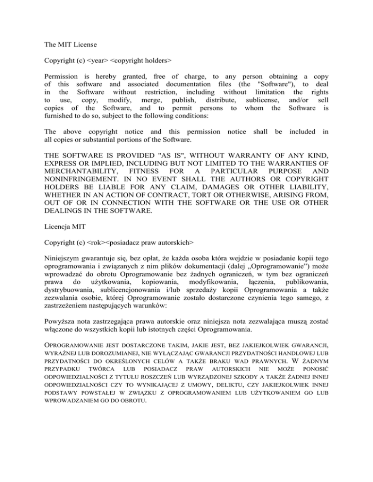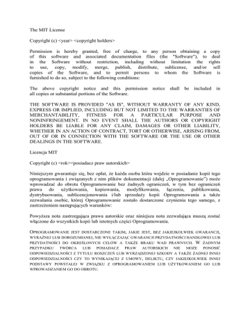The MIT License Copyright (c) <year> <copyright holders> Permission is hereby granted, free of charge, to any person obtaining a copy of this software and associated documentation files (the "Software"), to deal in the Software without restriction, including without limitation the rights to use, copy, modify, merge, publish, distribute, sublicense, and/or sell copies of the Software, and to permit persons to whom the Software is furnished to do so, subject to the following conditions: The above copyright notice and this permission notice shall be included in all copies or substantial portions of the Software. THE SOFTWARE IS PROVIDED "AS IS", WITHOUT WARRANTY OF ANY KIND, EXPRESS OR IMPLIED, INCLUDING BUT NOT LIMITED TO THE WARRANTIES OF MERCHANTABILITY, FITNESS FOR A PARTICULAR PURPOSE AND NONINFRINGEMENT. IN NO EVENT SHALL THE AUTHORS OR COPYRIGHT HOLDERS BE LIABLE FOR ANY CLAIM, DAMAGES OR OTHER LIABILITY, WHETHER IN AN ACTION OF CONTRACT, TORT OR OTHERWISE, ARISING FROM, OUT OF OR IN CONNECTION WITH THE SOFTWARE OR THE USE OR OTHER DEALINGS IN THE SOFTWARE. Licencja MIT Copyright (c) <rok><posiadacz praw autorskich> Niniejszym gwarantuje się, bez opłat, Ŝe kaŜda osoba która wejdzie w posiadanie kopii tego oprogramowania i związanych z nim plików dokumentacji (dalej „Oprogramowanie”) moŜe wprowadzać do obrotu Oprogramowanie bez Ŝadnych ograniczeń, w tym bez ograniczeń prawa do uŜytkowania, kopiowania, modyfikowania, łączenia, publikowania, dystrybuowania, sublicencjonowania i/lub sprzedaŜy kopii Oprogramowania a takŜe zezwalania osobie, której Oprogramowanie zostało dostarczone czynienia tego samego, z zastrzeŜeniem następujących warunków: PowyŜsza nota zastrzegająca prawa autorskie oraz niniejsza nota zezwalająca muszą zostać włączone do wszystkich kopii lub istotnych części Oprogramowania. OPROGRAMOWANIE JEST DOSTARCZONE TAKIM, JAKIE JEST, BEZ JAKIEJKOLWIEK GWARANCJI, WYRAŹNEJ LUB DOROZUMIANEJ, NIE WYŁĄCZAJĄC GWARANCJI PRZYDATNOŚCI HANDLOWEJ LUB PRZYDATNOŚCI DO OKREŚLONYCH CELÓW A TAKśE BRAKU WAD PRAWNYCH. W śADNYM PRZYPADKU TWÓRCA LUB POSIADACZ PRAW AUTORSKICH NIE MOśE PONOSIĆ ODPOWIEDZIALNOŚCI Z TYTUŁU ROSZCZEŃ LUB WYRZĄDZONEJ SZKODY A TAKśE śADNEJ INNEJ ODPOWIEDZIALNOŚCI CZY TO WYNIKAJĄCEJ Z UMOWY, DELIKTU, CZY JAKIEJKOLWIEK INNEJ PODSTAWY POWSTAŁEJ W ZWIĄZKU Z OPROGRAMOWANIEM LUB UśYTKOWANIEM GO LUB WPROWADZANIEM GO DO OBROTU.
