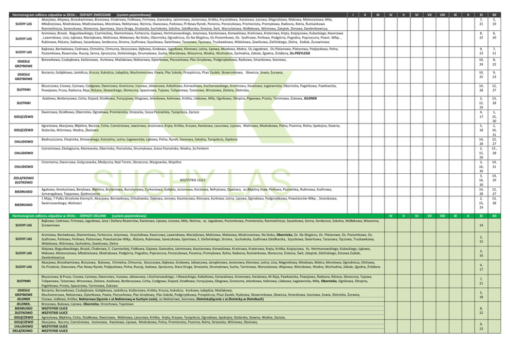 Harmonogram odbioru odpadów w 2016r.: ODPADY ZMIESZANE (system pojemnikowy) Akacjowa, Alejowa, Brzoskwiniowa, Brzozowa, Chabrowa, Fiołkowa, Firmowa, Gwiezdna, Jaśminowa, Jesionowa, Krótka, Kryształowa, Kwiatowa, Łozowa, Magnoliowa, Makowa, Meteorytowa, Miła, SUCHY LAS Młodzieżowa, Modrakowa, Modrzewiowa, Morelowa, Nektarowa, Nizinna, Owocowa, Parkowa, Pl.Nowy Rynek, Poranna, Porzeczkowa, Promienista, Promykowa, Radosna, Rolna, Rumiankowa Rzemieślnicza, Saneczkowa, Słoneczna, Sportowa, Stara Droga, Strażacka, Sucholeska, Szkolna, Szkółkarska, Śnieżna, Świt, Warsztatowa, Widłakowa, Wiśniowa, Zakątek, Zimowa, Zwolenkiewicza, Aroniowa, Brzask, Bogusławskiego, Czarnieckiej, Diamentowa, Forteczna, Gajowa, Hertmanowskiego, Jeżynowa, Kasztanowa, Konwaliowa, Krańcowa, Kraterowa, Kręta, Księżycowa, Kubackiego, Kwarcowa , Lawendowa, Lisia, Łąkowa, Maciejkowa, Malinowa, Malwowa, Na Stoku, Obornicka, Ogrodnicza, Os.Na Wzgórzu, Os.Poziomkowe, Os. Szafirowe, Perłowa, Podgórna, Pogodna, Poprzeczna, Powst. Wlkp. , SUCHY LAS Rubinowa, Różana, Sadowa, Sasankowa, Serdeczna, Stroma, Szafirowa, Szyszkowa, Świerkowa, Tarasowa, Tęczowa, Truskawkowa, Widokowa, Zawilcowa, Zielińskiego, Zielna, Zodiak, Żurawinowa SUCHY LAS OSIEDLE GRZYBOWE OSIEDLE GRZYBOWE ZŁOTNIKI I II III IV V VI VII VIII IX X XI 7, 21 XII 5, 19 8, 22 6, 20 Bajkowa, Borówkowa, Cedrowa, Chmielna, Chmurna, Deszczowa, Dębowa, Grabowa, Jagodowa, Klonowa, Leśna, Lipowa, Miodowa, Mokra, Os.Jagodowe, Os.Platanowe, Platanowa, Podjazdowa, Polna, Poziomkowa, Rewersów, Ruczaj, Senna, Sprzeczna, Stefańskiego, Strumykowa, Sucha, Wierzbowa, Wiosenna, Wodna, Wschodnia, Zachodnia, Zakole, Zgodna, Źródlana, Os.PRZYLESIE 9, 23 7, 21 Borowikowa, Czubajkowa, Koźlarzowa, Kurkowa, Maślakowa, Nektarowa, Opieńkowa, Pieczarkowa, Plac Grzybowy, Podgrzybokowa, Rydzowa, Smardzowa, Sosnowa, 10, 24 8, 22 Bociania, Gołąbkowa, Jaskółcza, Krucza, Kukułcza, Łabędzia, Muchomorowa, Pawia, Plac Sokoła, Przepiórcza, Ptasi Zaułek, Skowronkowa, Słowicza, Sowia, Żurawia, 10, 25 9, 23 Bluszczowa, Cisowa, Cynowa, Czołgowa, Dworcowa, Graniczna, Irysowa, Jałowcowa, Kobaltowa, Konwaliowa, Kochanowskiego, Krzemowa, Kwiatowa, Łagiewnicka, Obornicka, Pagórkowa, Pawłowicka, Powojowa, Prusa, Radosna, Reja, Różana, Słowackiego, Słoneczna, Spacerowa, Tujowa, Tulipanowa, Tytanowa, Wrzosowa, Zielona, Złotnicka, 14, 28 12, 27 Azaliowa, Berberysowa, Cicha, Dojazd, Działkowa, Forsycjowa, Głogowa, Jelonkowa, Kalinowa, Krótka, Lilakowa, Miła, Ognikowa, Okrężna, Pigwowa, Prosta, Tarninowa, Żukowa, JELONEK 2, 15, 29 4, 17 13, 28 ZŁOTNIKI Dworcowa, Działkowa, Obornicka, Ogrodowa, Promienista, Strażacka, Szosa Poznańska, Tysiąclecia, Zacisze GOLĘCZEWO GOLĘCZEWO CHLUDOWO Agrestowa, Akacjowa, Błękitna, Boczna, Cicha, Czereśniowa, Jaworowa, Jesionowa, Kręta, Krótka, Krzywa, Kwiatowa, Lazurowa, Lipowa, Malinowa, Modrakowa, Polna, Pszenna, Rolna, Spokojna, Stawna, Stolarska, Wiśniowa, Wodna, Zbożowa 5, 18 Biedruszczana, Chojnicka, Dmowskiego, Kościelna, Leśna, Łagiewnicka, Łąkowa, Polna, Rynek, Sosnowa, Szkolna, Tysiąclecia, Zapłocie 14, 28 2, 15, 29 3, 16, 30 3, 16, 30 14, 28 2, 15, 29 Czereśniowa, Ekologiczna, Maniewska, Obornicka, Poznańska, Strumykowa, Szosa Poznańska, Wodna, Za Parkiem CHLUDOWO Cmentarna, Dworcowa, Golęczewska, Medyczna, Nad Torem, Słoneczna, Wargowska, Wspólna CHLUDOWO ZIELĄTKOWO ZŁOTKOWO BIEDRUSKO BIEDRUSKO WSZYSTKIE ULICE Agatowa, Ametystowa, Berylowa, Błękitna, Brylantowa, Bursztynowa, Cyrkoniowa, Gołębia, Jesionowa, Koralowa, Nefrytowa, Opalowa, os.Błękitny Staw, Perłowa, Poznańska, Rubinowa, Szafirowa, Szmaragdowa, Topazowa, Zjednoczenia 1 Maja, 7 Pułku Strzelców Konnych, Akacjowa, Borowikowa, Chludowska, Dębowa, Janowo, Kasztanowa, Klonowa, Kurkowa, Leśna, Lipowa, Ogrodowa, Podgrzybkowa, Powstanców Wlkp. , Smardzowa, Świerczewskiego, Wolności Harmonogram odbioru odpadów w 2016r.: ODPADY ZIELONE (system pojemnikowy) Bajkowa, Cedrowa, Firmowa, Jagodowa, Jana i Stefana Rewersów, Kwiatowa, Lipowa, Łozowa, Miła, Nizinna, os. Jagodowe, Poziomkowa, Promienista, Rzemieślnicza, Sasankowa, Senna, Serdeczna, Szkolna, Widłakowa, Wiosenna, SUCHY LAS Żurawinowa SUCHY LAS SUCHY LAS SUCHY LAS ZŁOTNIKI OSIEDLE GRZYBOWE JELONEK JELONEK, BIEDRUSKO ZŁOTKOWO GOLĘCZEWO GOLĘCZEWO CHLUDOWO ZIELĄTKOWO Aroniowa, Borówkowa, Diamentowa, Forteczna, Jeżynowa, Kryształowa, Kwarcowa, Lawendowa, Maciejkowa, Malinowa, Malwowa, Modrzewiowa, Na Stoku, Obornicka, Os. Na Wzgórzu, Os. Platanowe, Os. Poziomkowe, Os. Szafirowe, Parkowa, Perłowa, Platanowa, Powstańców Wlkp., Różana, Rubinowa, Saneczkowa, Sportowa, S. Stefańskiego, Stroma, Sucholeska, Szafirowa Szkółkarska, Szyszkowa, Świerkowa, Tarasowa, Tęczowa, Truskawkowa, Widokowa, Wiśniowa, Zachodnia, Zawilcowa, Zielna Alejowa, Bogusławskiego, Brzask, Chabrowa, E. Czarnieckiej, Fiołkowa, Gajowa, Gwiezdna, Jaśminowa, Kasztanowa, Konwaliowa, Krańcowa, Kraterowa, Kręta, Krótka, Księżycowa, Ks. Hertmanowskiego, Kubackiego, Łąkowa, Makowa, Meteorytowa, Młodzieżowa, Modrakowa, Podgórna, Pogodna, Poprzeczna, Porzeczkowa, Poranna, Promykowa, Rolna, Radosna, Rumiankowa, Słoneczna, Śnieżna, Świt, Zakątek, Zielińskiego, Zimowa Zodiak, Zwolenkiewicza Akacjowa, Brzoskwiniowa, Brzozowa, Bukowa, Chmielna, Chmurna, Deszczowa, Dębowa, Grabowa, Jałowcowa, Jarzębinowa, Jesionowa, Klonowa, Leśna, Lisia, Magnoliowa, Miodowa, Mokra, Morelowa, Ogrodnicza, Olchowa, Os.Przylesie, Owocowa, Plac Nowy Rynek, Podjazdowa, Polna, Ruczaj, Sadowa, Sprzeczna, Stara Droga, Strażacka, Strumykowa, Sucha, Tarninowa, Warsztatowa, Wiązowa, Wierzbowa, Wodna, Wschodnia, Zakole, Zgodna, Źródlana Bluszczowa, B.Prusa, Cisowa, Cynowa, Dworcowa, Irysowa, Jałowcowa, J.Kochanowskiego, J.Słowackiego, Kobaltowa, Konwaliowa, Krzemowa, Kwiatowa, M.Reja, Pawłowicka, Powojowa, Radosna, Różana, Słoneczna, Tujowa, Tulipanowa, Tytanowa, Wrzosowa, Zie