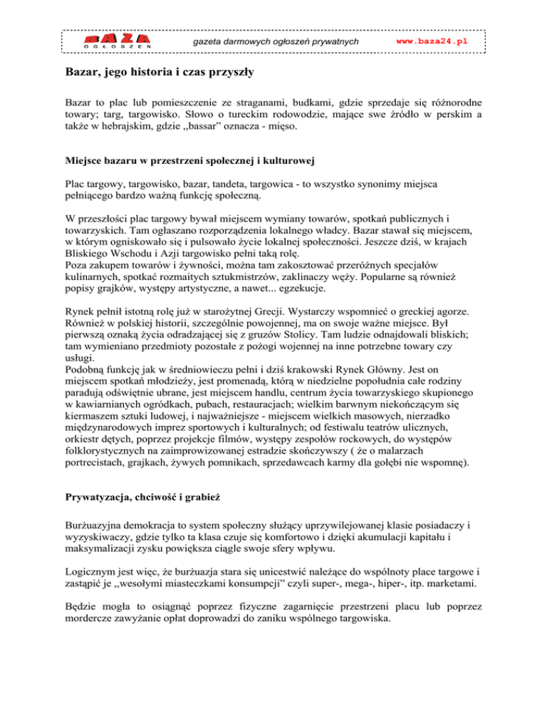 gazeta darmowych ogłoszeń prywatnych www.baza24.pl Bazar, jego historia i czas przyszły Bazar to plac lub pomieszczenie ze straganami, budkami, gdzie sprzedaje się różnorodne towary; targ, targowisko. Słowo o tureckim rodowodzie, mające swe źródło w perskim a także w hebrajskim, gdzie ,,bassar” oznacza - mięso. Miejsce bazaru w przestrzeni społecznej i kulturowej Plac targowy, targowisko, bazar, tandeta, targowica - to wszystko synonimy miejsca pełniącego bardzo ważną funkcję społeczną. W przeszłości plac targowy bywał miejscem wymiany towarów, spotkań publicznych i towarzyskich. Tam ogłaszano rozporządzenia lokalnego władcy. Bazar stawał się miejscem, w którym ogniskowało się i pulsowało życie lokalnej społeczności. Jeszcze dziś, w krajach Bliskiego Wschodu i Azji targowisko pełni taką rolę. Poza zakupem towarów i żywności, można tam zakosztować przeróżnych specjałów kulinarnych, spotkać rozmaitych sztukmistrzów, zaklinaczy węży. Popularne są również popisy grajków, występy artystyczne, a nawet... egzekucje. Rynek pełnił istotną rolę już w starożytnej Grecji. Wystarczy wspomnieć o greckiej agorze. Również w polskiej historii, szczególnie powojennej, ma on swoje ważne miejsce. Był pierwszą oznaką życia odradzającej się z gruzów Stolicy. Tam ludzie odnajdowali bliskich; tam wymieniano przedmioty pozostałe z pożogi wojennej na inne potrzebne towary czy usługi. Podobną funkcję jak w średniowieczu pełni i dziś krakowski Rynek Główny. Jest on miejscem spotkań młodzieży, jest promenadą, którą w niedzielne popołudnia całe rodziny paradują odświętnie ubrane, jest miejscem handlu, centrum życia towarzyskiego skupionego w kawiarnianych ogródkach, pubach, restauracjach; wielkim barwnym niekończącym się kiermaszem sztuki ludowej, i najważniejsze - miejscem wielkich masowych, nierzadko międzynarodowych imprez sportowych i kulturalnych; od festiwalu teatrów ulicznych, orkiestr dętych, poprzez projekcje filmów, występy zespołów rockowych, do występów folklorystycznych na zaimprowizowanej estradzie skończywszy ( że o malarzach portrecistach, grajkach, żywych pomnikach, sprzedawcach karmy dla gołębi nie wspomnę). Prywatyzacja, chciwość i grabież Burżuazyjna demokracja to system społeczny służący uprzywilejowanej klasie posiadaczy i wyzyskiwaczy, gdzie tylko ta klasa czuje się komfortowo i dzięki akumulacji kapitału i maksymalizacji zysku powiększa ciągle swoje sfery wpływu. Logicznym jest więc, że burżuazja stara się unicestwić należące do wspólnoty place targowe i zastąpić je ,,wesołymi miasteczkami konsumpcji” czyli super-, mega-, hiper-, itp. marketami. Będzie mogła to osiągnąć poprzez fizyczne zagarnięcie przestrzeni placu lub poprzez mordercze zawyżanie opłat doprowadzi do zaniku wspólnego targowiska. gazeta darmowych ogłoszeń prywatnych www.baza24.pl Ten proces zaczął się nie od dzisiaj. Już w poprzednich formacjach, na początku drugiego tysiąclecia, wystąpiły tendencje zawłaszczania i grabieży wspólnotowej własności o charakterze kolektywnym w postaci własności: królewskiej, państwowej, komunalnej, gminnej, itp. traktowanej przedtem jako nienaruszalne, podobnie jak w Europie przedchrześcijańskiej traktowano Święte Gaje. Pierwsze takie praktyki miały miejsce w Anglii, gdzie zaczęto rozgrabiać własność wspólnotową pod przykrywką prywatyzacji. Jak zauważył Jeremy Rifkin w „Biosphere Politics”: ,,kawałkowanie niegdyś wspólnej własności ziemi zapoczątkowało zawłaszczanie, prywatyzację i komercjalizację niemal każdego fragmentu natury. Krok po kroku następowało wnoszenie opłat na wszystko, co kiedyś było dostępne darmo. Dzisiaj kupujemy wodę pitną, płacimy za czyste powietrze, uważamy fale radiowe i TV za dobro podlegające prawu własności, a ostatnio nawet pule genetyczne zostały sprywatyzowane. Ten ciągły proces oddzielania części od całości stworzył niegdyś instytucje takie jak międzynarodowe korporacje, oraz współczesne teorie ekonomiczne, które uważają pieniądze i prawo własności za jedyną miarę ludzkiej kondycji.” Konsumeryzm jako oręż kapitalizmu w walce z tradycyjnymi wartościami społeczeństw. Konsumeryzm opiera się na systemie swych własnych, odmiennych ,,wartości”, do których szczególnie należą: niczym nielimitowana wolność wyboru, oraz chęć zaspokojenia najbardziej wyrafinowanych potrzeb klienta. Konsumeryzm zastosowany do ludzi dorosłych w ograniczonej dawce, może nie przynieść zbytnich szkód, jednakże dostarczony dzieciom w dawce jaka występuje w amerykańskim społeczeństwie, może podkopać wszelkie konkurencyjne systemy wartości. Rozpad tradycyjnego systemu wartości, do którego przyczyniają się media, staje się coraz bardziej oczywisty. Po 70 latach indoktrynacji każdy powinien solidaryzować się z narodami, które starają się przeciwstawić próbie wytresowania ich dzieci na konsumentów w amerykańskim stylu. Celem konsumpcjonizmu jest zamienienie człowieka w ,,maszynę do konsumpcji”, czyli zdehumanizowaną jednostkę, dla której jedynym sensem życia staje się praca, dająca możliwość zdobycia szeroko pojętych dóbr materialnych. Do tego celu służy nachalna i pozbawiona wszelkich zasad etycznych reklama. To właśnie w Supermarkecie ogniskują się jak w soczewce wszelkie łatwe do zaobserwowania anty-ludzkie i anty-społeczne cechy konsumeryzmu. Market to wesołe miasteczko konsumeryzmu, przepychu, przesytu, orgia zakupów i wydawania pieniędzy. Supermarket ma za zadanie tak psychicznie ,,spreparować” zdezorientowaną jednostkę, by łatwiej wydrzeć z niej pieniądze, a w zamian za nie, dać jej złudne poczucie ,,szczęścia” płynącego z nabywania przedmiotów. gazeta darmowych ogłoszeń prywatnych www.baza24.pl Rzecz jasna w drodze ciągłego i niekończącego się procesu dokonywania cor