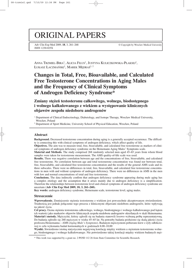 08-trzmiel.qxd 7/10/09 12:38 PM Page 261 ORIGINAL PAPERS Adv Clin Exp Med 2009, 18, 3, 261–268 ISSN 1230−025X © Copyright by Wroclaw Medical University ANNA TRZMIEL−BIRA1, ALICJA FILUS1, JUSTYNA KULICZKOWSKA−PŁAKSEJ1, ŁUKASZ ŁACZMAŃSKI1, MAREK MĘDRAŚ1, 2 Changes in Total, Free, Bioavailable, and Calculated Free Testosterone Concentrations in Aging Males and the Frequency of Clinical Symptoms of Androgen Deficiency Syndrome* Zmiany stężeń testosteronu całkowitego, wolnego, biodostępnego i wolnego kalkulowanego z wiekiem a występowanie klinicznych objawów zespołu niedoboru androgenów 1 Department of Clinical Endocrinology, Diabetology, and Isotope Therapy, Wroclaw Medical University, Wrocław, Poland 2 Department of Sport Medicine, University School of Physical Education, Wrocław, Poland Abstract Background. Decreased testosterone concentration during aging is a generally accepted occurrence. The difficul− ty is connecting this with clinical symptoms of androgen deficiency, which affect quality of life. Objectives. The aim was to measure total, free, bioavailable, and calculated free testosterone as markers of clini− cal symptoms of androgen deficiency syndrome on the Heinemann Aging Males’ Symptoms scale. Material and Methods. The study comprised 268 randomly selected men aged 45–65 years from whom blood samples were taken for testosterone measurement. The AMS quality−of−life scale was used. Results. There was negative correlation between age and the concentrations of free, bioavailable, and calculated free testosterone. No correlation between age and total testosterone concentration was found nor between total, free, bioavailable, and calculated free testosterone concentration and the results of the general AMS scale and its three subscales. There were no differences in total, free, bioavailable, and calculated free testosterone concentra− tions in men with and without symptoms of androgen deficiency. There were no differences in AMS in the men with low and normal concentrations of total and free testosterone. Conclusions. The data indirectly confirm that androgen deficiency syndrome appearing during male aging has a complex etiology and the assumption that it arises mainly due to androgen deficiency is a simplification. Therefore the relationships between testosterone level and clinical symptoms of androgen deficiency syndrome are uncertain (Adv Clin Exp Med 2009, 18, 3, 261–268). Key words: androgen deficiency syndrome, Heinemann scale, testosterone level, aging males. Streszczenie Wprowadzenie. Zmniejszenie stężenia testosteronu z wiekiem jest powszechnie akceptowanym stwierdzeniem. Trudnością jest jednak połączenie tego procesu z klinicznymi objawami niedoboru androgenów, które wpływają na jakość życia. Cel pracy. Ocena stężenia testosteronu całkowitego, wolnego, biodostępnego i wolnego kalkulowanego pod kątem ich wartości jako markerów objawów klinicznych zespołu niedoboru androgenów określanych w skali Heinemanna. Materiał i metody. Mężczyźni, którzy zgłosili się na badania stanowili losowo wybraną próbę reprezentatywną. Do badania zgłosiło się 268 mężczyzn w wieku 45–65 lat. Na potrzeby badania posłużono się skalą jakości życia profesora Heinemanna – AMS (Aging Male’s Symptoms). Badanym mężczyznom pobierano krew z żyły odłokcio− wej w celu wykonania badań hormonalnych w godzinach 8.00–10.00 Wyniki. Stwierdzono istotną statystycznie negatywną korelację między wiekiem a stężeniem testosteronu wolne− go, biodostępnego i wolnego kalkulowanego. Nie potwierdzono takiej korelacji między wiekiem badanych męż− * This work was supported by a grant no. 2 PO5D 112 26 from State Committee for Scientific Research. 08-trzmiel.qxd 7/10/09 12:38 PM Page 262 262 A. TRZMIEL−BIRA et al. czyzn a stężeniem testosteronu całkowitego. Nie ma natomiast żadnej istotnej korelacji między stężeniem testoste− ronu całkowitego, wolnego, biodostępnego i wolnego kalkulowanego a wynikami w skali Heinemanna zarówno ogólnej, jak i podskalach. Wnioski. Uzyskane wyniki potwierdzają pośrednio koncepcję, iż tzw. zespół niedoboru androgenów pojawiający się w procesie starzenia się mężczyzn jest zespołem polietiologicznym, a założenie, iż wynika on głównie z niedo− boru androgenów jest nadmiernym uproszczeniem. Dlatego też związki między stężeniem testosteronu a objawa− mi klinicznymi tzw. zespołu niedoboru androgenów są wątpliwe (Adv Clin Exp Med 2009, 18, 3, 261–268). Słowa kluczowe: zespół niedoboru androgenów, skala Heinemanna, stężenie testosteronu, starzenie się mężczyzn. Decreased testosterone concentration during aging is a generally accepted occurrence. The dif− ficulty is connecting this process with clinical symptoms of androgen deficiency, which affect quality of life in the emotional, social, and sexual realms as well as vital energy and mental function [1–3]. The so−called “andropause” is a state char− acterized primarily by diminished sexual desire and erectile quality, depressed mood and irritabili− ty, decrease in lean body mass with associated diminution in muscle volume and strength, decrease in body hair, decreased bone mineral density, and increased visceral fat [4]. None of these symptoms are specific to a low−androgen condition, but may raise suspicion of testosterone deficiency [5]. The causes are many, but it probably comes from the fact that the clinical symptoms of andro− gen deficiency syndrome result from age−induced reductions in the levels of androgens and other hormones with anabolic activity (mainly growth hormone), similar to testosterone. Increasing attention is being paid to these hormones because changes in their levels may be responsible for some of the manifestations previously attributed exclusively to testosterone deficiency. Declines in DHEA and DHEA−S are a more constant feature of advan