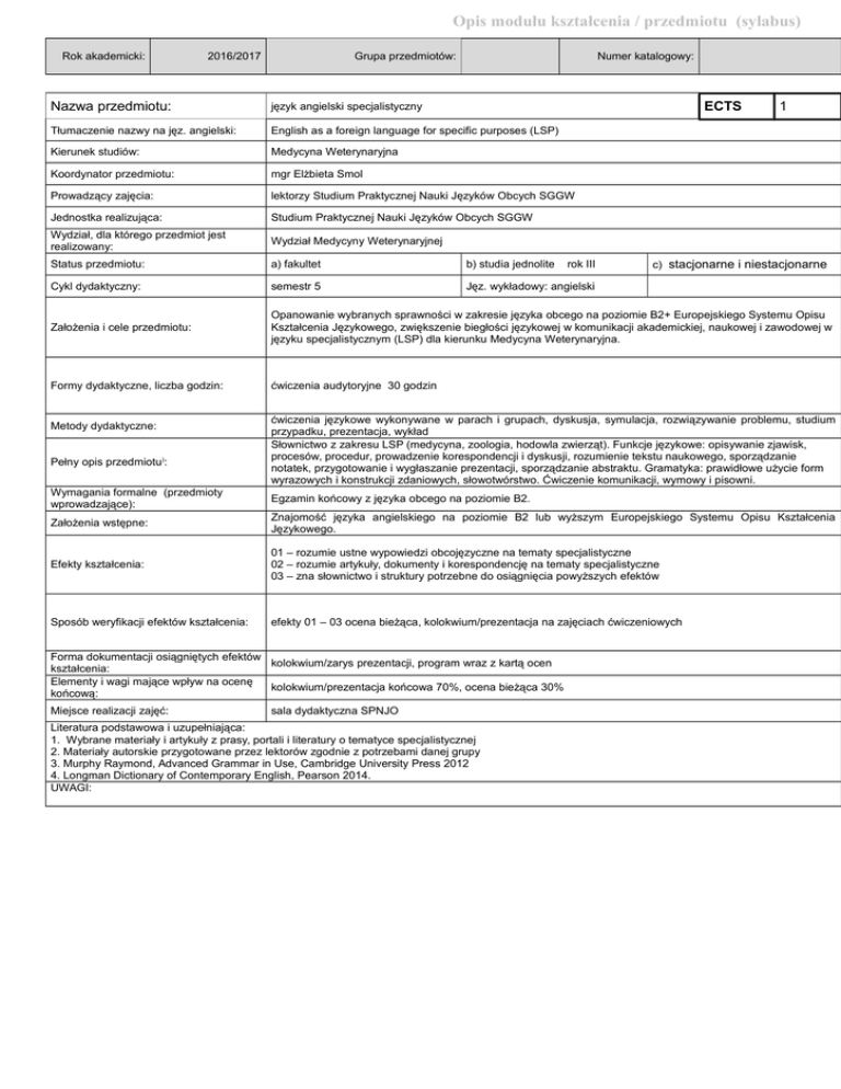 Opis modułu kształcenia / przedmiotu (sylabus) Rok akademicki: 2016/2017 Grupa przedmiotów: Numer katalogowy: Nazwa przedmiotu: język angielski specjalistyczny Tłumaczenie nazwy na jęz. angielski: English as a foreign language for specific purposes (LSP) Kierunek studiów: Medycyna Weterynaryjna Koordynator przedmiotu: mgr Elżbieta Smol Prowadzący zajęcia: lektorzy Studium Praktycznej Nauki Języków Obcych SGGW Jednostka realizująca: Studium Praktycznej Nauki Języków Obcych SGGW Wydział, dla którego przedmiot jest realizowany: Wydział Medycyny Weterynaryjnej Status przedmiotu: a) fakultet b) studia jednolite Cykl dydaktyczny: semestr 5 Jęz. wykładowy: angielski Założenia i cele przedmiotu: Opanowanie wybranych sprawności w zakresie języka obcego na poziomie B2+ Europejskiego Systemu Opisu Kształcenia Językowego, zwiększenie biegłości językowej w komunikacji akademickiej, naukowej i zawodowej w języku specjalistycznym (LSP) dla kierunku Medycyna Weterynaryjna. Formy dydaktyczne, liczba godzin: ćwiczenia audytoryjne 30 godzin Metody dydaktyczne: Pełny opis przedmiotu): ECTS rok III 1 c) stacjonarne i niestacjonarne ćwiczenia językowe wykonywane w parach i grupach, dyskusja, symulacja, rozwiązywanie problemu, studium przypadku, prezentacja, wykład Słownictwo z zakresu LSP (medycyna, zoologia, hodowla zwierząt). Funkcje językowe: opisywanie zjawisk, procesów, procedur, prowadzenie korespondencji i dyskusji, rozumienie tekstu naukowego, sporządzanie notatek, przygotowanie i wygłaszanie prezentacji, sporządzanie abstraktu. Gramatyka: prawidłowe użycie form wyrazowych i konstrukcji zdaniowych, słowotwórstwo. Ćwiczenie komunikacji, wymowy i pisowni. Wymagania formalne (przedmioty wprowadzające): Egzamin końcowy z języka obcego na poziomie B2. Założenia wstępne: Znajomość języka angielskiego na poziomie B2 lub wyższym Europejskiego Systemu Opisu Kształcenia Językowego. Efekty kształcenia: 01 – rozumie ustne wypowiedzi obcojęzyczne na tematy specjalistyczne 02 – rozumie artykuły, dokumenty i korespondencję na tematy specjalistyczne 03 – zna słownictwo i struktury potrzebne do osiągnięcia powyższych efektów Sposób weryfikacji efektów kształcenia: efekty 01 – 03 ocena bieżąca, kolokwium/prezentacja na zajęciach ćwiczeniowych Forma dokumentacji osiągniętych efektów kolokwium/zarys prezentacji, program wraz z kartą ocen kształcenia: Elementy i wagi mające wpływ na ocenę kolokwium/prezentacja końcowa 70%, ocena bieżąca 30% końcową: Miejsce realizacji zajęć: sala dydaktyczna SPNJO Literatura podstawowa i uzupełniająca: 1. Wybrane materiały i artykuły z prasy, portali i literatury o tematyce specjalistycznej 2. Materiały autorskie przygotowane przez lektorów zgodnie z potrzebami danej grupy 3. Murphy Raymond, Advanced Grammar in Use, Cambridge University Press 2012 4. Longman Dictionary of Contemporary English, Pearson 2014. UWAGI: Opis modułu kształcenia / przedmiotu (sylabus) Rok akademicki: 2016/2017 Grupa przedmiotów: Numer katalogowy: Nazwa przedmiotu: język francuski specjalistyczny Tłumaczenie nazwy na jęz. niemiecki: French as a foreign language for specific purposes (LSP) Kierunek studiów: Medycyna Weterynaryjna Koordynator przedmiotu: mgr Ewa Sikorska Prowadzący zajęcia: lektorzy Studium Praktycznej Nauki Języków Obcych SGGW Jednostka realizująca: Studium Praktycznej Nauki Języków Obcych SGGW Wydział, dla którego przedmiot jest realizowany: Wydział Medycyny Weterynaryjnej Status przedmiotu: a) fakultet b) studia jednolite Cykl dydaktyczny: semestr 5 Jęz. wykładowy: niemiecki Założenia i cele przedmiotu: Opanowanie wybranych sprawności w zakresie języka obcego na poziomie B2+ Europejskiego Systemu Opisu Kształcenia Językowego, zwiększenie biegłości językowej w komunikacji akademickiej, naukowej i zawodowej w języku specjalistycznym (LSP) dla kierunku Medycyna Weterynaryjna. Formy dydaktyczne, liczba godzin: ćwiczenia audytoryjne 30 godzin Metody dydaktyczne: Pełny opis przedmiotu): ECTS rok III 1 c) stacjonarne i niestacjonarne ćwiczenia językowe wykonywane w parach i grupach, dyskusja, symulacja, rozwiązywanie problemu, studium przypadku, prezentacja, wykład Słownictwo z zakresu LSP (medycyna, zoologia, hodowla zwierząt). Funkcje językowe: opisywanie zjawisk, procesów, procedur, prowadzenie korespondencji i dyskusji, rozumienie tekstu naukowego, sporządzanie notatek, przygotowanie i wygłaszanie prezentacji, sporządzanie abstraktu. Gramatyka: prawidłowe użycie form wyrazowych i konstrukcji zdaniowych, słowotwórstwo. Ćwiczenie komunikacji, wymowy i pisowni. Wymagania formalne (przedmioty wprowadzające): Egzamin końcowy z języka obcego na poziomie B2. Założenia wstępne: Znajomość języka francuskiego na poziomie B2 lub wyższym Europejskiego Systemu Opisu Kształcenia Językowego. Efekty kształcenia: 01 – rozumie ustne wypowiedzi obcojęzyczne na tematy specjalistyczne 02 – rozumie artykuły, dokumenty i korespondencję na tematy specjalistyczne 03 – zna słownictwo i struktury potrzebne do osiągnięcia powyższych efektów Sposób weryfikacji efektów kształcenia: efekty 01 – 03 ocena bieżąca, kolokwium/prezentacja na zajęciach ćwiczeniowych Forma dokumentacji osiągniętych efektów kolokwium/zarys prezentacji, program wraz z kartą ocen kształcenia: Elementy i wagi mające wpływ na ocenę kolokwium/prezentacja końcowa 70%, ocena bieżąca 30% końcową: Miejsce realizacji zajęć: sala dydaktyczna SPNJO Literatura podstawowa i uzupełniająca: 1. Wybrane materiały i artykuły z prasy, portali i literatury o tematyce specjalistycznej 2. Materiały autorskie przygotowane przez lektorów zgodnie z potrzebami danej grupy 3. Miquel Claire, Vocabulaire progressif du français avancé, CLE International 2013 4. Le grand Larousse illustré 2016 UWAGI: Opis modułu kształcenia / przedmiotu (sylabus) Rok akademicki: 2016/2017 G