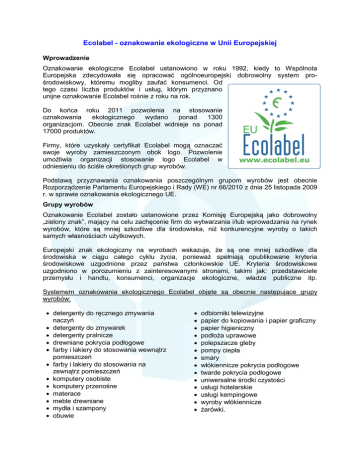 Ecolabel - oznakowanie ekologiczne w Unii Europejskiej Wprowadzenie Oznakowanie ekologiczne Ecolabel ustanowiono w roku 1992, kiedy to Wspólnota Europejska zdecydowała się opracować ogólnoeuropejski dobrowolny system prośrodowiskowy, któremu mogliby zaufać konsumenci. Od tego czasu liczba produktów i usług, którym przyznano unijne oznakowanie Ecolabel rośnie z roku na rok. Do końca roku 2011 pozwolenia na stosowanie oznakowania ekologicznego wydano ponad 1300 organizacjom. Obecnie znak Ecolabel widnieje na ponad 17000 produktów. Firmy, które uzyskały certyfikat Ecolabel mogą oznaczać swoje wyroby zamieszczonym obok logo. Pozwolenie umoŜliwia organizacji stosowanie logo Ecolabel w odniesieniu do ściśle określonych grup wyrobów. Podstawą przyznawania oznakowania poszczególnym grupom wyrobów jest obecnie Rozporządzenie Parlamentu Europejskiego i Rady (WE) nr 66/2010 z dnia 25 listopada 2009 r. w sprawie oznakowania ekologicznego UE. Grupy wyrobów Oznakowanie Ecolabel zostało ustanowione przez Komisję Europejską jako dobrowolny „zielony znak”, mający na celu zachęcenie firm do wytwarzania i/lub wprowadzania na rynek wyrobów, które są mniej szkodliwe dla środowiska, niŜ konkurencyjne wyroby o takich samych własnościach uŜytkowych. Europejski znak ekologiczny na wyrobach wskazuje, Ŝe są one mniej szkodliwe dla środowiska w ciągu całego cyklu Ŝycia, poniewaŜ spełniają opublikowane kryteria środowiskowe uzgodnione przez państwa członkowskie UE. Kryteria środowiskowe uzgodniono w porozumieniu z zainteresowanymi stronami, takimi jak: przedstawiciele przemysłu i handlu, konsumenci, organizacje ekologiczne, władze publiczne itp. Systemem oznakowania ekologicznego Ecolabel objęte są obecnie następujące grupy wyrobów: • detergenty do ręcznego zmywania naczyń • detergenty do zmywarek • detergenty pralnicze • drewniane pokrycia podłogowe • farby i lakiery do stosowania wewnątrz pomieszczeń • farby i lakiery do stosowania na zewnątrz pomieszczeń • komputery osobiste • komputery przenośne • materace • meble drewniane • mydła i szampony • obuwie • • • • • • • • • • • • • • odbiorniki telewizyjne papier do kopiowania i papier graficzny papier higieniczny podłoŜa uprawowe polepszacze gleby pompy ciepła smary włókiennicze pokrycia podłogowe twarde pokrycia podłogowe uniwersalne środki czystości usługi hotelarskie usługi kempingowe wyroby włókiennicze Ŝarówki. W trakcie opracowania są kryteria obejmujące kolejne grupy wyrobów. PoniŜej zestawiono przewidywane nowe grupy wyrobów, dla których opracowane zostaną kryteria środowiskowe: • • • • • • • • • • • • • • • • akcesoria wykończeniowe elementy budowlane izolacje klimatyzacja kopiarki małe elektryczne urządzenia gospodarstwa domowego naczynia kuchenne, osprzęt gospodarstwa domowego opakowania papier drukowy pralnie chemiczne przybory do pisania rękawice samochody sprzęt sportowy systemy ogrzewania systemy ogrzewania wodą • • • • • • • • • • • • • • • • tapety telefony torby na zakupy – torby z uchwytami usługi budowlane usługi dostawcze usługi finansowe usługi naprawy pojazdów usługi sprzedaŜy detalicznej usługi transportowe worki na odpady/torby plastikowe wyroby sanitarne (podpaski higieniczne i pieluchy) wyroby z papieru drukowanego wyroby z papieru przetworzonego, artykuły piśmienne wyroby ze skóry wyroby dla domu zabawki i gry. Rozwój systemu Ecolabel – dane statystyczne W poniŜszej tabeli przedstawiono rozwój systemu oznakowania ekologicznego Ecolabel w latach 1997 ÷ 2011. Tabela obrazuje liczbę organizacji, które w poszczególnych latach miały moŜliwość uŜywania znaku Ecolabel w odniesieniu do wytwarzanych przez siebie produktów bądź świadczonych usług. 1997 1998 1999 2000 2001 2002 2003 2004 2005 2006 2007 2008 2009 2010 2011 Liczba pozwoleń w roku: 11 33 39 53 95 128 166 224 249 386 514 754 1015 1064 1357 Jak wspomniano wcześniej system Ecolabel obejmuje obecnie szeroki zakres produktów i usług. Systemem nie są objęte produkty lecznicze, wyroby medyczne oraz artykuły Ŝywnościowe i pasze. Wyroby z papieru tissue (papier higieniczny) oraz uniwersalne środki czyszczące stanowią odpowiednio około 11% i 12% wszystkich produktów, którym przyznano Ecolabel. Około 14% stanowią farby i lakiery do stosowania wewnątrz pomieszczeń. Największą grupę produktów oznakowanych Ecolabel stanowią twarde pokrycia podłogowe, a ich udział w liczbie oznakowanych produktów sięga około 35%. Dotychczas znak Ecolabel przyznano setkom odbiorników telewizyjnych oraz mydeł i szamponów. W kolejnej tabeli przedstawiono orientacyjną liczbę produktów i usług, którym przyznano oznakowanie ekologiczne Ecolabel w poszczególnych grupach wyrobów (dane aktualne na dzień 31 grudnia 2011 r.). Lp. Grupa wyrobów Liczba produktów 1 Twarde pokrycia podłogowe 6250 2 Farby i lakiery do stosowania wewnątrz pomieszczeń 2470 3 Uniwersalne środki czystości 2120 4 Papier higieniczny 2000 5 Wyroby włókiennicze 1370 6 Papier do kopiowania i papier graficzny 720 7 Odbiorniki telewizyjne 680 8 Mydła i szampony 410 9 Detergenty do ręcznego zmywania naczyń 370 10 Usługi hotelarskie 360 11 Detergenty pralnicze 260 Krajami przodującymi w liczbie przyznanych produktom i usługom oznakowań ekologicznych Ecolabel są: Włochy, Francja i Niemcy. We Włoszech znak Ecolabel nadano wyrobom, które stanowią ponad 50% wszystkich produktów Liczba nagrodzonych w Unii Europejskiej. We Francji Lp. Kraj produktów i Zjednoczonym Królestwie udział produktów oznakowanych ekologicznie to odpowiednio 1 Włochy 9070 około 22% i 9% całkowitej liczby certyfikatów 2 Francja 3840 w Unii. Kolejne miejsca na tej liście rankingowej zajmują: Holandia, Hiszpania i 3 Zjednoczone Królestwo 1620 Szwecja. ChociaŜ przedstawione dane