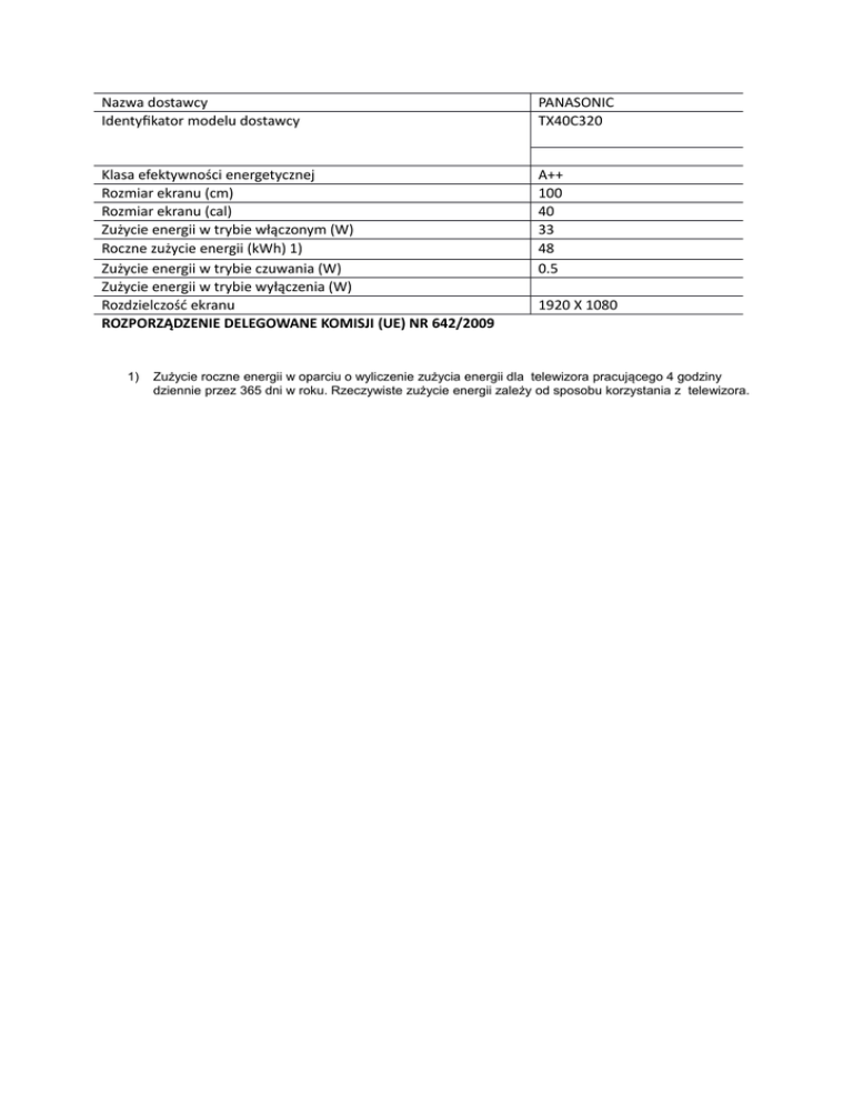 Nazwa dostawcy Identyfikator modelu dostawcy PANASONIC TX40C320 Klasa efektywności energetycznej Rozmiar ekranu (cm) Rozmiar ekranu (cal) Zużycie energii w trybie włączonym (W) Roczne zużycie energii (kWh) 1) Zużycie energii w trybie czuwania (W) Zużycie energii w trybie wyłączenia (W) Rozdzielczość ekranu ROZPORZĄDZENIE DELEGOWANE KOMISJI (UE) NR 642/2009 A++ 100 40 33 48 0.5 1) 1920 X 1080 Zużycie roczne energii w oparciu o wyliczenie zużycia energii dla telewizora pracującego 4 godziny dziennie przez 365 dni w roku. Rzeczywiste zużycie energii zależy od sposobu korzystania z telewizora.