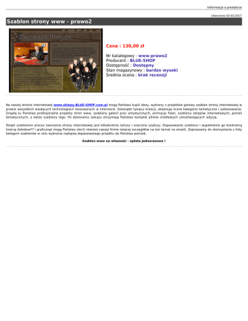 Informacje o produkcie Utworzono 02-03-2017 Szablon strony www - prawo2 Cena : 130,00 zł Nr katalogowy : www-prawo2 Producent : BLUE-SHOP Dostępność : Dostępny Stan magazynowy : bardzo wysoki Średnia ocena : brak recenzji Na naszej stronie internetowej www.sklepy.BLUE-SHOP.com.pl mogą Państwo kupić dany, wybrany z projektów gotowy szablon strony internetowej w prawie wszystkich wiodących technologiach stosowanych w internecie. Dziesiątki tysięcy kreacji, obejmują liczne kategorie tematyczne i zastosowania. Znajdą tu Państwo profesjonalne projekty stron www, szablony galerii prac artystycznych, animacje flash, szablony sklepów internetowych, portali tematycznych, a także szablony logo. Po dokonaniu zakupu otrzymają Państwo komplet plików źródłowych umożliwiających edycję. Dzięki szablonom proces tworzenia strony internetowej jest kilkakrotnie tańszy i znacznie szybszy. Dopasowanie szablonu i wypełnienie go konkretną treścią (tekstow?? i graficzną) mogą Państwo zlecić również naszej firmie (więcej szczegółów na ten temat na email). Zapraszamy do skorzystania z listy kategorii szablonów w celu wybrania najlepiej dopasowanego projektu do Państwa potrzeb. Szablon www na własność - opłata jednorazowa !